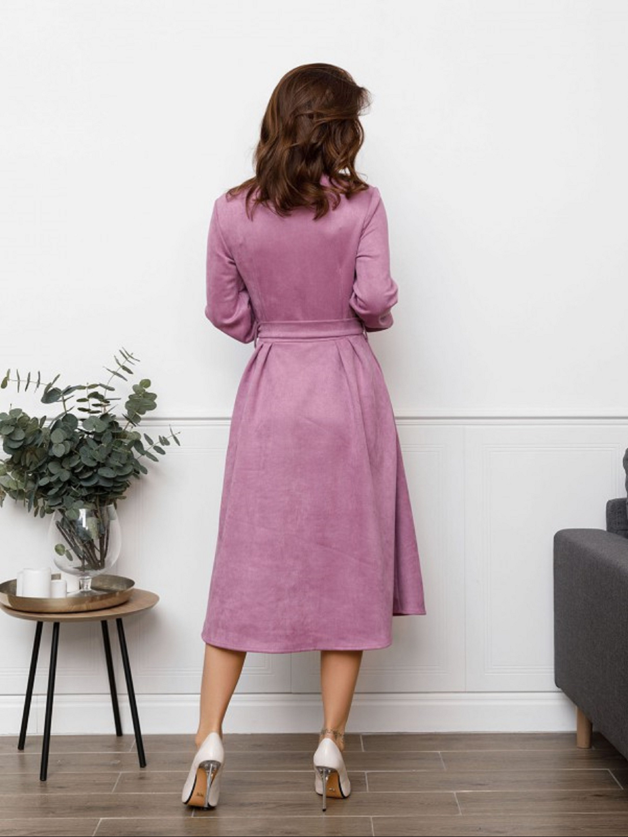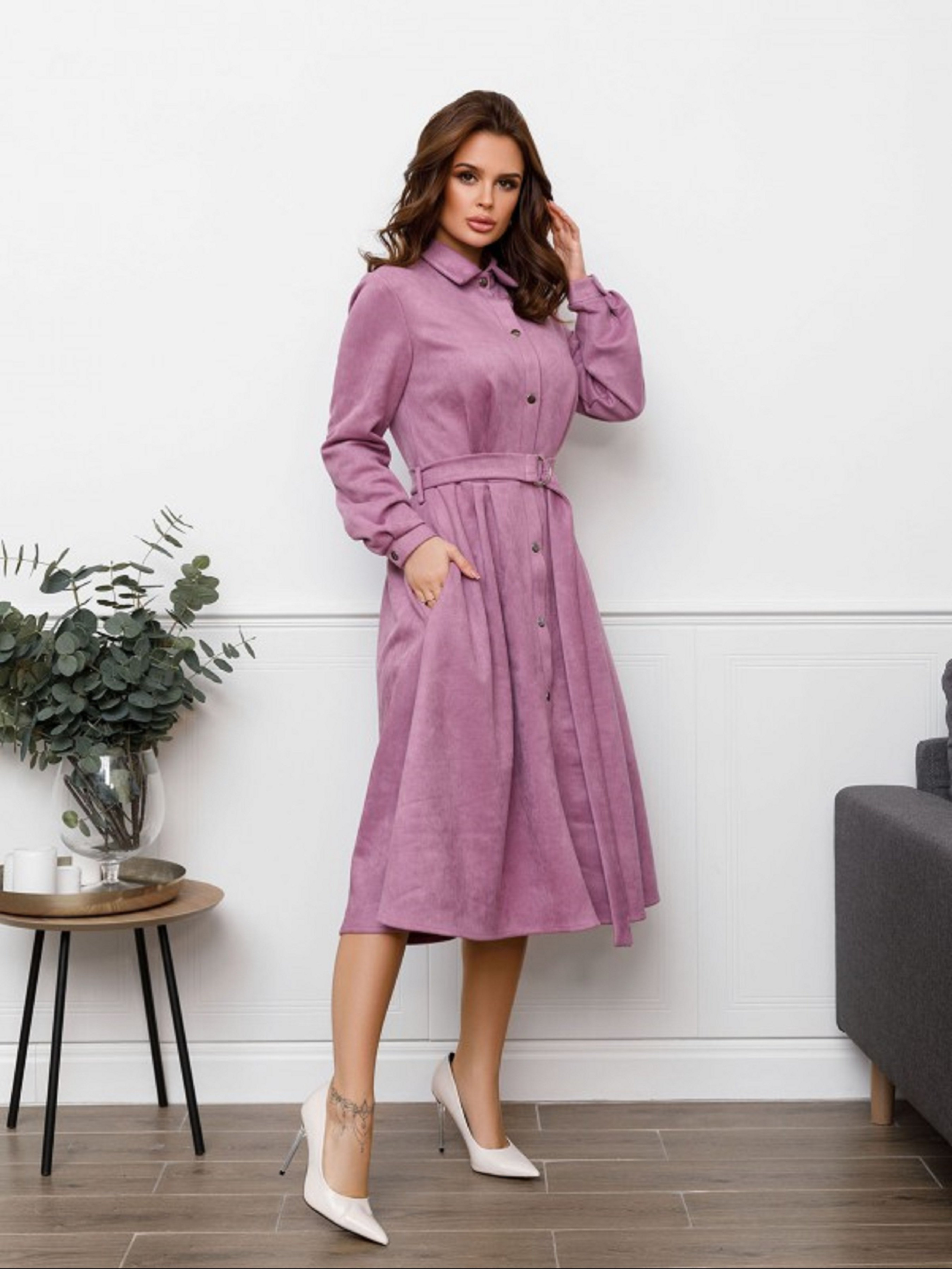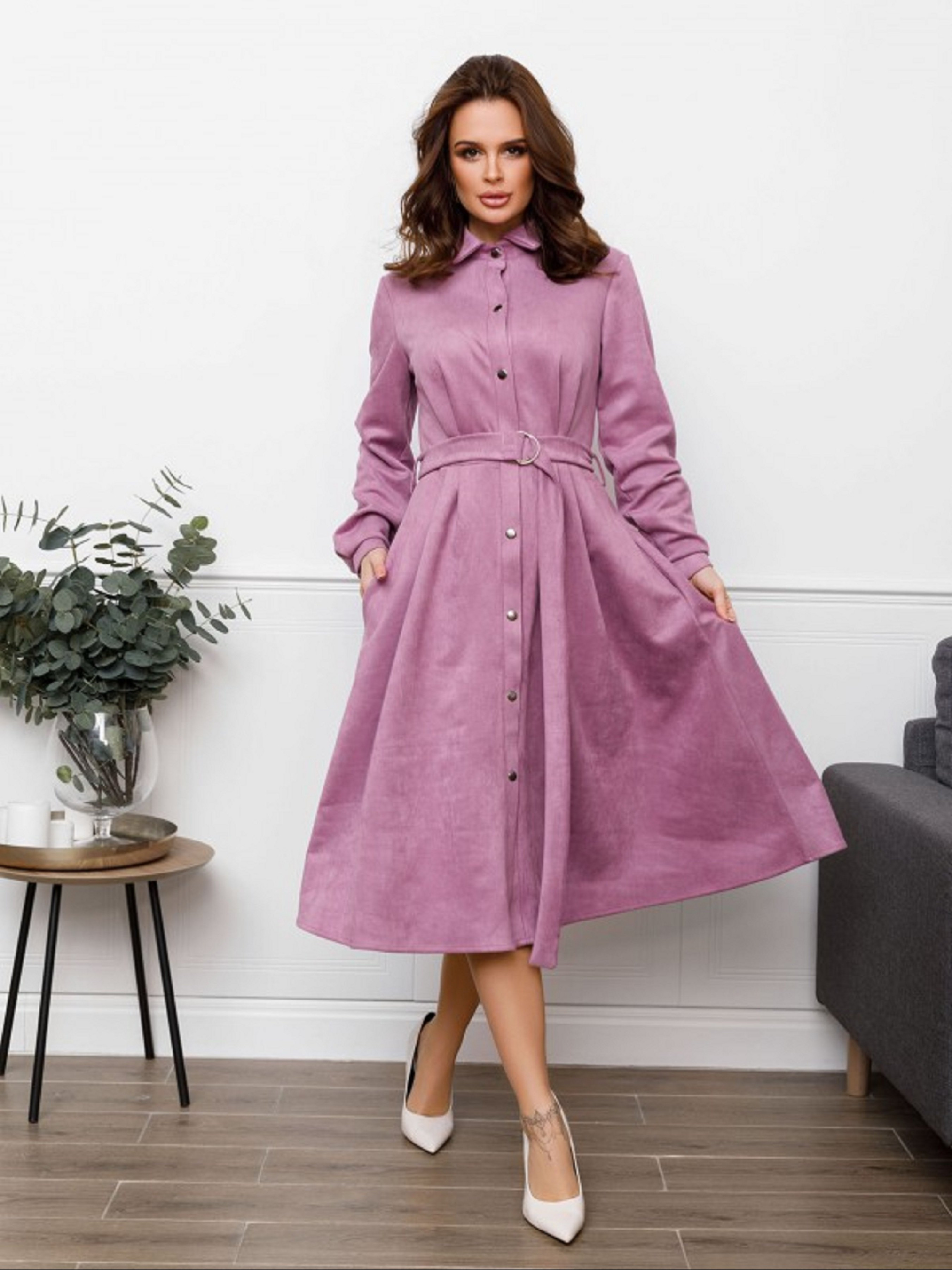 Бузкова демісезонна сукня-сорочка з приємної до тіла еко-замші з застібками-кнопками. Модель з коміром оснащена довгими рукавами з манжетами і збірками на талії. Модель міді довжини з розкльошеною спідницею і кишенями. Сукню оснащено знімним поясом в тон з пряжкою. Напівобхват: Груди: S (44), M (46), L (48), XL (50), Талія: S (34), M (36), L (38), XL (40), Стегна: S ( 57), M(59), L(61), XL(63), Довжина виробу - 110, Рукав - 60, Тканина: Середньої еластичності.