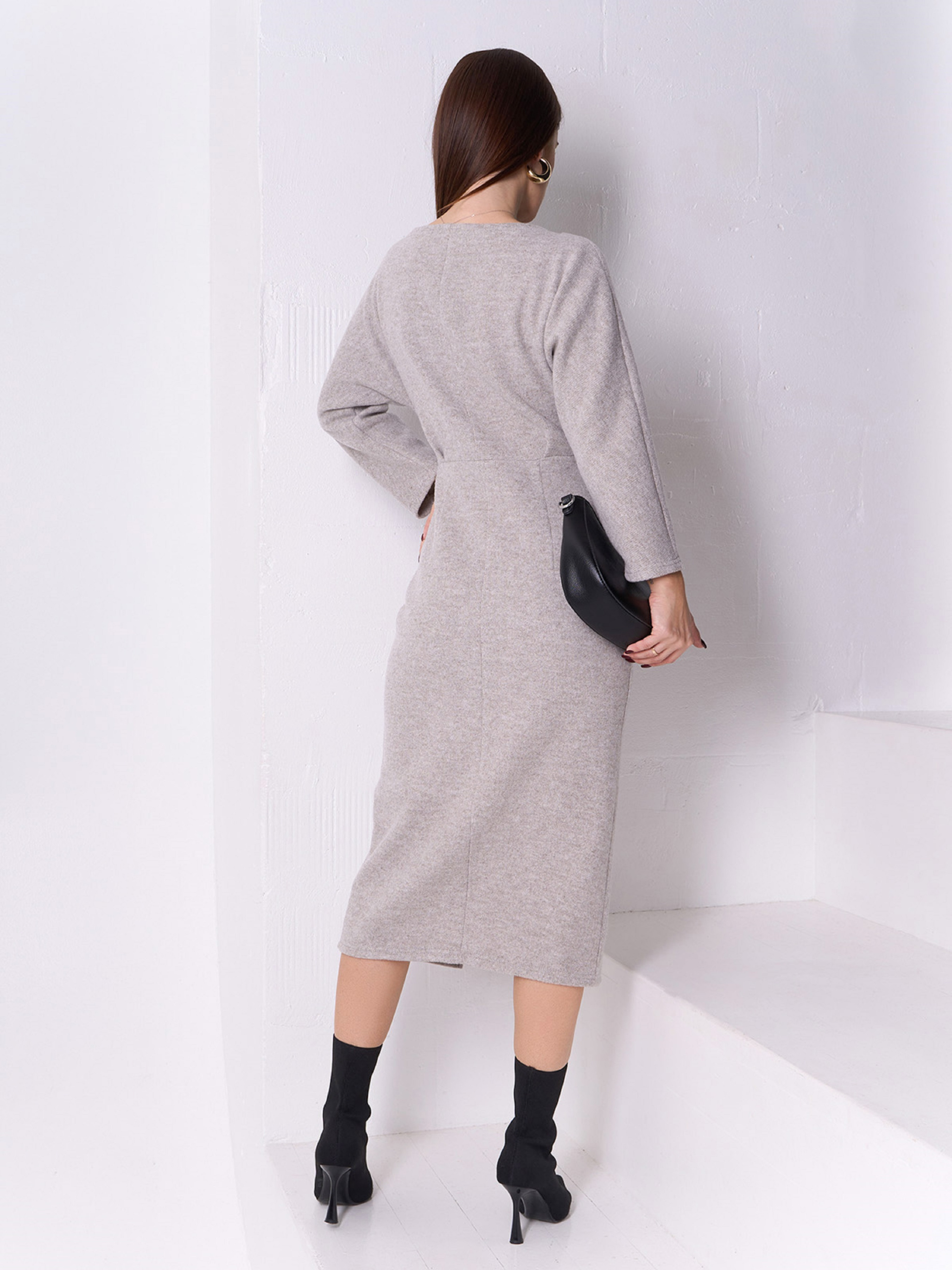 Утеплена темно-бежева сукня-олівець з вовняної ангори. Модель міді довжини з довгими рукавами і проймою кажана. Сукня облягаючого крою з розрізом спереду та бічною блискавкою. Напівобхват: Груди: S (44), M (46), L (48), XL (50), Талія: S (34), M (36), L (38), XL (40), Стегна: S ( 44), M(46), L(48), XL(50), Довжина виробу - 112, Рукав - 38, Тканина: Середньої еластичності.