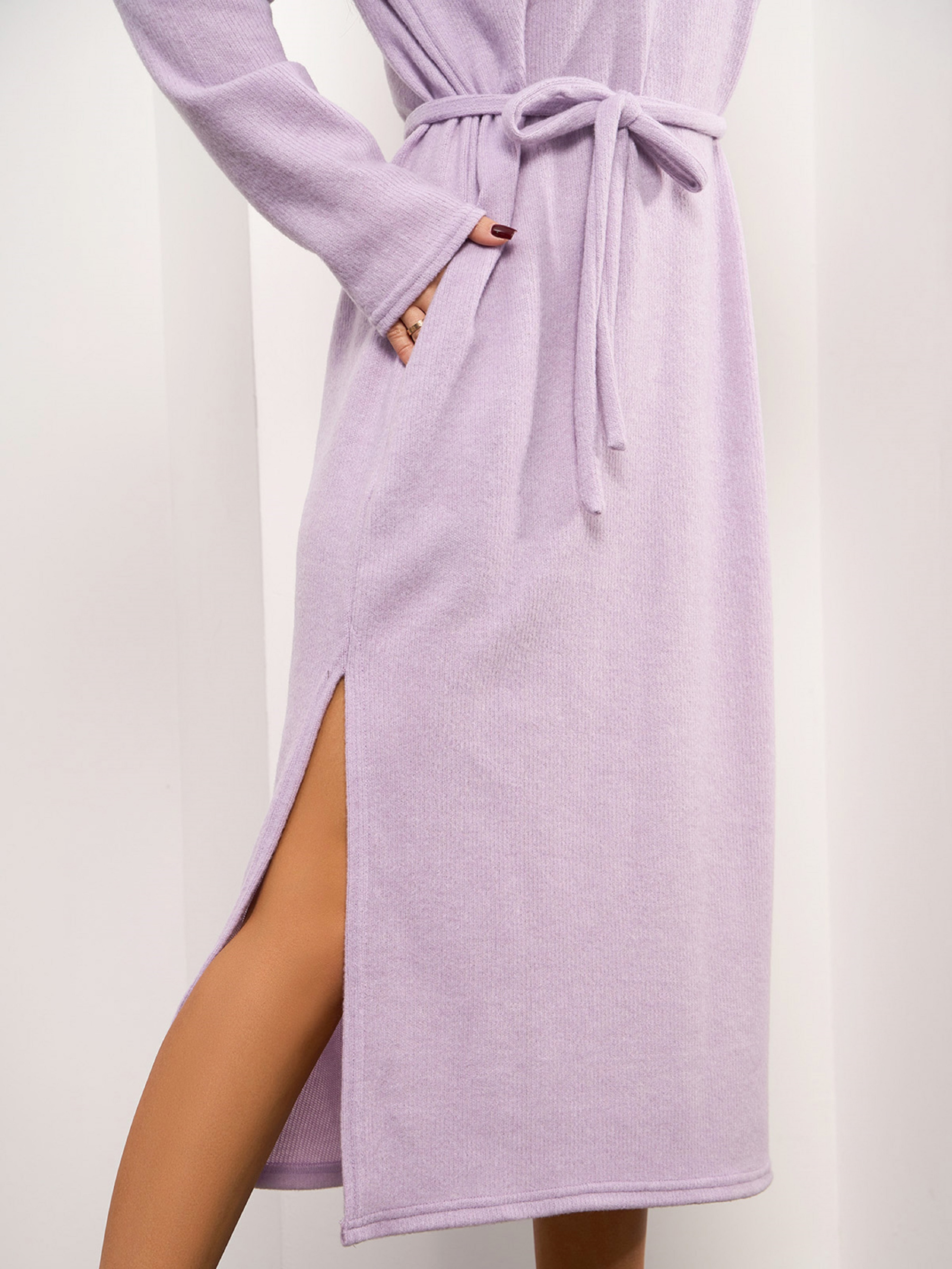 Повсякденне плаття-гольф з міді довжиною та довгими рукавами, виконане з бузкового ангорового трикотажу. Виріб прямого крою, оснащений високим коміром із підворотом. Сукня з бічними розрізами, кишенями та знімним пояском. Напівобхват: Груди: S (49), M (51), L (53), XL (55), Талія: S (49), M (51), L (53), XL (55), Стегна: S ( 51), M (53), L (55), XL (57), Довжина виробу - 115, Рукав - 61, Тканина: Висока еластичність.