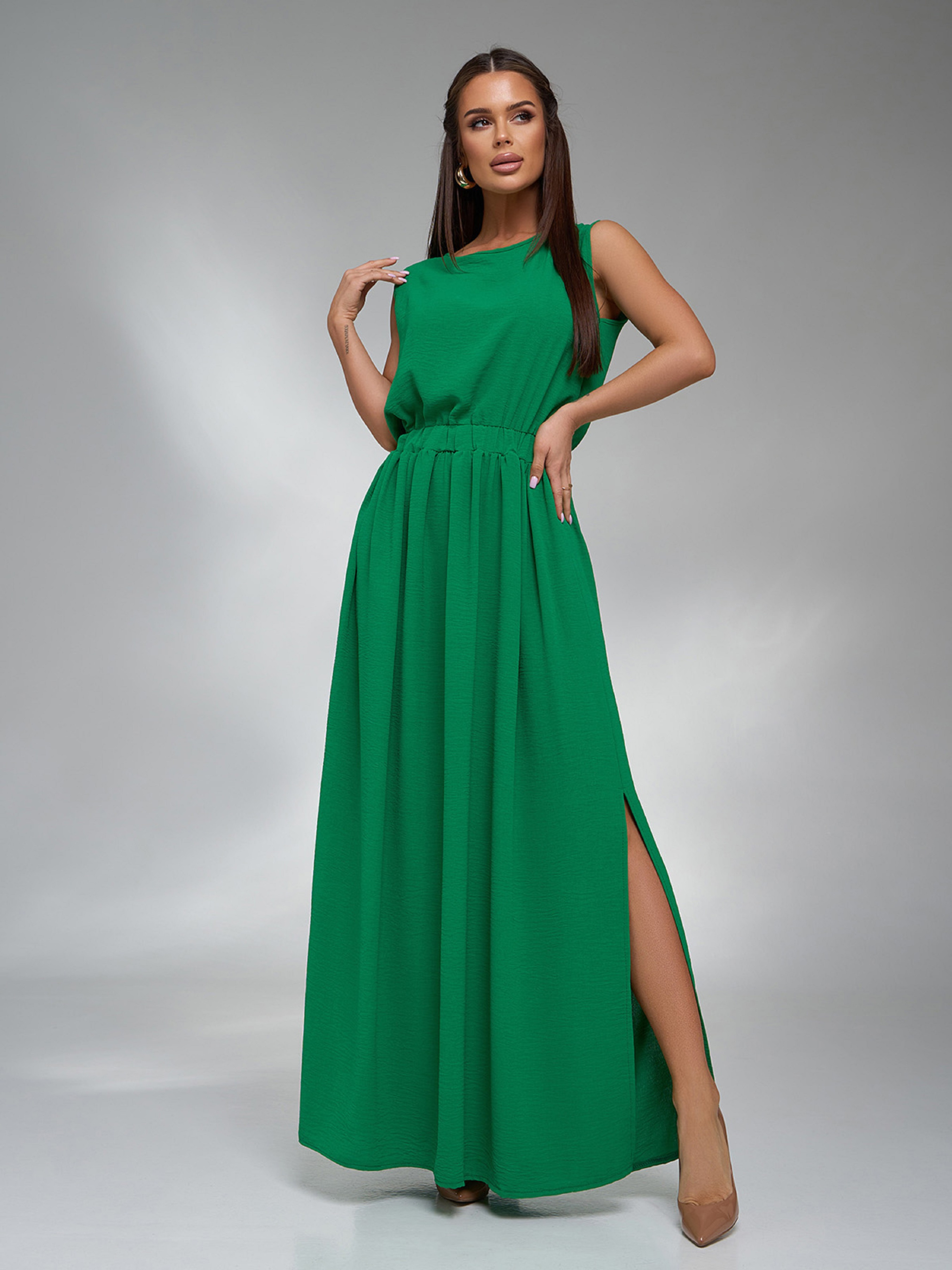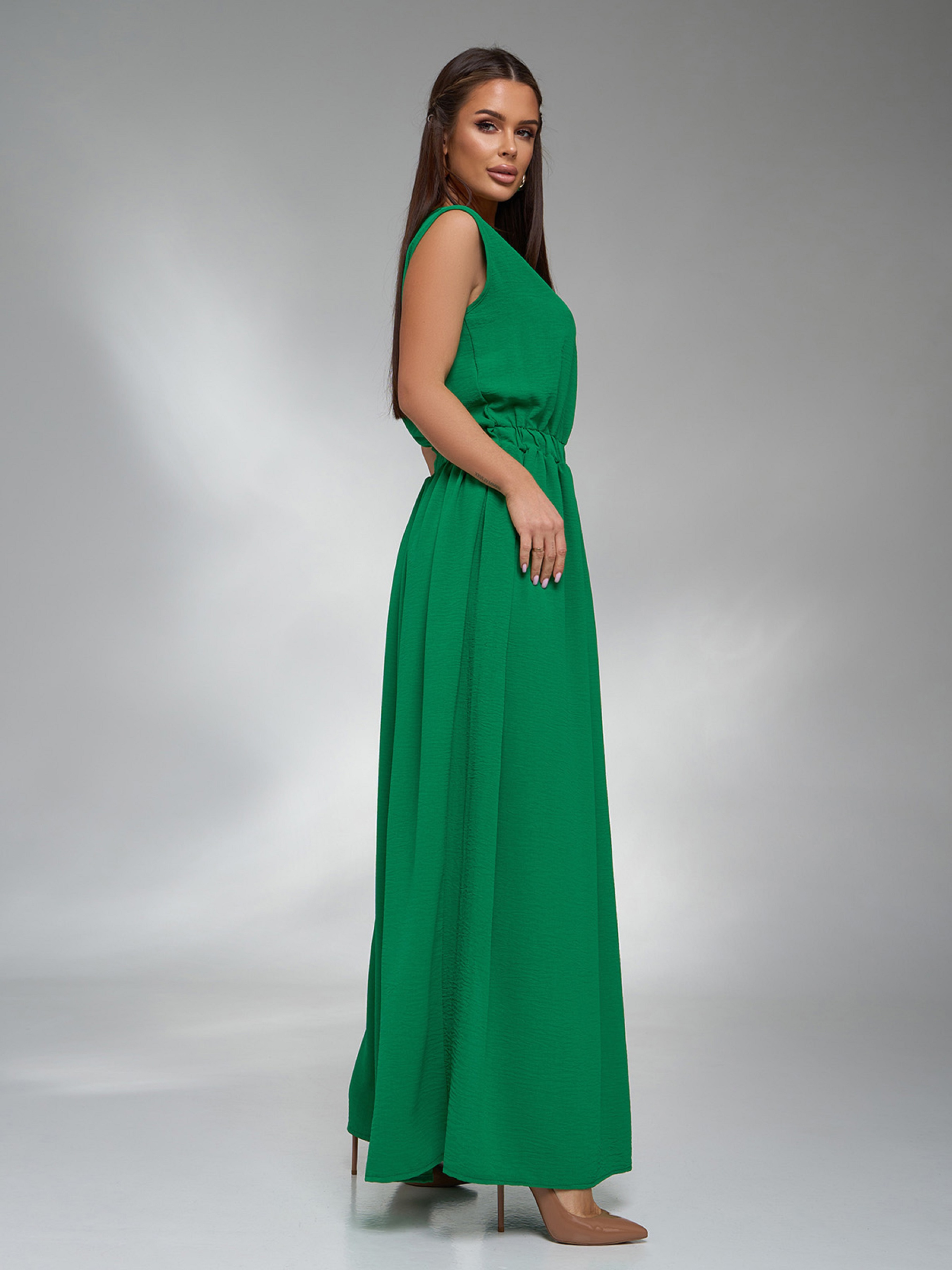 Зелений літній сарафан без рукавів, виготовлений з однотонного крепу. Модель з еластичною гумкою на талії і довгим розкльошеним низом з бічним розрізом. Сукня з напівкруглою горловиною та максі довжиною. Напівобхват: Груди: S (46), M (48), L (50), XL (53), XXL (54), 3XL (57); Талія: S (31-44), M (33-44), L (35-49), XL (37-51), XXL (38-56), 3XL (40-57); Стегна: S (72), M (73), L (76), XL (79), XXL (81), 3XL (83); Довжина виробу - 140; Тканина: Низької еластичності. Склад: 59% поліестер, 21% еластан, 20% бавовна
