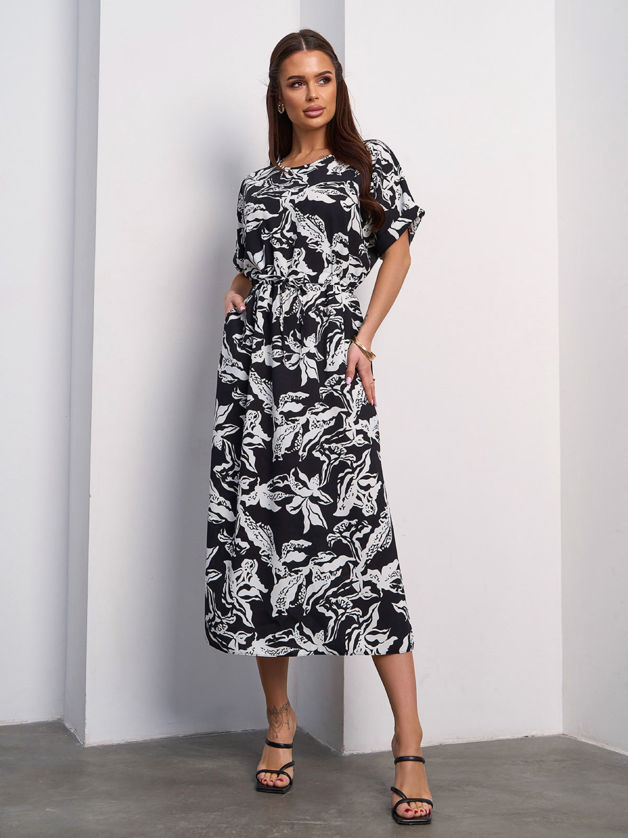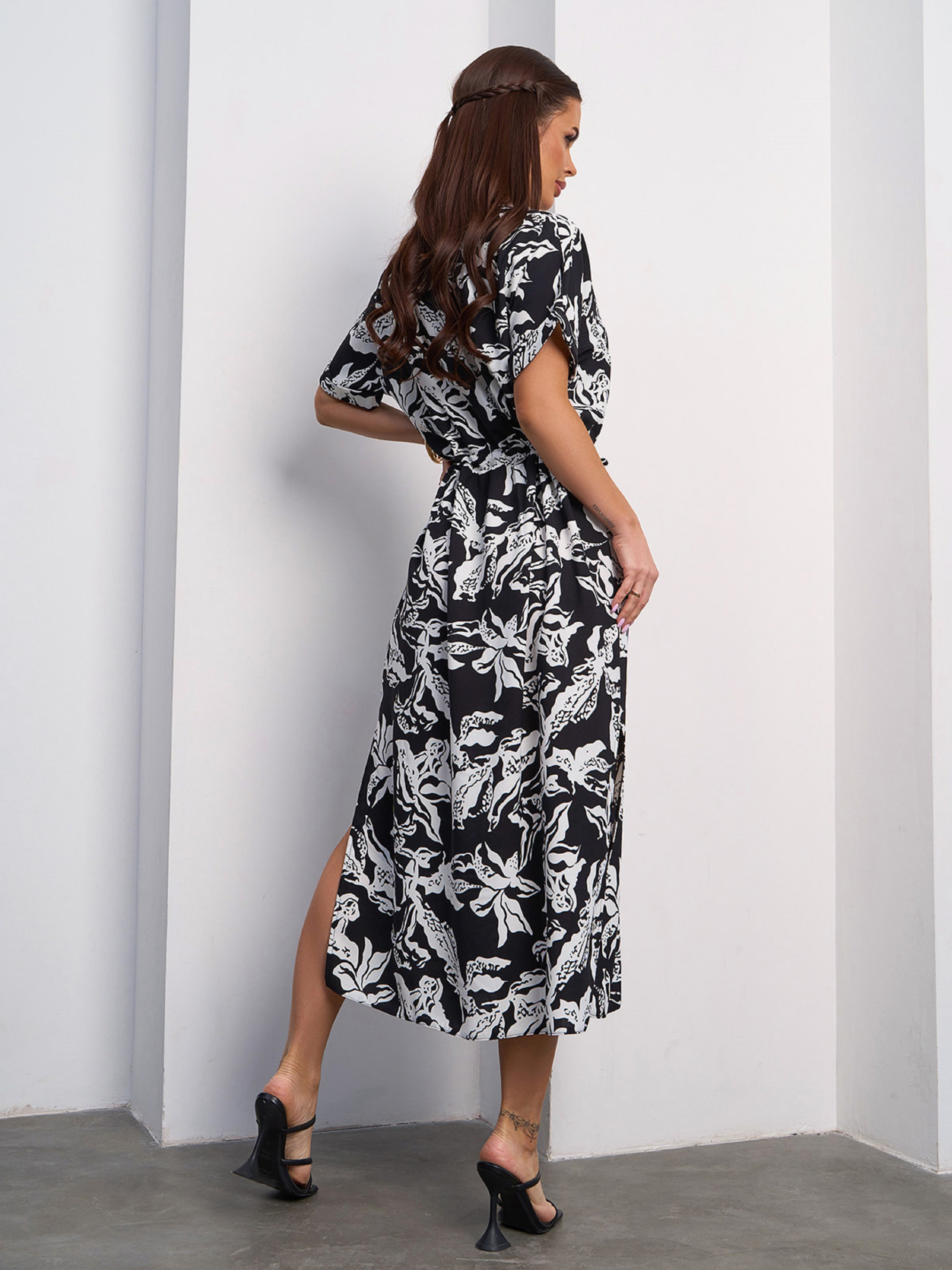 Чорно-біле лляне плаття з принтом і міді довжиною. Сукня приталена куліскою та декорована двома бічними розрізами. Модель з кишенями та короткими цільнокройними рукавами пройми кажан. Напівобхват: Груди: S (54), M (56), L (58), XL (60), XXL (62); Талія: S (50), M (52), L (54), XL (56), XXL (59); Стегна: S (59), M (60), L (63), XL (65), XXL (68); Довжина виробу - 119; Рукав - 12; Тканина: Низької еластичності. Склад: 65% льон, 20% бавовна, 15% поліестер