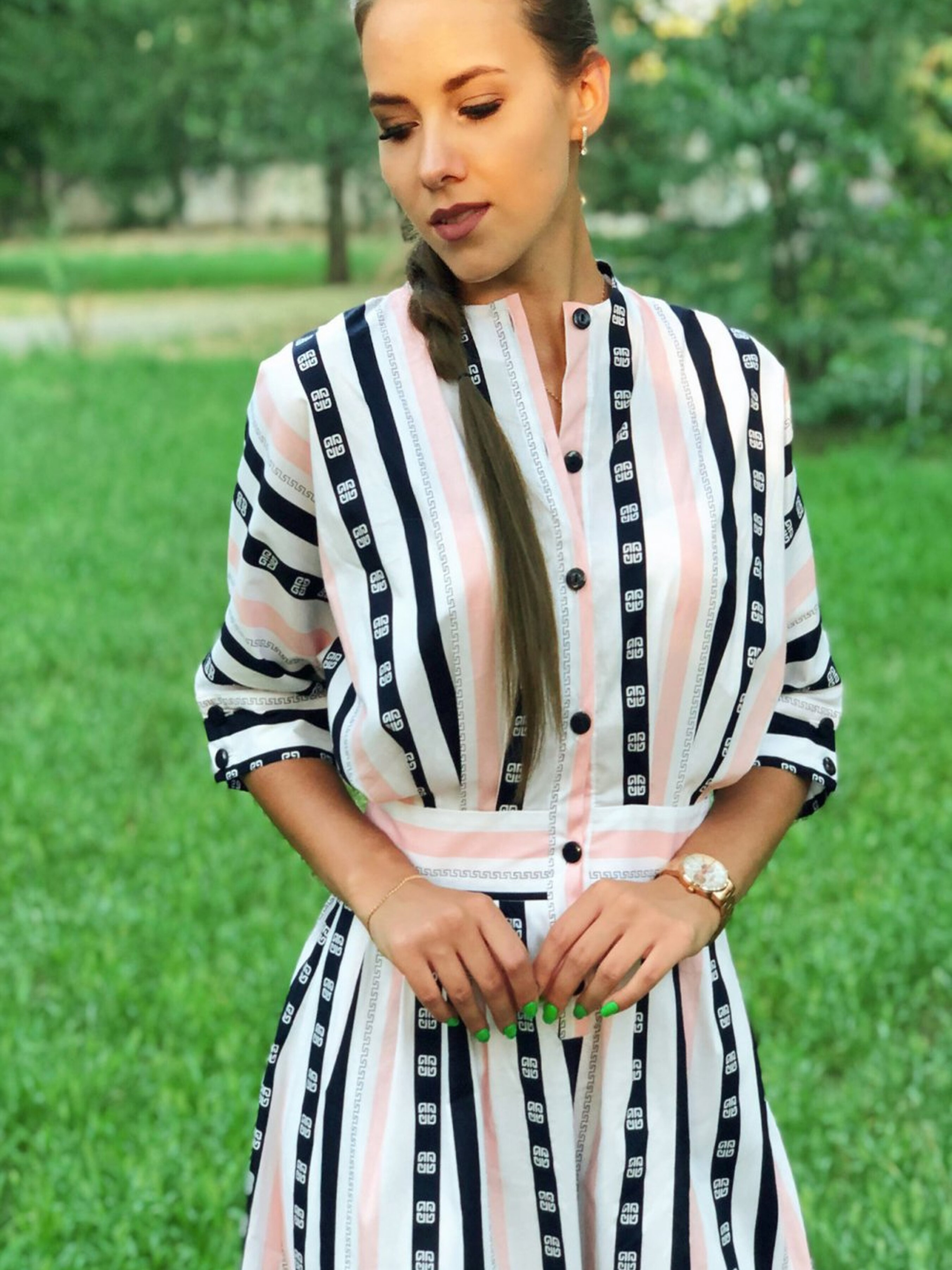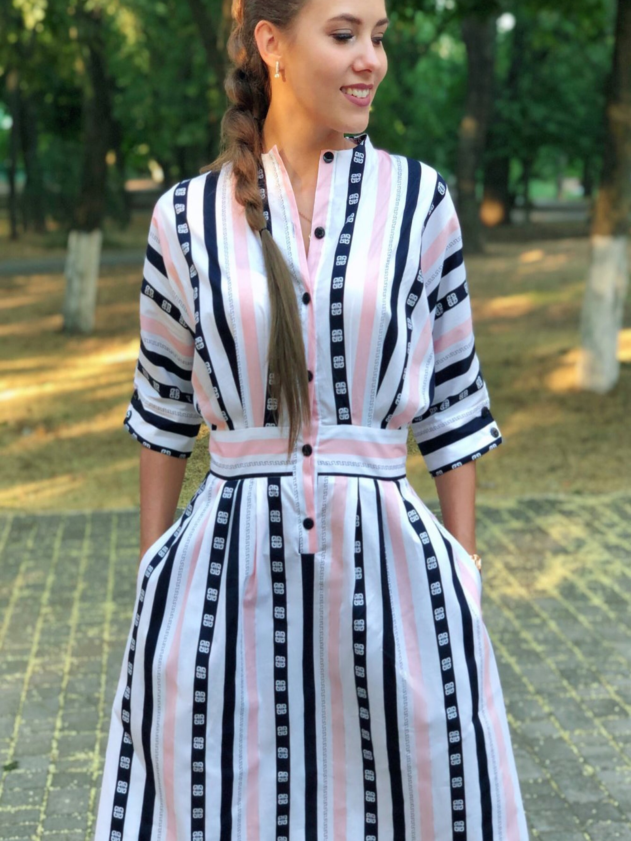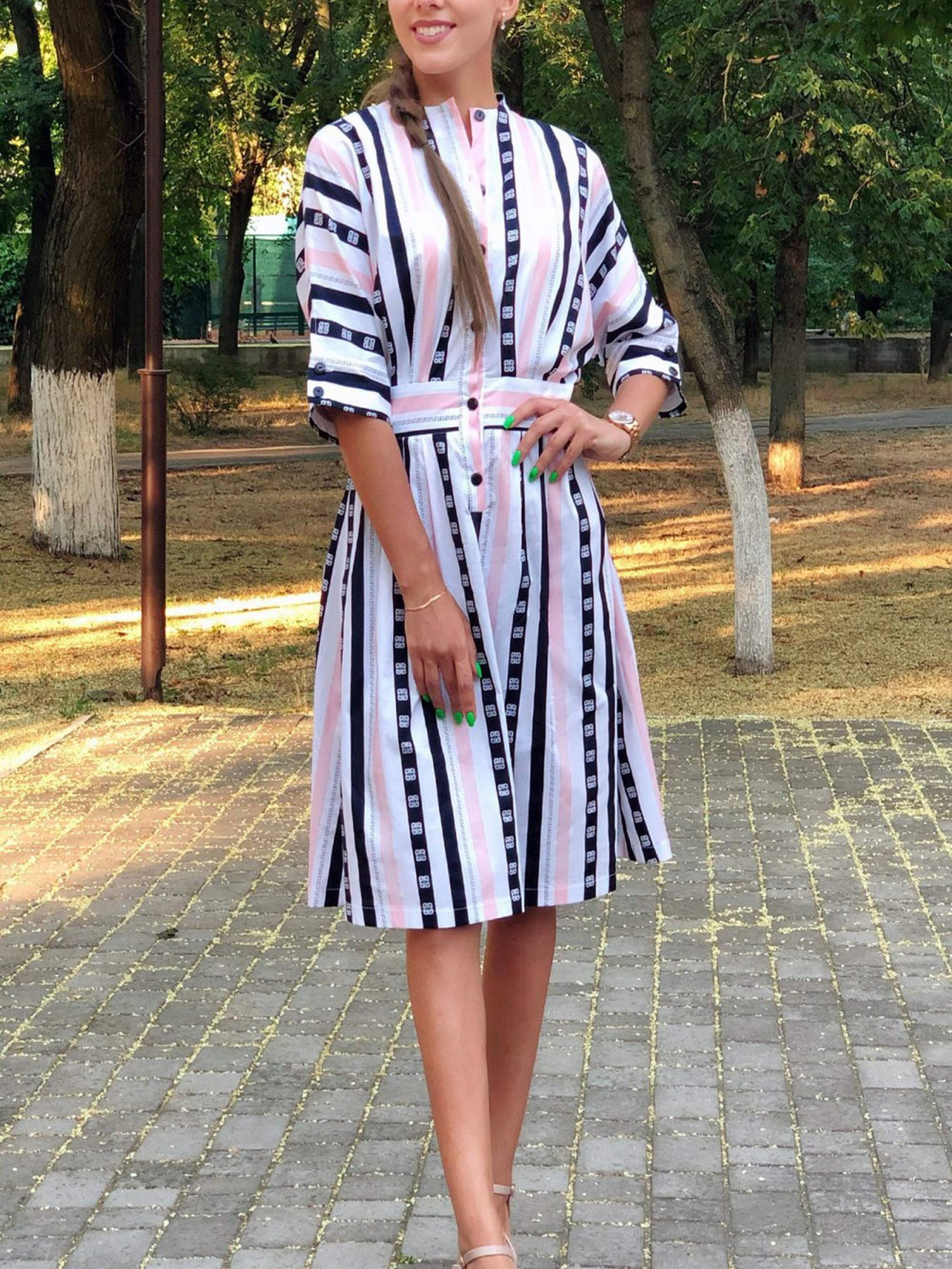 Літня сукня у рожево-синю смужку — це легкий і стильний варіант для спекотних днів, який поєднує елементи класичного дизайну та сучасних тенденцій. Вона ідеально підходить для весняно-літнього сезону, забезпечуючи комфорт і свіжість, а також надаючи образу яскравості та елегантності. Основні характеристики: Колір та принт: Рожево-синя смужка створює динамічний і вишуканий вигляд, додаючи сукні свіжості та легкості, що робить її ідеальним варіантом для літніх прогулянок і романтичних вечорів. Крої: Сукня має складки, які надають об'єму та динаміки, підкреслюючи витончені лінії тіла, але при цьому не обмежуючи рухів. Застібка: Без застібки і пояса, сукня створює вільний і невимушений образ, що додає ще більше комфорту та легкості при носці. Ґудзики: Оригінальні ґудзики вдало поєднуються з загальним дизайном, додаючи акцент на деталі, але не перевантажуючи образ. Переваги: Легкість і комфорт завдяки відсутності застібок і пояса. Яскравий і універсальний принт, який чудово підходить для літнього гардеробу. Легко комбінується з різними аксесуарами, такими як капелюшки, сумки та сандалі. Складки надають об'єму і підкреслюють легкість сукні, створюючи елегантний силует. Ідеальна для повсякденних прогулянок, літніх зустрічей або романтичних вечорів на свіжому повітрі. Як стилізувати: Сукня чудово виглядає з легкими сандалями або пляжними туфлями. Для більш офіційного образу її можна доповнити стильними аксесуарами та елегантними сандалями. Простий макіяж і розпущене волосся зроблять образ завершеним і стильним. Літня сукня у рожево-синю смужку — це чудовий вибір для тих, хто хоче залишатися стильним і комфортним у спекотну погоду, поєднуючи сучасний дизайн із класичними елементами.