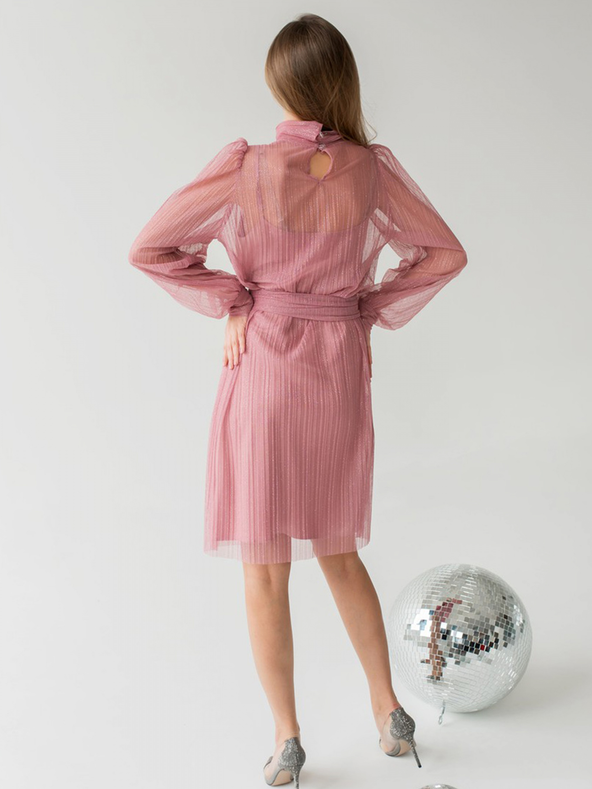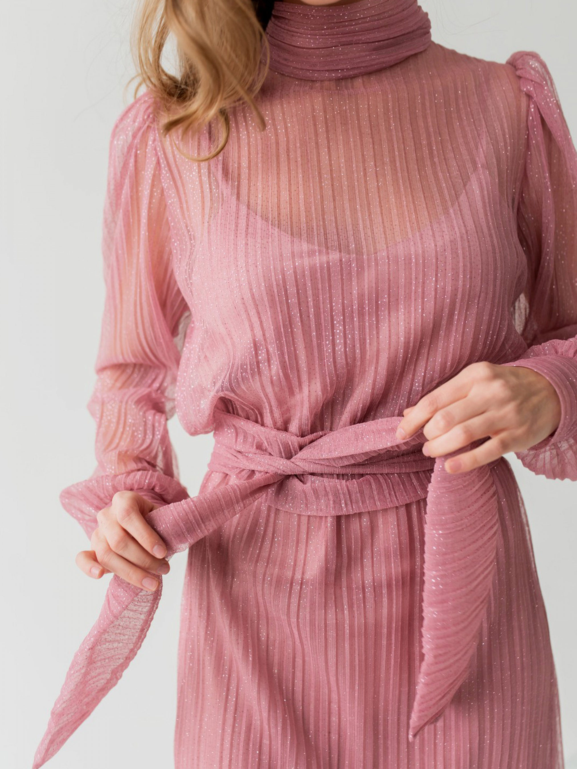 Ошатне плаття прямого силуету; Рукав втічний, широкий, зібраний на манжеті внизу.; Бретели з металевими регуляторами; Пояс із основної тканини в комплекті. Склад: Сукня: поліестер 97%, еластан 3%Сітка: поліестер 100%