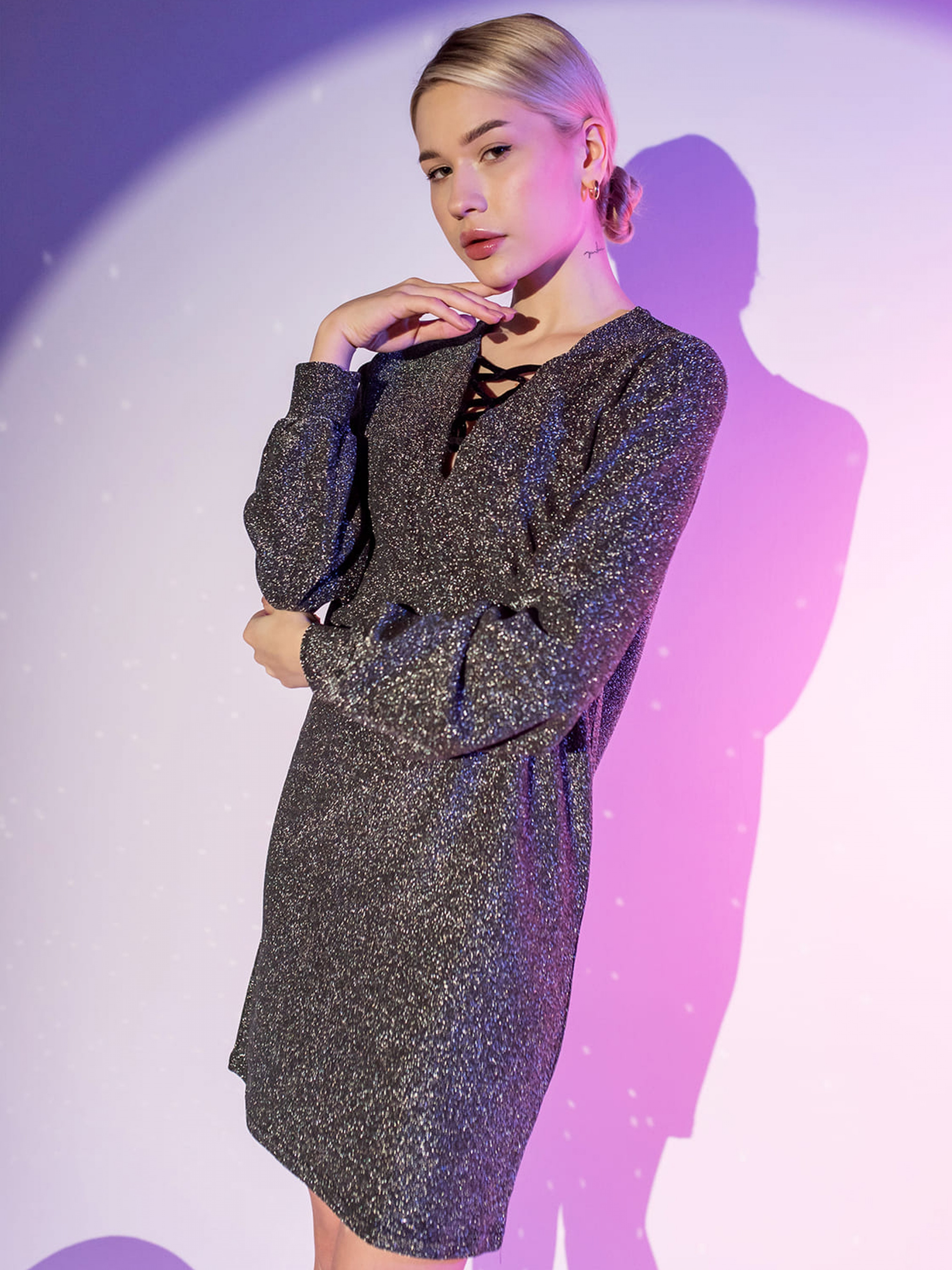 У цій сукні ви точно не залишитеся без уваги; V-подібний виріз зі шнурівкою; Завдяки конструкції та тканині з якої виготовлена сукня, застібка не передбачена; Рукав втачний, розширений та зібраний на широкий манжет; Поличка прямого силуету. Склад: Поліестер 90%, еластан 10%