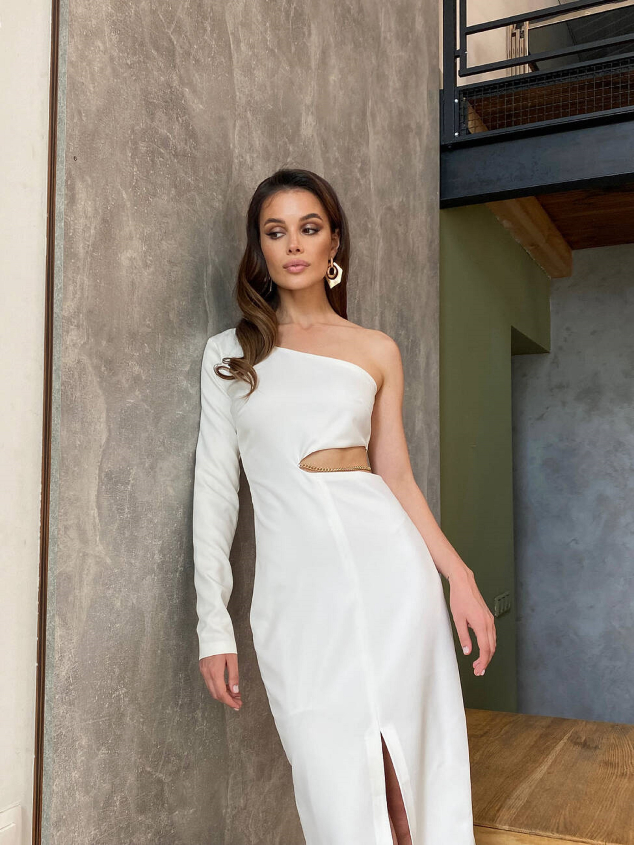 Особливості і переваги: Асиметричне декольте підкреслює лінію плечей; Витончений виріз по талії додає образу пікантності; Глибокий розріз спереду створює ефектний і жіночний силует; Матеріал – костюмна тканина LUX, приємна на дотик і легко підтримує форму; Практична у догляді: машинне делікатне прання при 30°; Легко комбінується з будь-яким взуттям і аксесуарами для вечірнього або святкового образу. Характеристики: Тканина: костюмна LUX Колір: білий Розмір: S, M Сексуальна сукня з елементами стриманості. Асиметричне декольте, пікантний виріз по талії та глибокий розріз спереду створюють неповторний образ для будь-якої красуні. Особливості та переваги сукні ETOILE: