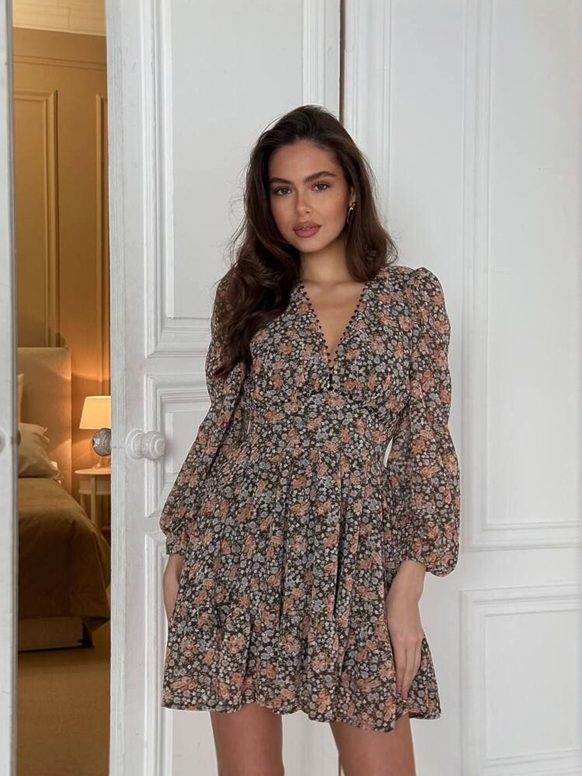 Ніжна та повітряна жіноча сукня VIOLA в дрібні квіти з пишною спідницею створена для легких, романтичних образів. Легка текстура шифону красиво лягає по фігурі, а V-подібне декольте підкреслює жіночність. Талія має елегантний ефект утяжки, а ззаду комфортно тримається завдяки еластичній резинці. Пишна трирівнева спідниця надає силуету легкості та об’єму, створюючи ефект ніжного руху під час ходьби. Широкі манжети прикрашені ґудзиками, обтягнутими в тканину — вишуканий акцент, що додає сукні преміального вигляду. Характеристики Тканина: шифон люксової якості Підкладка: бавовна Декольте: V-подібне Талія: утяжка + резинка по спинці Рукав: довгий із широкими манжетами Декор манжетів: ґудзики, обтягнуті в тканину Спідниця: трирівнева, пишна Візерунок: дрібні квіти Як носити Ця сукня в дрібні квіти з пишною спідницею ідеально доповнить як повсякденні, так і святкові образи. Комбінуйте з босоніжками чи балетками для ніжного аутфіту або з високими чоботами — для стильного осіннього настрою. Легкий кардиган або укорочений жакет стане чудовим завершенням образу.