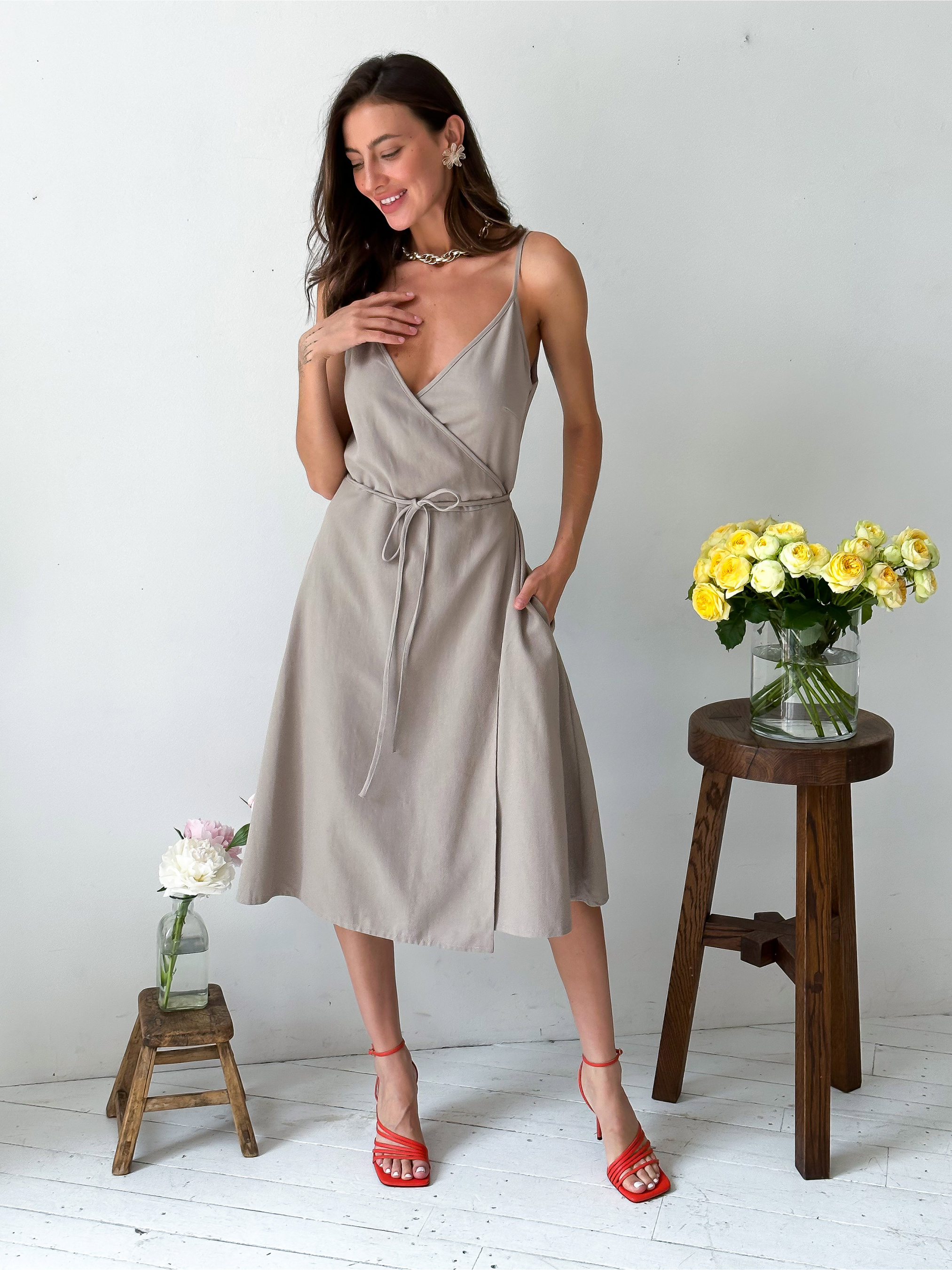 Жіноче літнє плаття з натуральної тканини на запах. Тканина дихаюча, гіпоалергенна, не електризується. Склад тканини: 88% бавовна, 12% льон. Виробник: Украiна. Даний фасон літнього плаття зручний і не обмежує рухів, добре виглядає на будь-якій фігурі.
