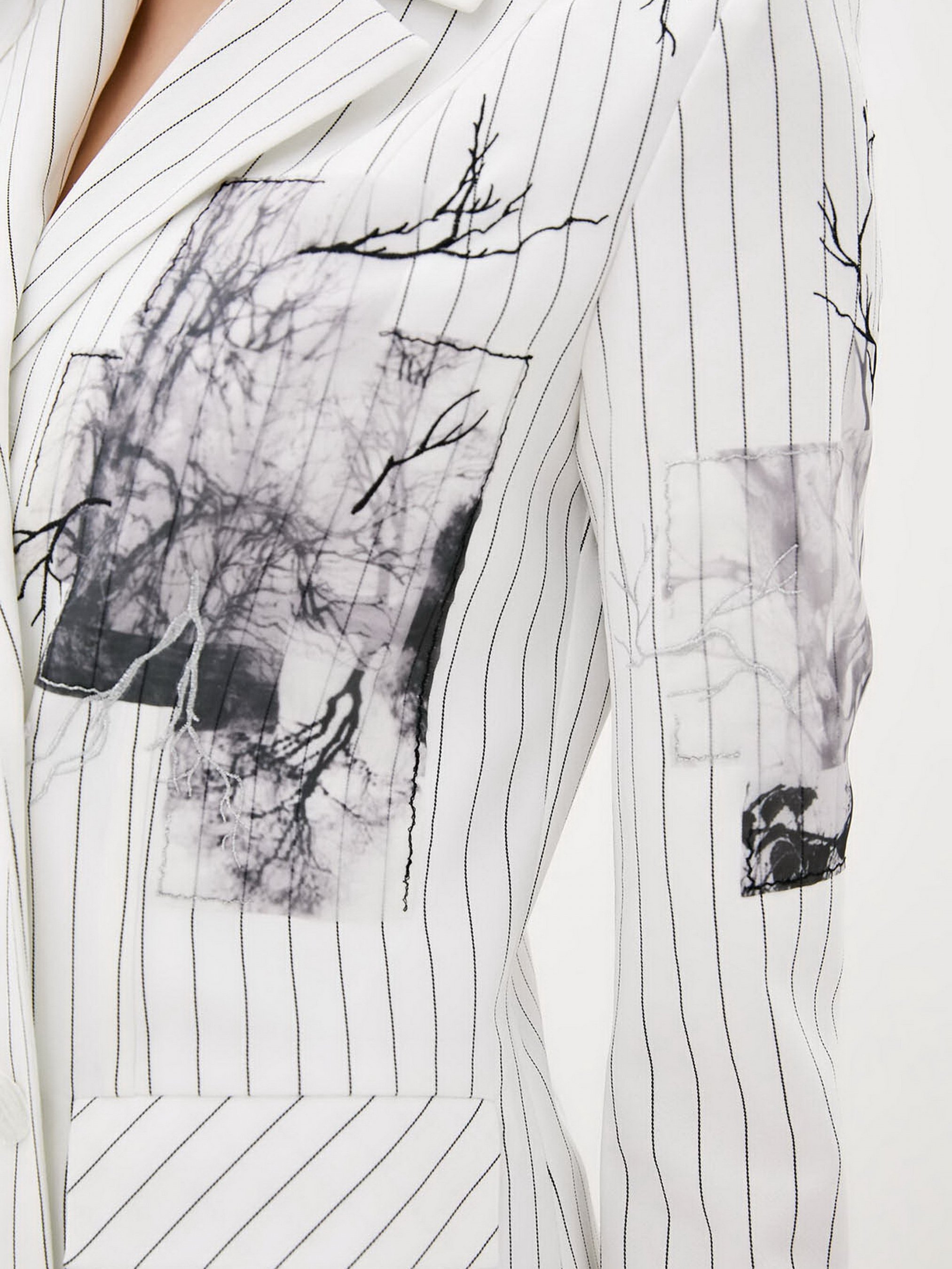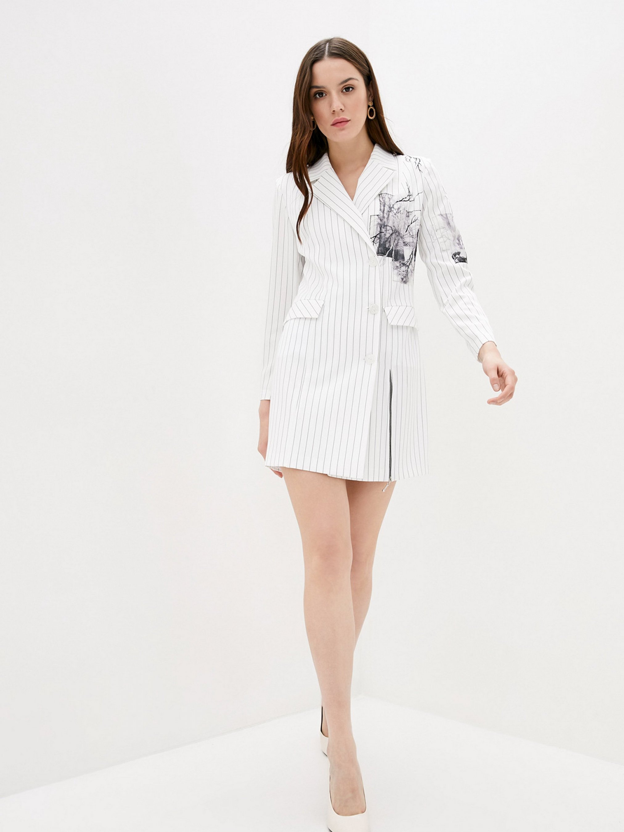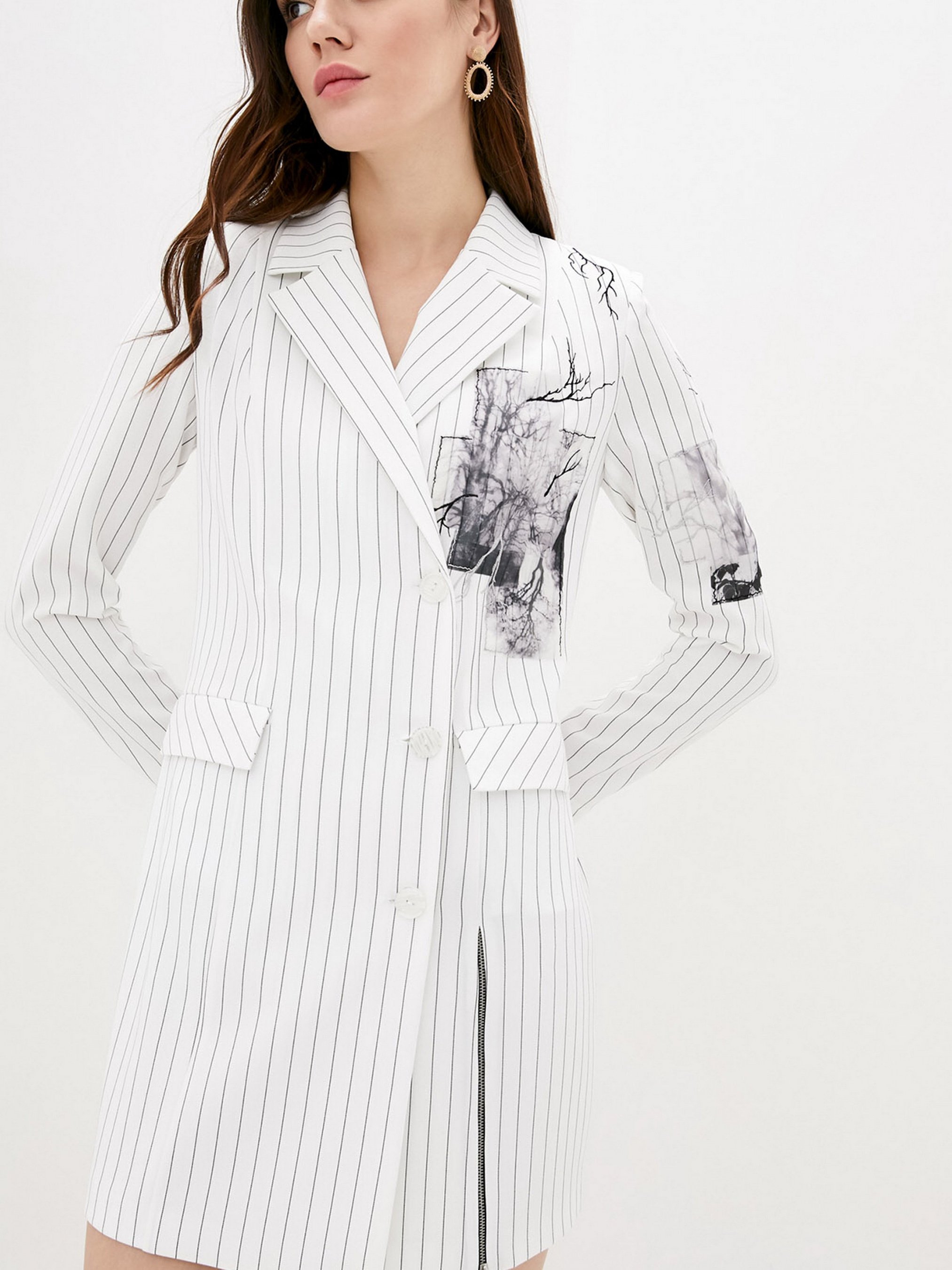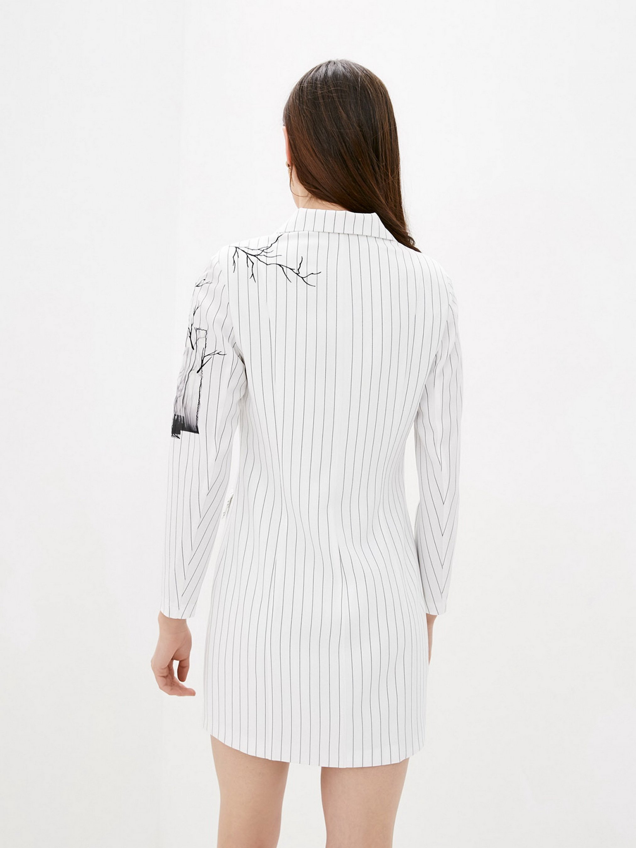 Сукня-піджак у стильну смужку на підплічниках. Класичний крій подовженого піджака на підкладці та відкладний комір з лацканами. Модель на запах фіксується на ряд гудзиків збоку. Декором виступає стилізована нашивка з 3D тканини та вишивка. Накладні функціональні кишені. Виріз по нозі можна застебнути на блискавку. Склад: polyester 70%, cotton 20%, elastane 10%. Параметри розмірів: Об'єм грудей: XS - 84; S - 88; М - 92; L - 96; XL - 100. Об'єм талії: XS - 64; S - 68; М - 72; L - 76; XL - 80. Об'єм стегон: XS - 92; S - 96; М - 100; L - 104; XL - 108. Розмір на моделі S.