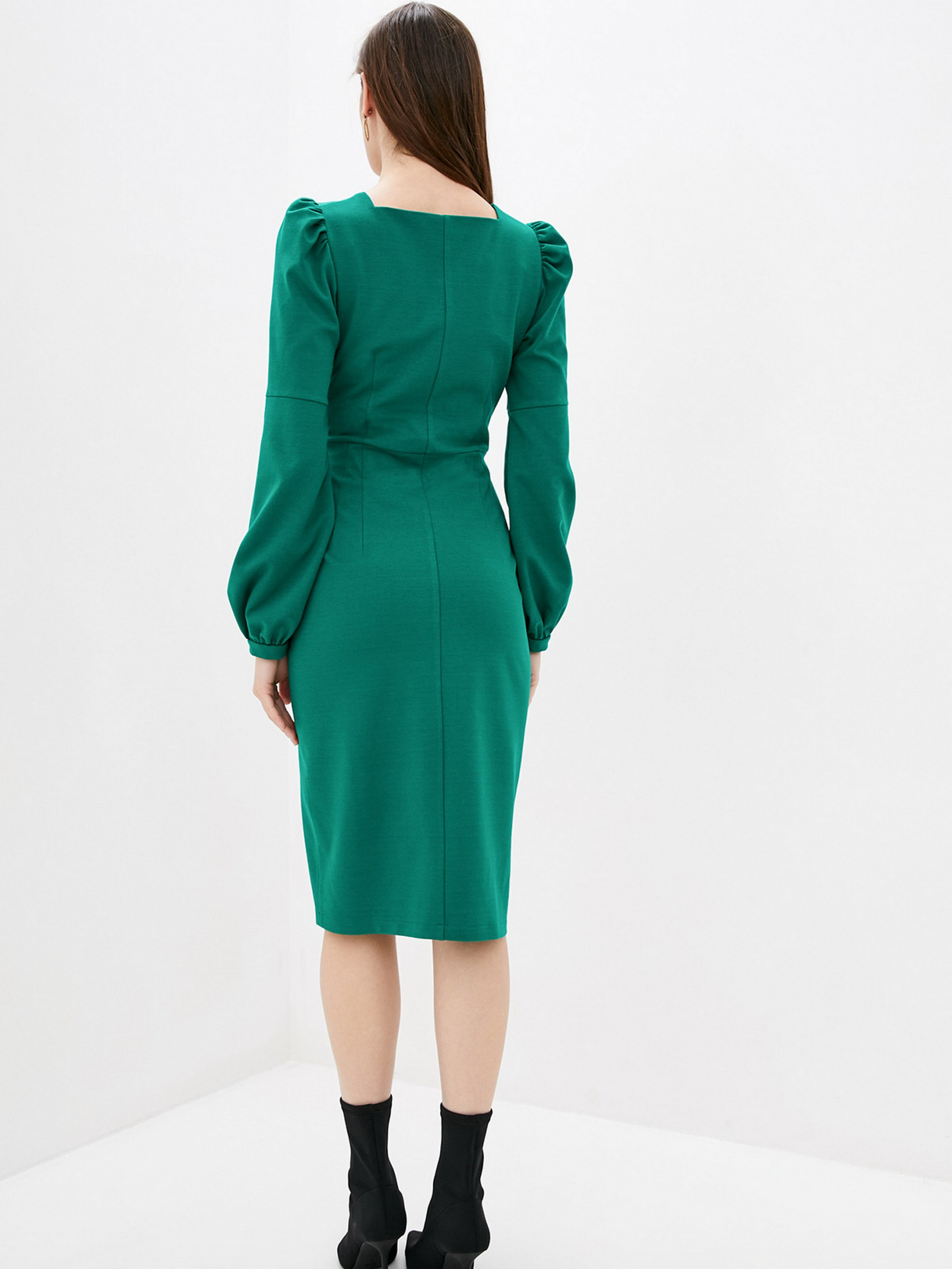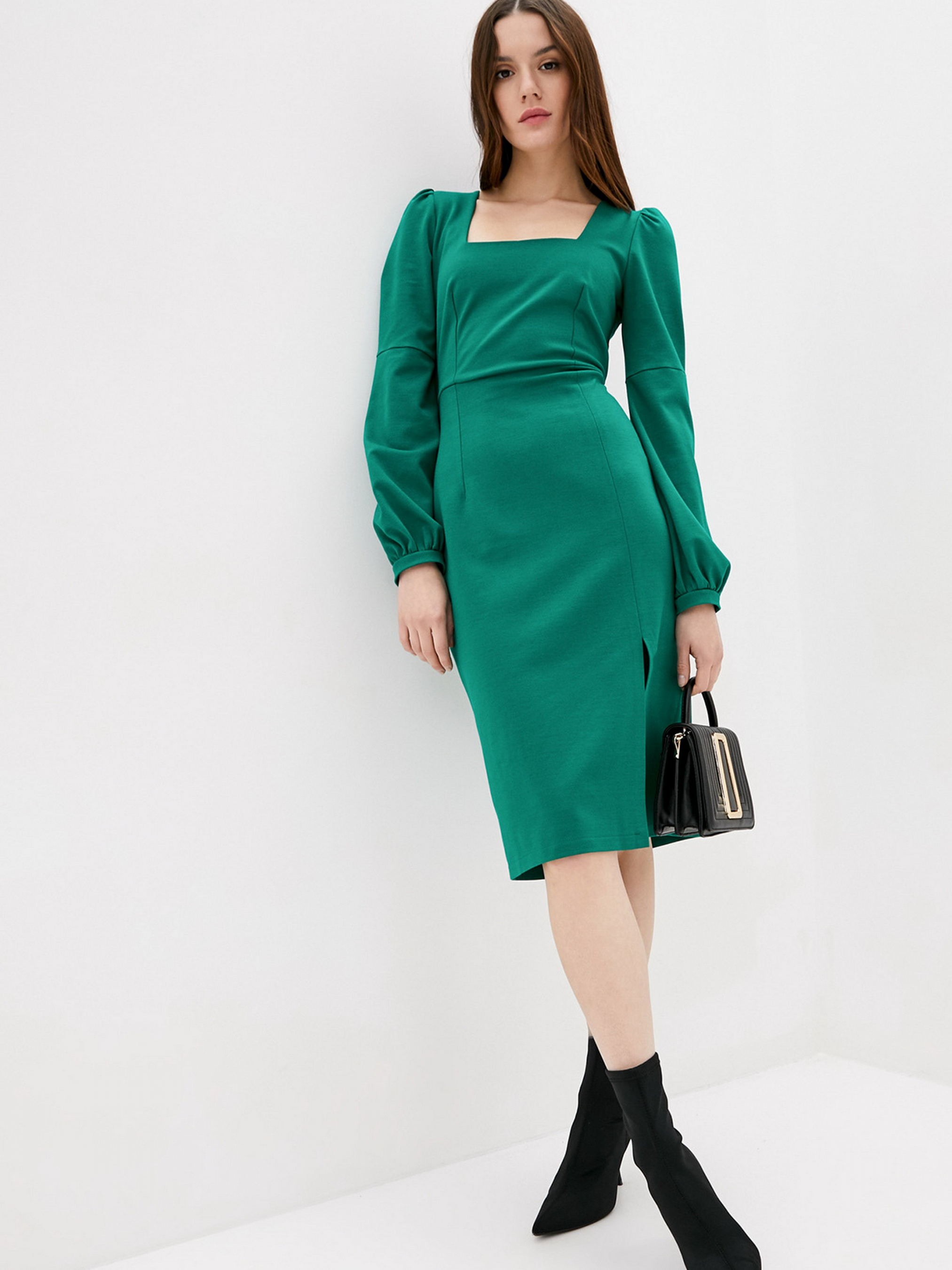 Сукня міді з ефектним вирізом по нозі. Прилеглий силует та вертикальні виточки забезпечать ідеальну посадку по фігурі. Красивий втачний рукав з піднятою лінією плечей та акуратними манжетами. Відкрита зона декольте з квадратним вирізом та завищена талія. Ззаду фіксується на блискавку. Склад: polyester 65%, viscose 30%, acrylic 5%. Параметри розмірів: