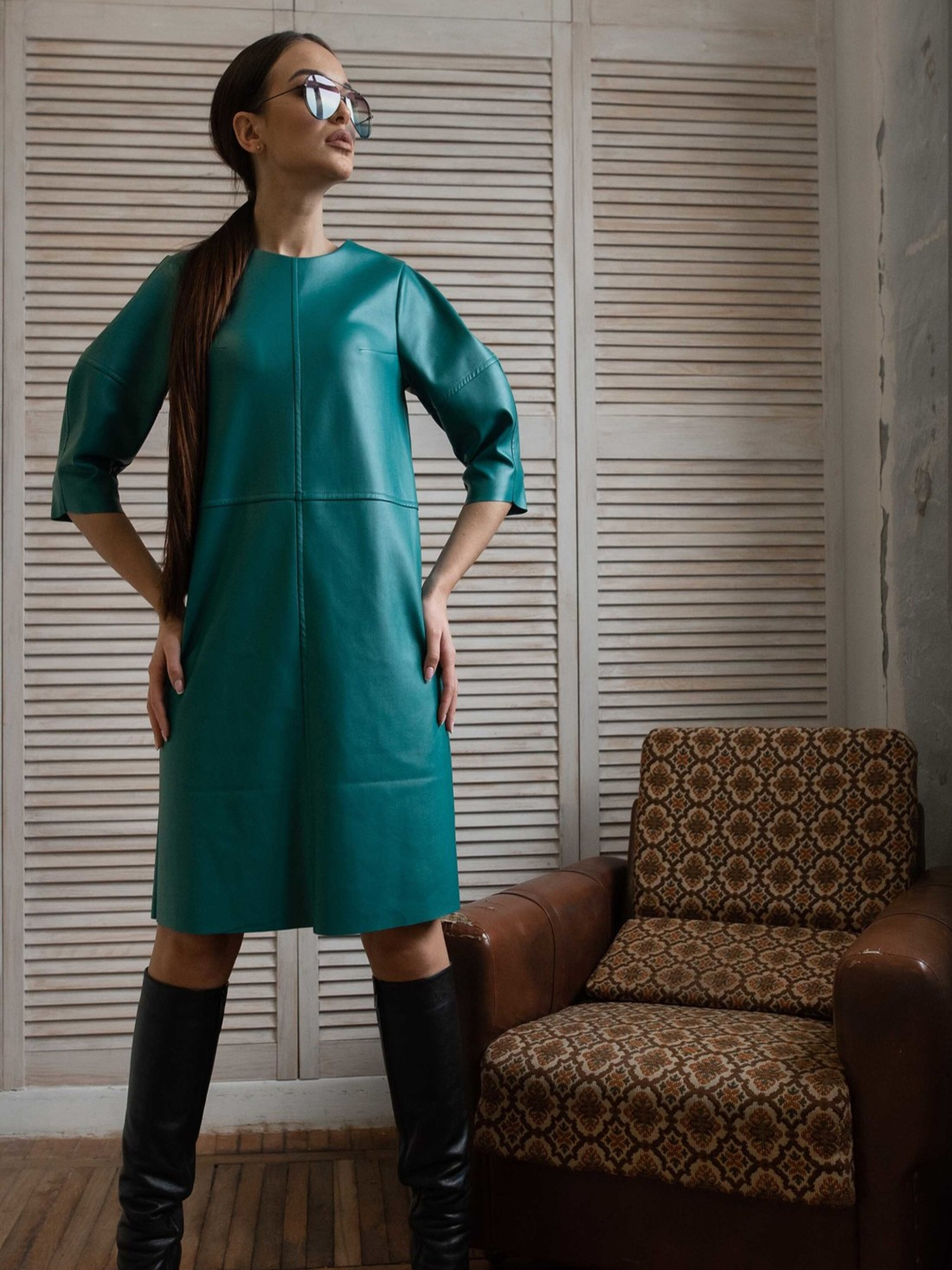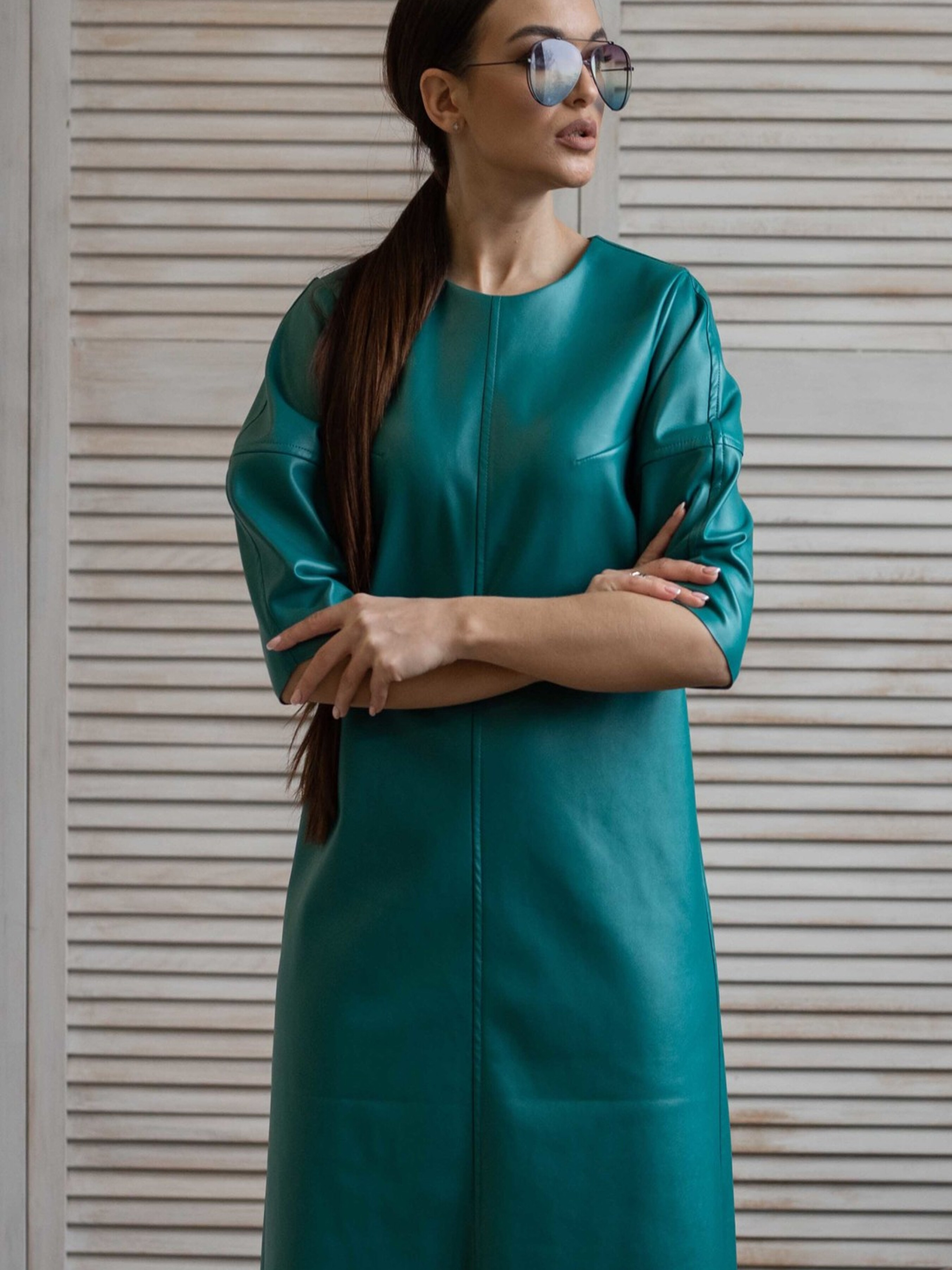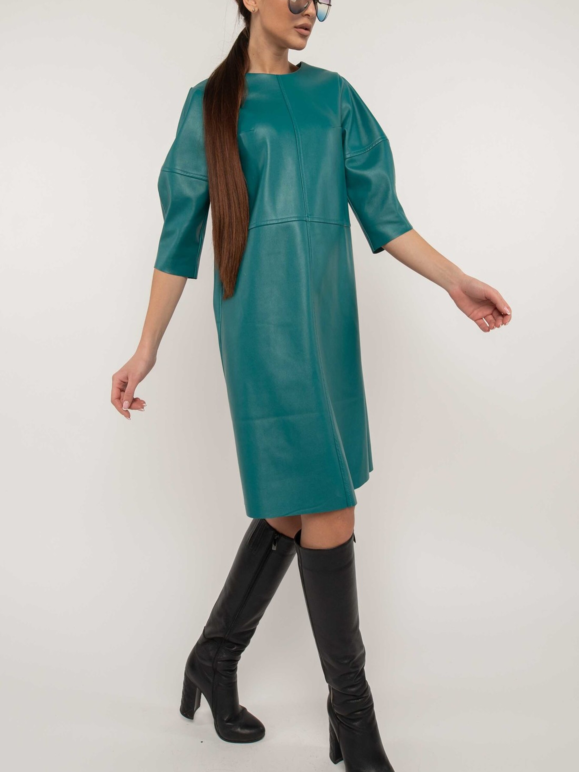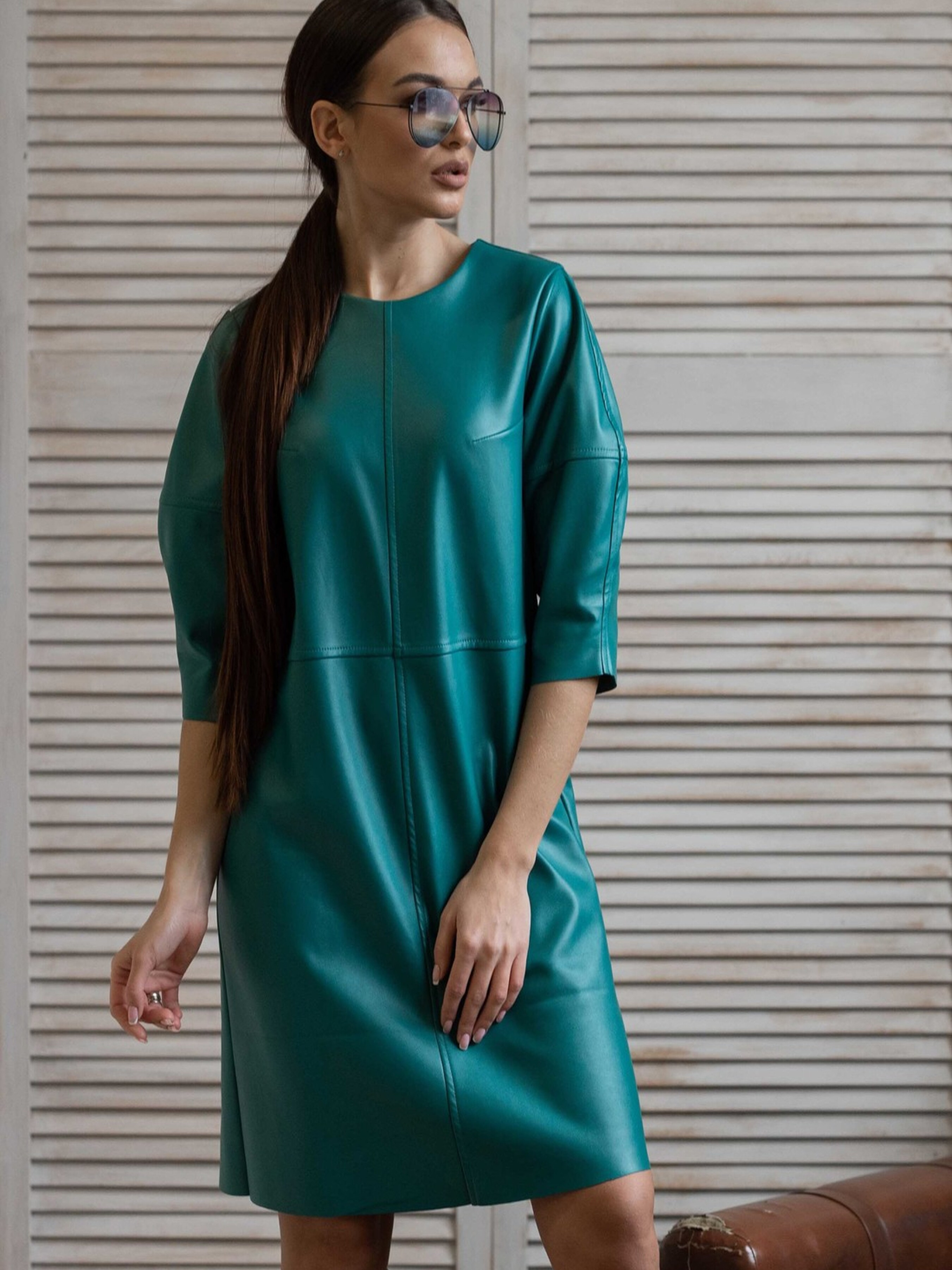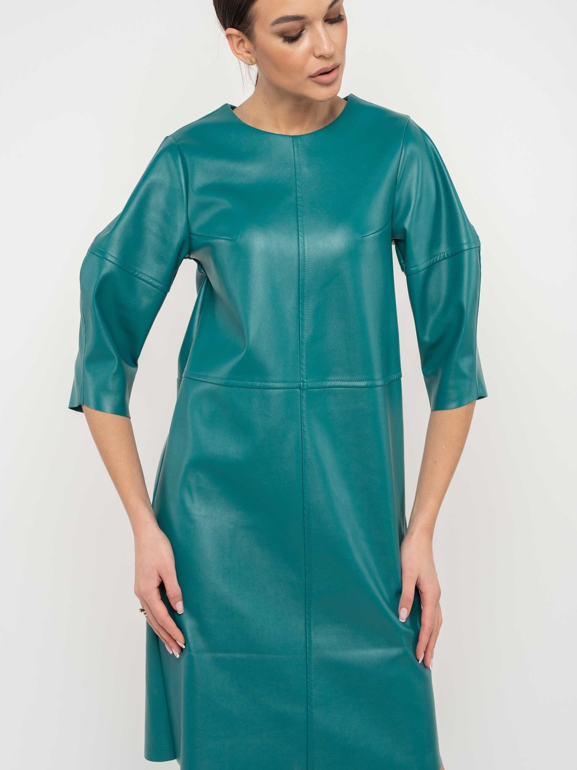 Сьогодні шкіряні сукні стали не просто епатажним елементом, а й стильним трендом у повсякденній моді. Ця лаконічна мінімалістична сукня напівприлеглого силуету, що елегантно сягає вище коліна, доповнена оригінальними рукавами-буфами довжиною ½, стане чудовим вибором як для яскравої вечірки, так і для стильного повсякденного офісного образу. Особливою деталлю є фігурний виріз у верхній частині спинки, що застібається на функціональну кнопку. Необроблені краї низу рукавів та сукні додають образу сучасної невимушеності. Виготовлена з якісної екошкіри на віскозно-замшевій основі, ця сукня поєднує стильний зовнішній вигляд, приємні тактильні відчуття та комфорт у носінні. Характеристики: Матеріал: Екошкіра на віскозно-замшевій основі (56% поліестер, 34% віскоза, 10% бавовна) Стиль: Мінімалістичний, повсякденний, вечірній, офісний Крій: Напівприлеглий силует Довжина: Вище коліна (міні) Рукав: Буфи, довжина ½ Спинка: Фігурний виріз під функціональну кнопку у верхній частині Низ: Необроблений (рукавів та сукні) Властивості: Стильна, універсальна, комфортна, сучасний дизайн