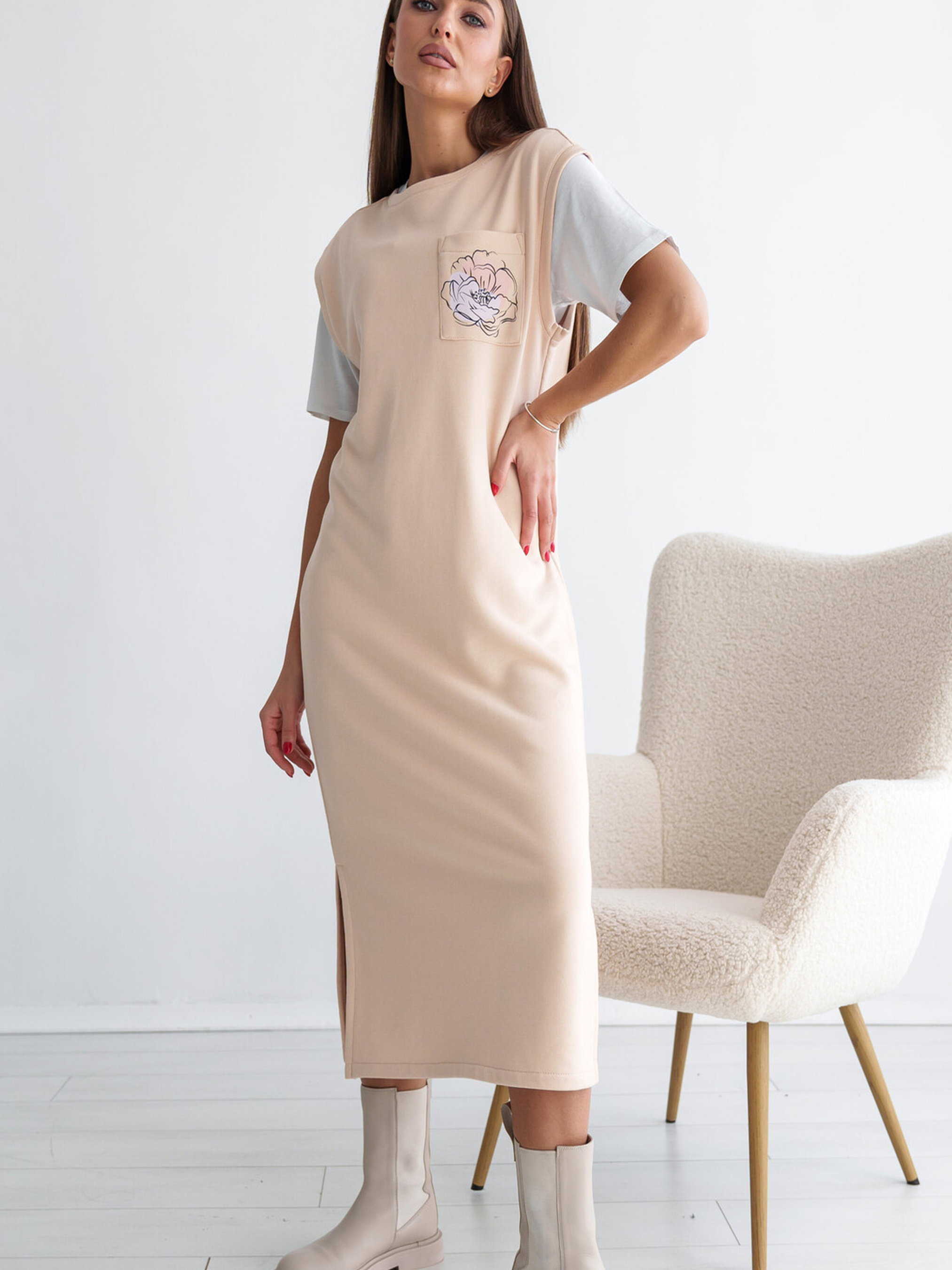 Демісезонний сарафан напівприлеглого силуету елегантної міді довжини стане універсальною основою для ваших стильних образів. По боках внизу передбачені два розрізи, що додають свободи рухів. Лаконічний дизайн сарафана акцентований лише однією накладною кишенею з ніжним флористичним принтом. Цей сарафан легко інтегрується в будь-який образ, залежно від вашого вибору аксесуарів та компаньйона – чи то затишний гольф, чи витончена блуза. Застібка відсутня, що робить його зручним у вдяганні. У комплекті йде пояс з основної трикотажної тканини, який допоможе підкреслити талію. Виготовлений з м'якого та практичного трикотажу тринитки на основі бавовни з додаванням поліестеру, цей сарафан буде комфортним у носінні в демісезонний період. Характеристики: Матеріал сукні: Трикотаж тринитка (85% бавовна, 15% поліестер) Крій: Напівприлеглий силует, міді довжина Деталі: Два розрізи по боках внизу, накладна кишеня з флористичним принтом Застібка: Відсутня Додатково: Пояс із тканини Стиль: Демісезонний, повсякденний, універсальний Властивості: М'яка, практична тканина