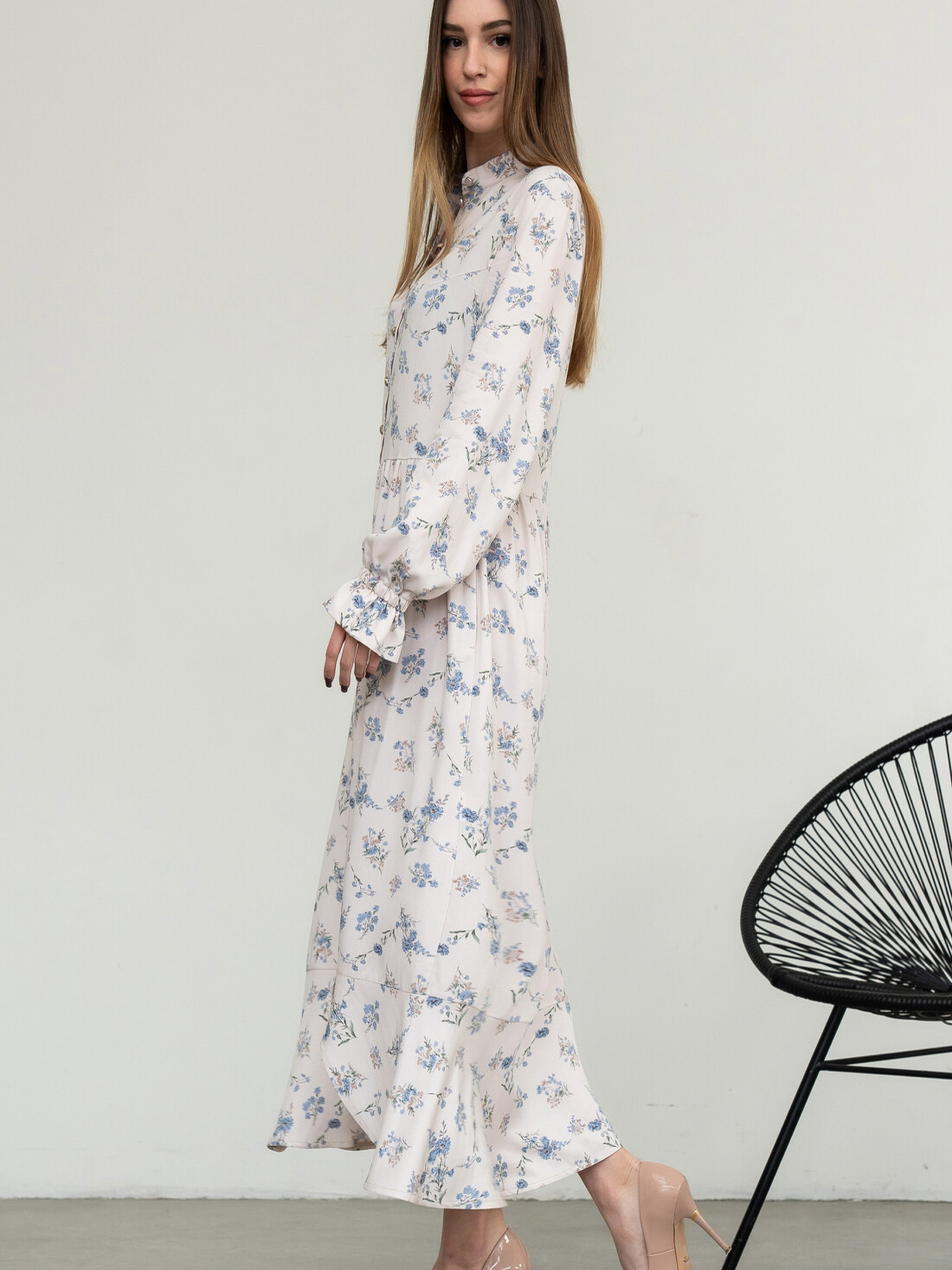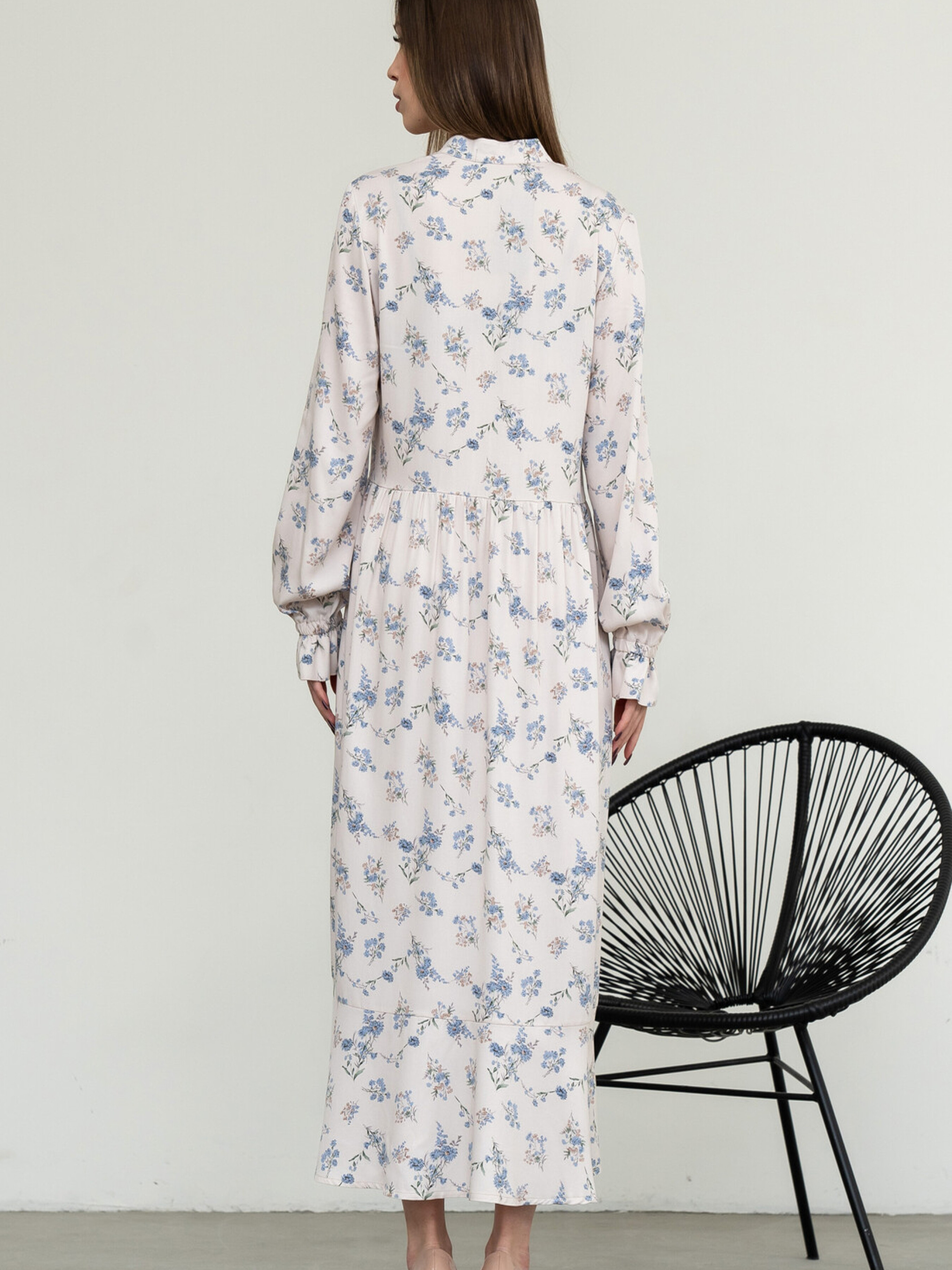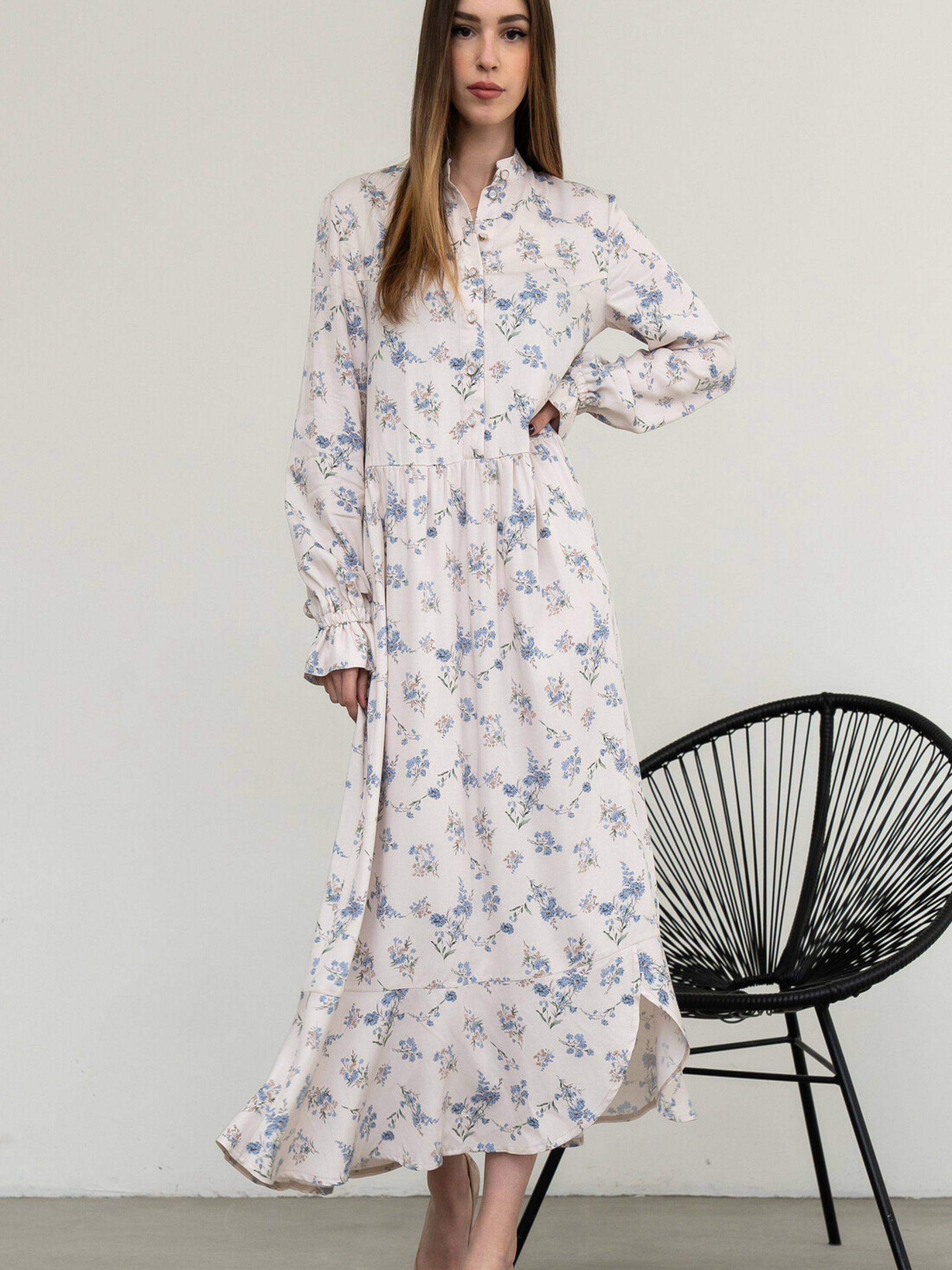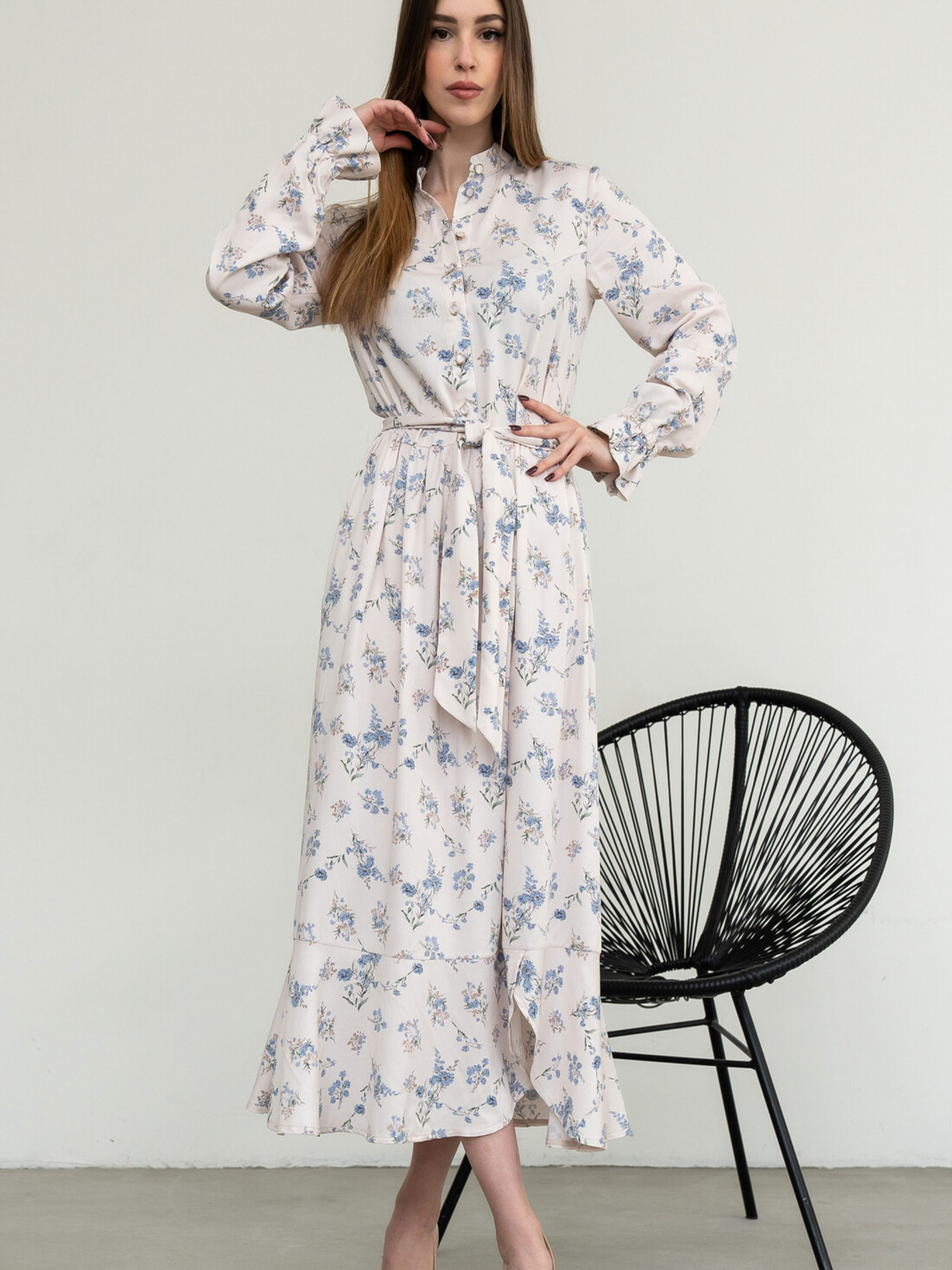 Вільна жіночна сукня елегантної міді довжини поєднує в собі практичність та вишуканість. Комір-стійка та функціональна застібка на ґудзики, що доходять до лінії відрізної талії, додають їй стриманості. У бічних швах вільної спідниці розташовані зручні кишені, а асиметричний волан по низу створює цікавий та динамічний образ. Оригінальні рукави, розкльошені донизу та зібрані на резинку, утворюючи ніжні рюші, є виразною деталлю. У комплекті йде пояс з основної тканини, який допоможе підкреслити талію. Характеристики (залежно від кольору): Матеріал сукні (молоко): Штапель-твіл (60% віскоза, 40% бавовна) Матеріал сукні (інші кольори): Штапель-твіл (100% бавовна) Крій: Вільний, міді довжина Комір: Стійка Застібка: Функціональна на ґудзики до лінії талії Рукав: Розкльошений донизу, зібраний на резинку (рюша) Спідниця: Вільна, з кишенями в бічних швах, асиметричний волан по низу Додатково: Пояс із тканини сукні Стиль: Універсальний, повсякденний, елегантний, жіночний Властивості: Практична, комфортна тканина
