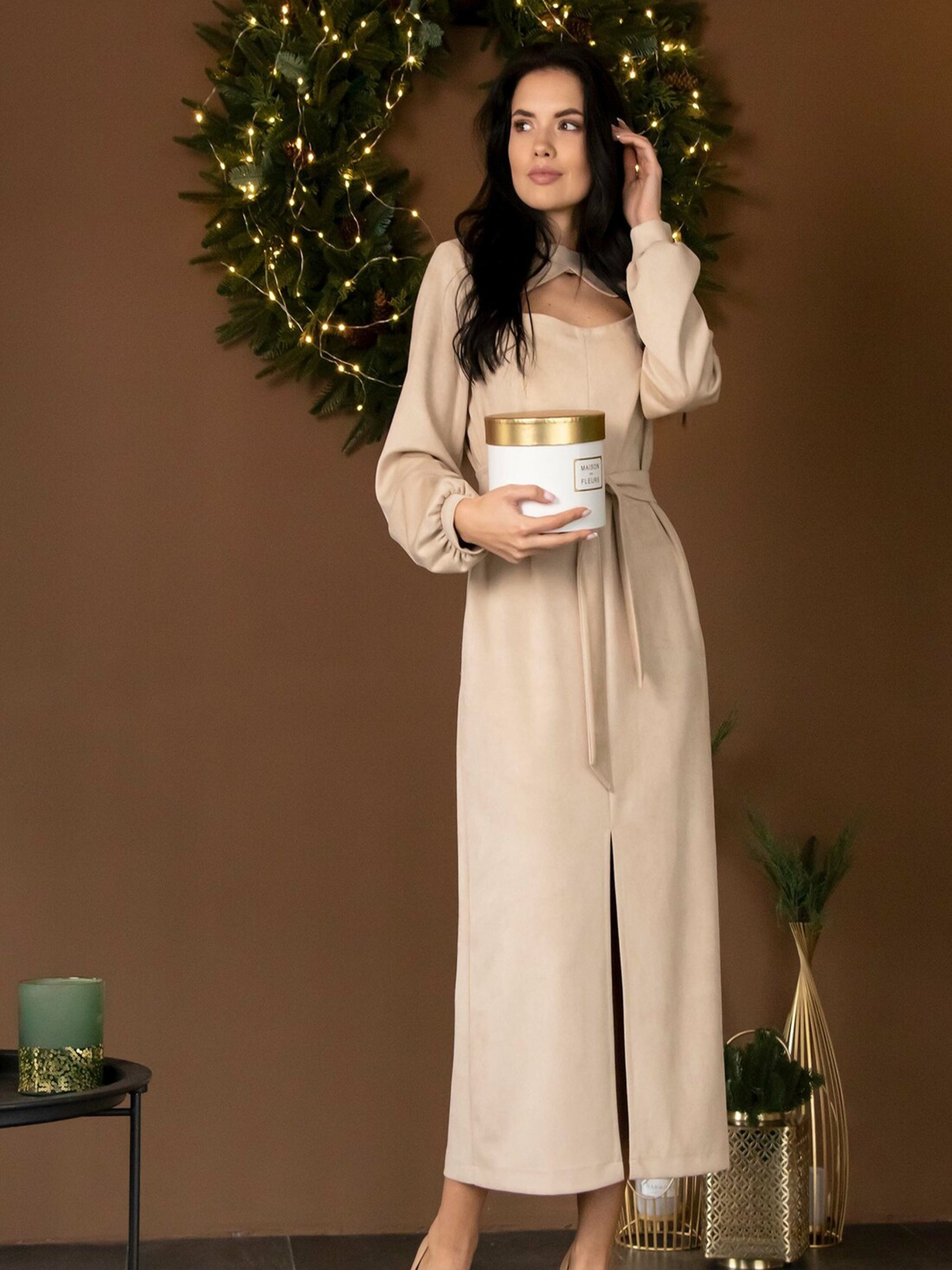 Спокуслива офісна сукня прямого вільного силуету елегантної міді довжини поєднує в собі строгість та жіночність. Декольте підкреслено оригінальною декоративною горловиною. Центральний шов спереду завершується пікантним розрізом, що сягає трохи вище коліна. Зручні кишені, розташовані в бічних швах, додають практичності. Особливою родзинкою є пишний рукав зі збиранням біля манжети, що додає образу витонченості. У комплекті з сукнею йде пояс з основної трикотажної тканини, який допоможе вам підкреслити лінію талії та створити більш приталений силует. Виготовлена з м'якого та приємного на дотик трикотажу із замшем-діагоналлю, ця сукня забезпечить вам комфорт протягом усього дня, зберігаючи при цьому елегантний та професійний вигляд. Характеристики: Матеріал: Трикотаж із замшем-діагональ (56% поліестер, 34% віскоза, 10% бавовна) Крій: Прямий вільний силует, міді довжина Горловина: Декоративна Рукав: Пишний, зі збиранням біля манжети Деталі: Центральний шов спереду з розрізом вище коліна, кишені в бічних швах Додатково: Пояс із тканини сукні Стиль: Офісний, спокусливий, елегантний, повсякденний Властивості: М'яка, комфортна трикотажна тканина