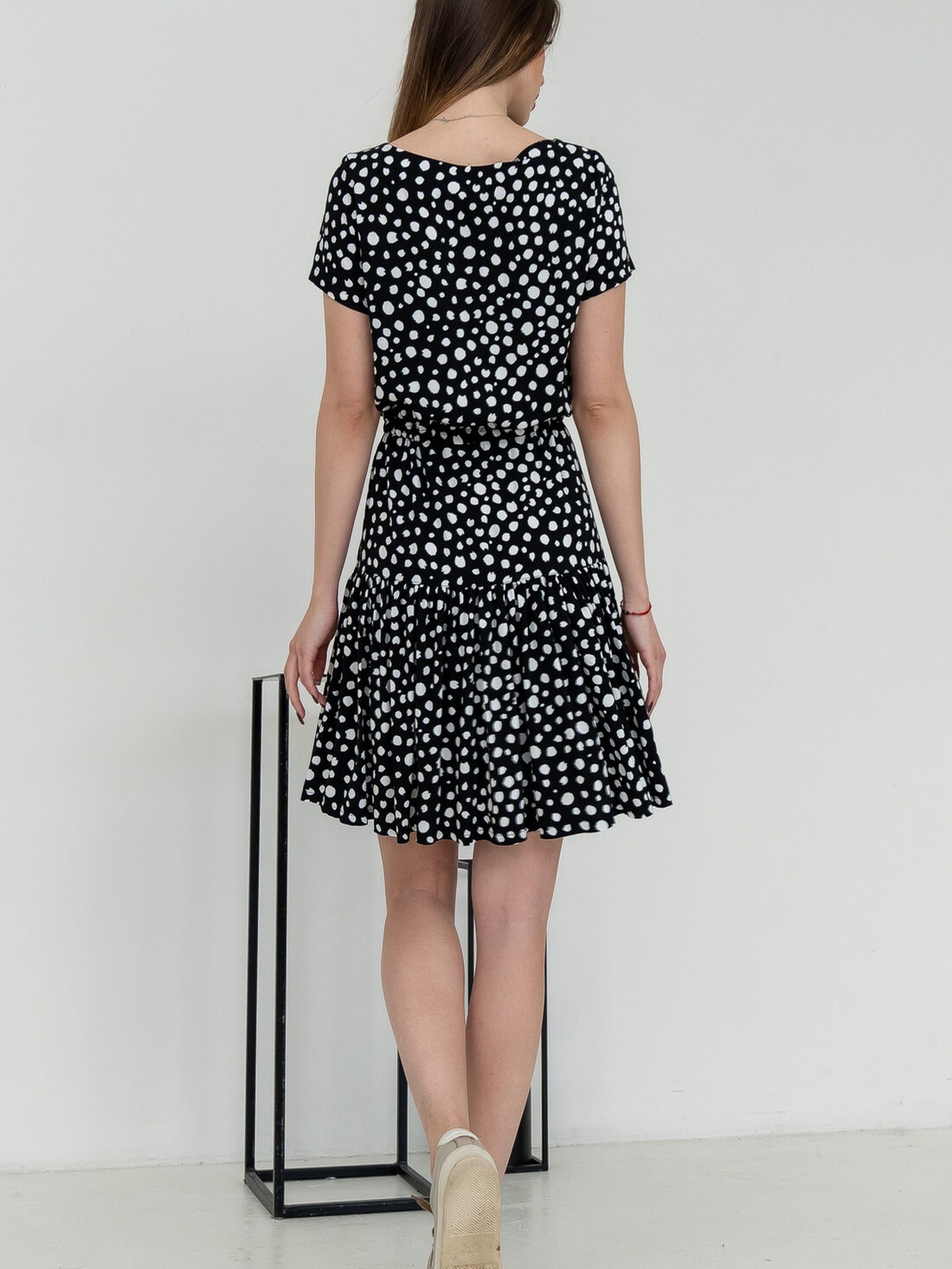 Ця міні сукня вільного силуету поєднує в собі легкість та оригінальний дизайн. Відрізна лінія талії підкреслює фігуру, а широкий асиметричний волан по низу додає динаміки та кокетливості. Сукня має втачний короткий рукав. Горловина переду оформлена декоративною "краплею", що зав'язується. По лінії талії передбачена куліса для шнура, який дозволяє приталити сукню за бажанням. Широкий асиметричний волан призборений по шву та має асиметричний рельєф спереду, а в шві лівої частини волана виконаний розріз. Виготовлена зі штапель-твілу, що поєднує віскозу та бавовну, ця сукня буде легкою, приємною до тіла та матиме гарну драпірувальність. Характеристики: Матеріал сукні: Штапель-твіл (60% віскоза, 40% бавовна) Крій: Вільний силует, міні довжина, відрізна лінія талії Рукав: Втачний короткий Горловина: "Крапля" з зав'язками спереду Талія: Куліса для шнура Низ: Широкий асиметричний волан (призборений, з асиметричним рельєфом спереду та розрізом зліва) Стиль: Легкий, повсякденний, оригінальний Властивості: Легка, приємна до тіла тканина з гарною драпірувальність
