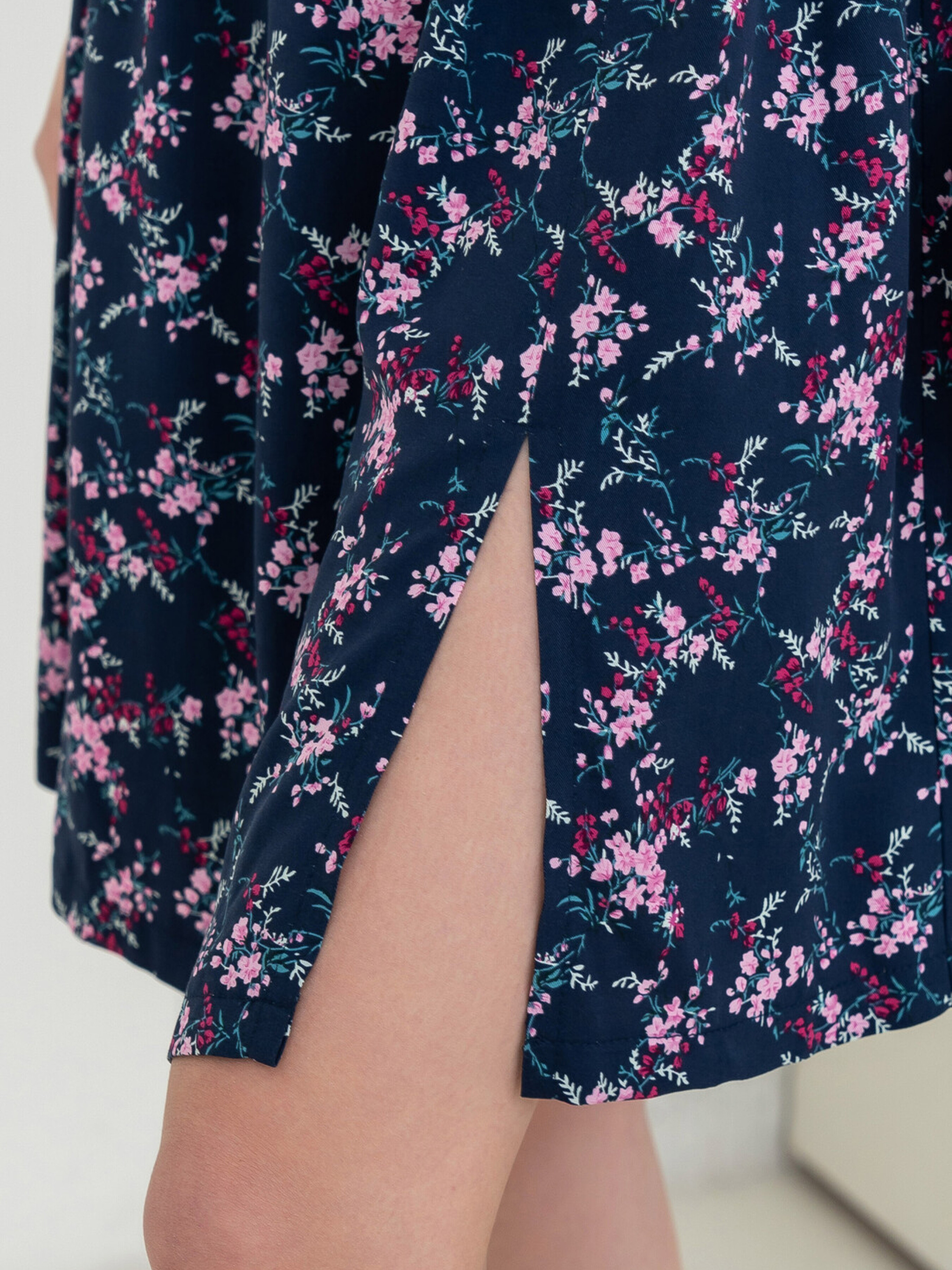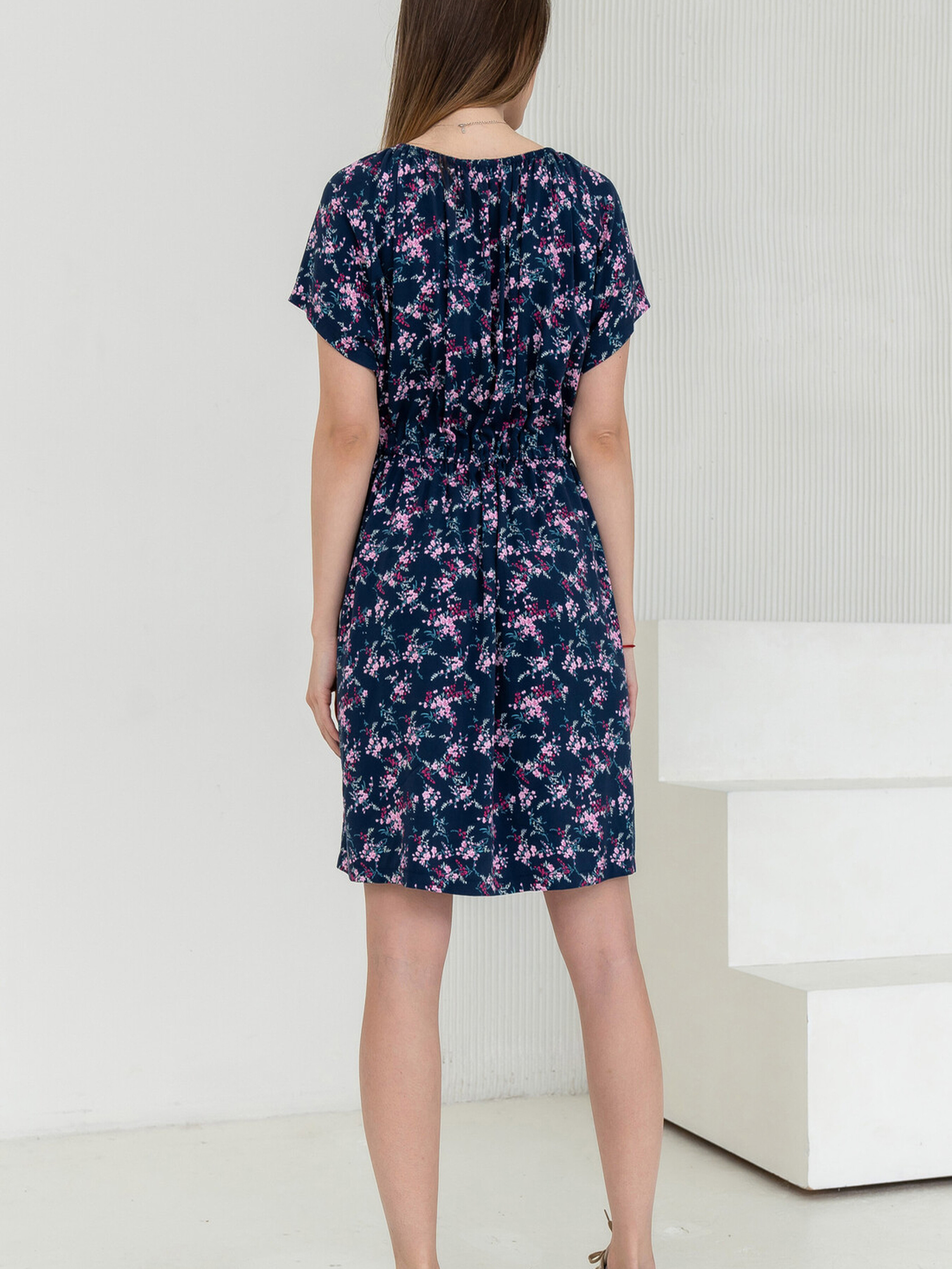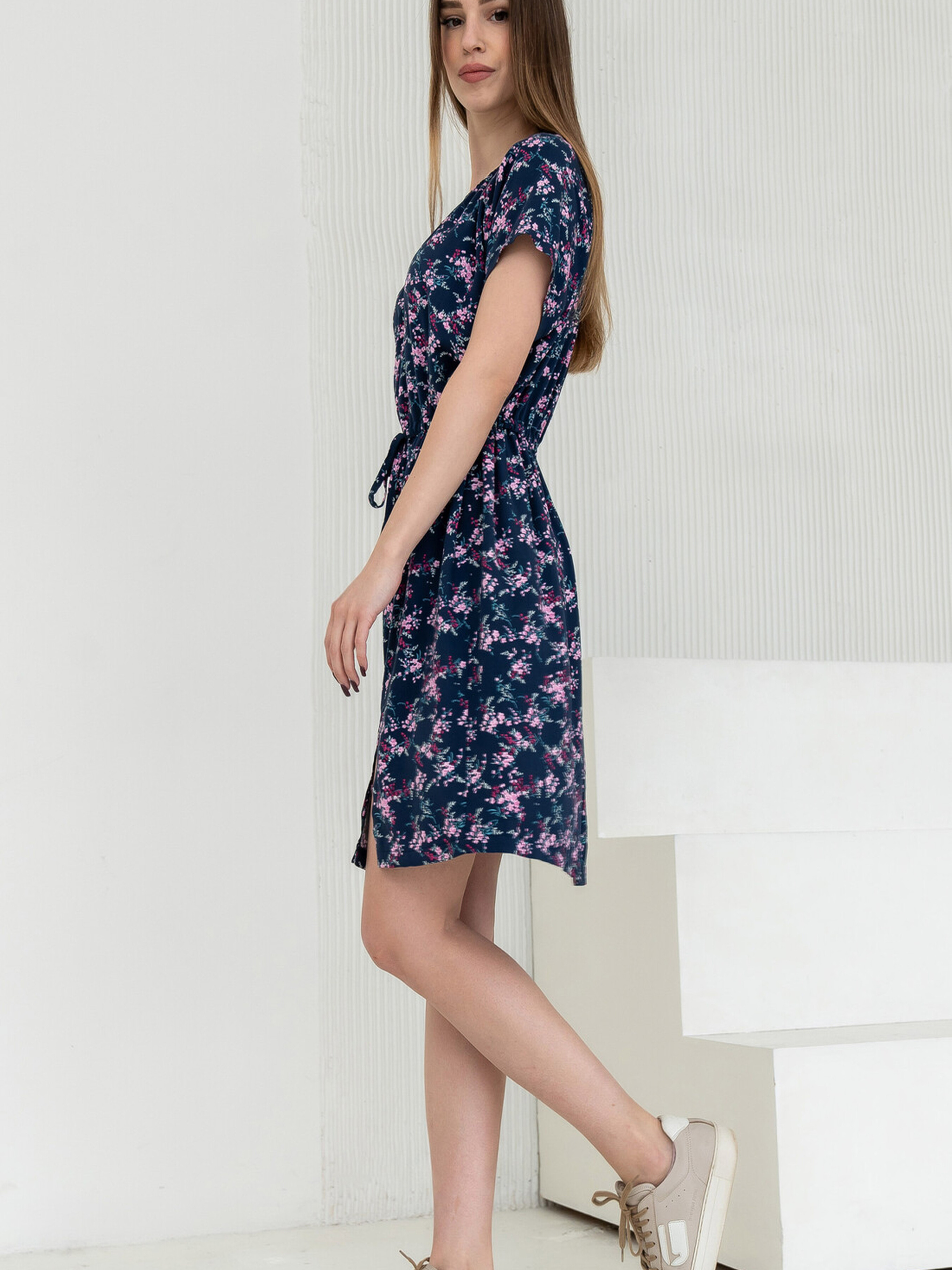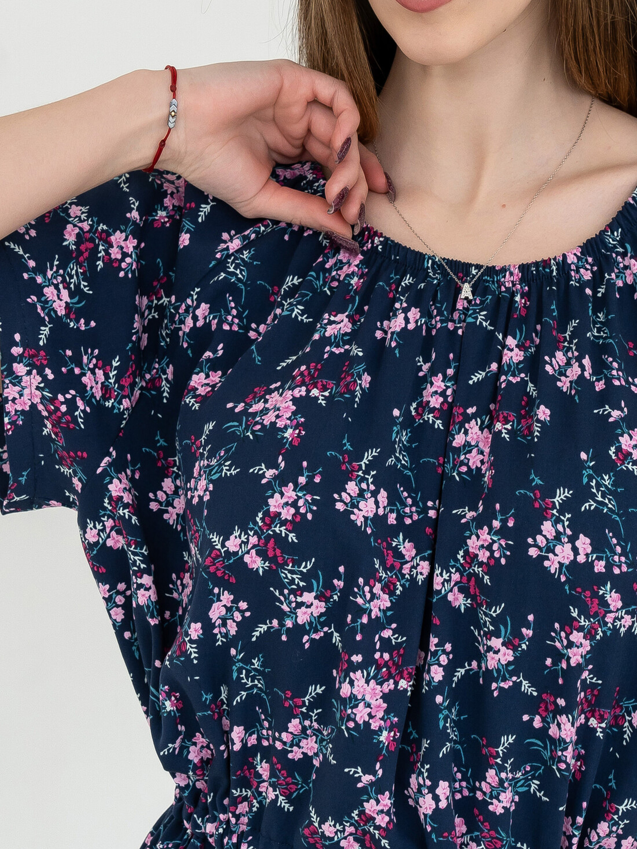 Ця легка сукня вільного силуету середньої довжини стане вашим улюбленим вбранням для теплих днів. Зручний короткий рукав реглан та розріз по переду додають легкості. Особливістю сукні є горловина, стягнута на вузьку резинку, що дозволяє експериментувати зі стилем, опускаючи її на плечі або залишаючи класично. Сукня відрізна по лінії талії, де в шві оброблена куліса, що стягується шнуром з основної тканини, дозволяючи регулювати посадку. Пікантності додає розріз на лівій частині переду, що сягає вище коліна. Сукня представлена у зручному здвоєному розмірі. Характеристики (залежно від принта): Матеріал сукні (синій принт): Штапель-твіл (60% віскоза, 40% бавовна) Матеріал сукні (капучино принт): Штапель (100% віскоза) Крій: Вільний силует, середня довжина, здвоєний розмір Рукав: Короткий реглан Горловина: Стягнута на вузьку резинку (можливість носити на плечах) Лінія талії: Відрізна, куліса зі шнуром Деталі: Розріз по переду (ліва частина, вище коліна) Стиль: Легкий, повсякденний, романтичний (при спущеній горловині) Властивості: Легка, приємна до тіла тканина