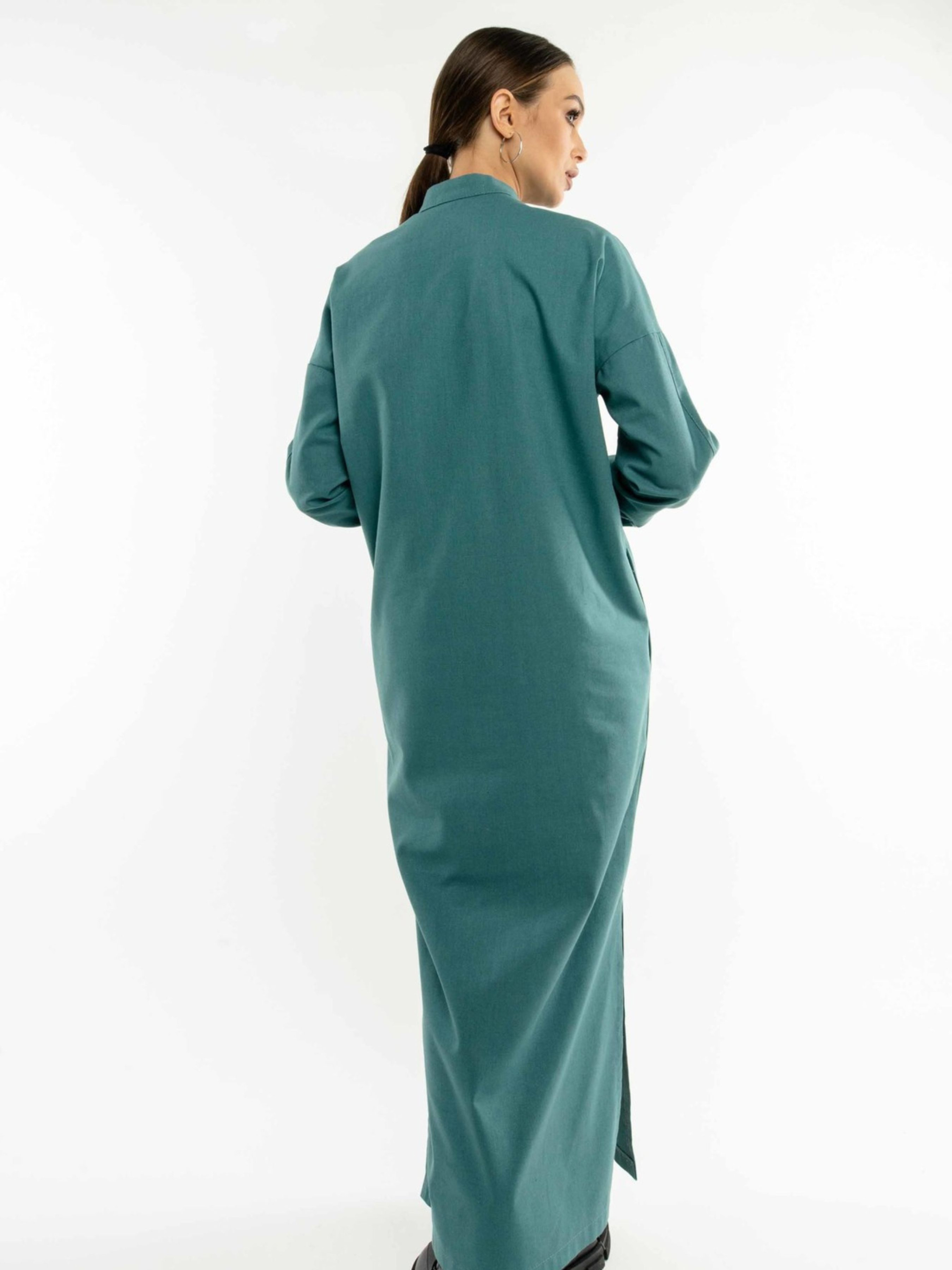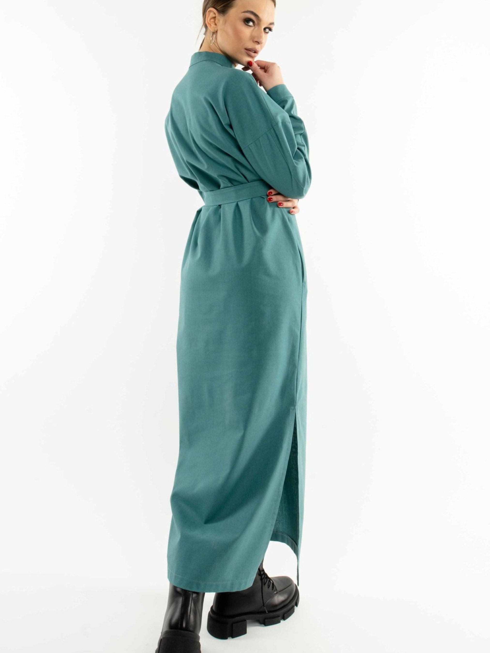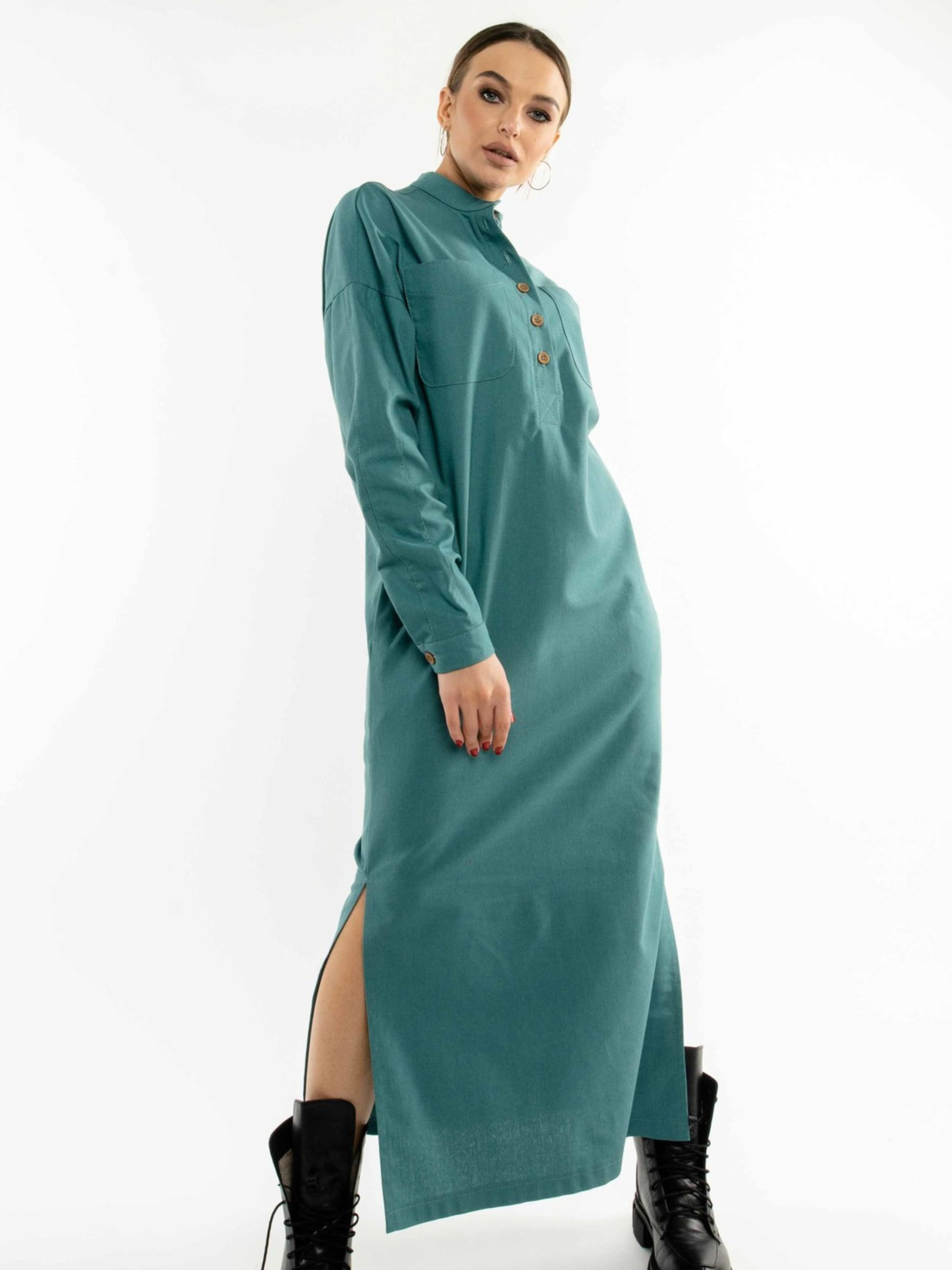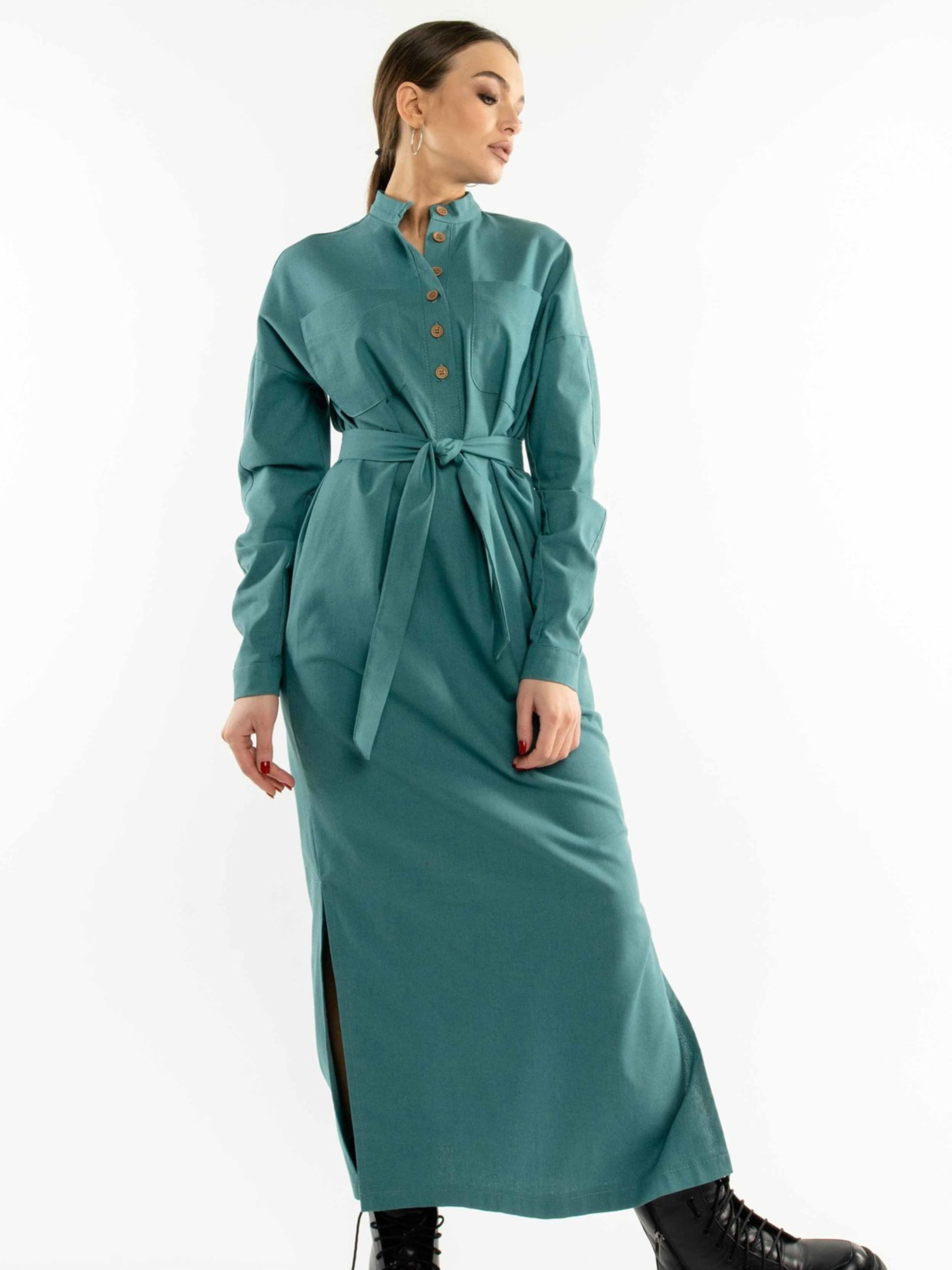 Лаконічна та стильна сукня-сорочка вільного силуету елегантної максі довжини стане незамінним елементом вашого гардеробу. Спущена лінія плеча створює розслаблений, але витончений образ. Акуратний комір-стійка додає стриманості. На грудях розташовані функціональні накладні кишені, а для додаткової зручності в бічних швах передбачені потайні кишені. Розрізи по низу сукні забезпечують свободу рухів. У комплекті з сукнею йде пояс з основної лляної тканини, який допоможе підкреслити лінію талії та створити більш жіночний силует. Виготовлена зі 100% льону, ця сукня ідеально підходить для теплої погоди, забезпечуючи відмінну повітропроникність та легкість. Її універсальний дизайн дозволяє створювати різноманітні стильні образи для повсякденного носіння. Характеристики: Матеріал: Льон (100% льон) Крій: Вільний силует, сорочка Довжина: Максі Комір: Стійка Рукав: Спущена лінія плеча, довгий Кишені: Функціональні накладні на грудях, потайні в бічних швах Деталі: Розрізи по низу сукні Додатково: Пояс з тканини сукні Стиль: Лаконічний, стильний, повсякденний Властивості: Натуральна тканина, повітропроникна, легка, комфортна Сезон: Літо, тепла весна/осінь