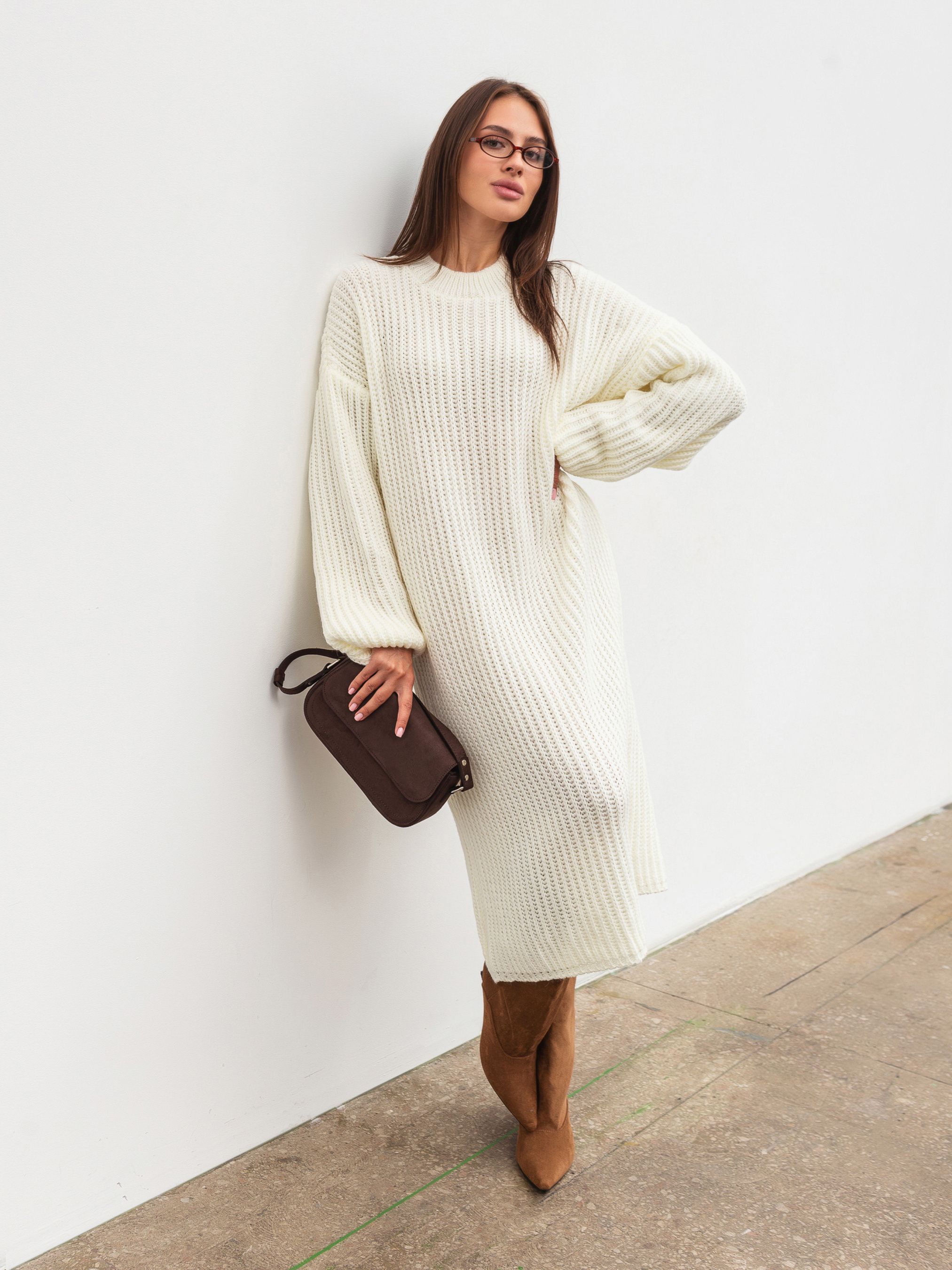 В'язана сукня довжини міді. Модель має актуальну об'ємну в'язку. У складі є шерсть. Комфортно сидить на тілі, не відчувається "важкою". Її можна комбінувати з будь-яким верхнім одягом, доповнюючи образ сумкою та аксесуарами. Довжина по спині : 105 -115 см Довжина рукава : від спущеного шва 51 см Напівобхват грудей : 63 см Напівобхват стегон : 50 см Плечі : 66 см Напівобхват талії : 57 см