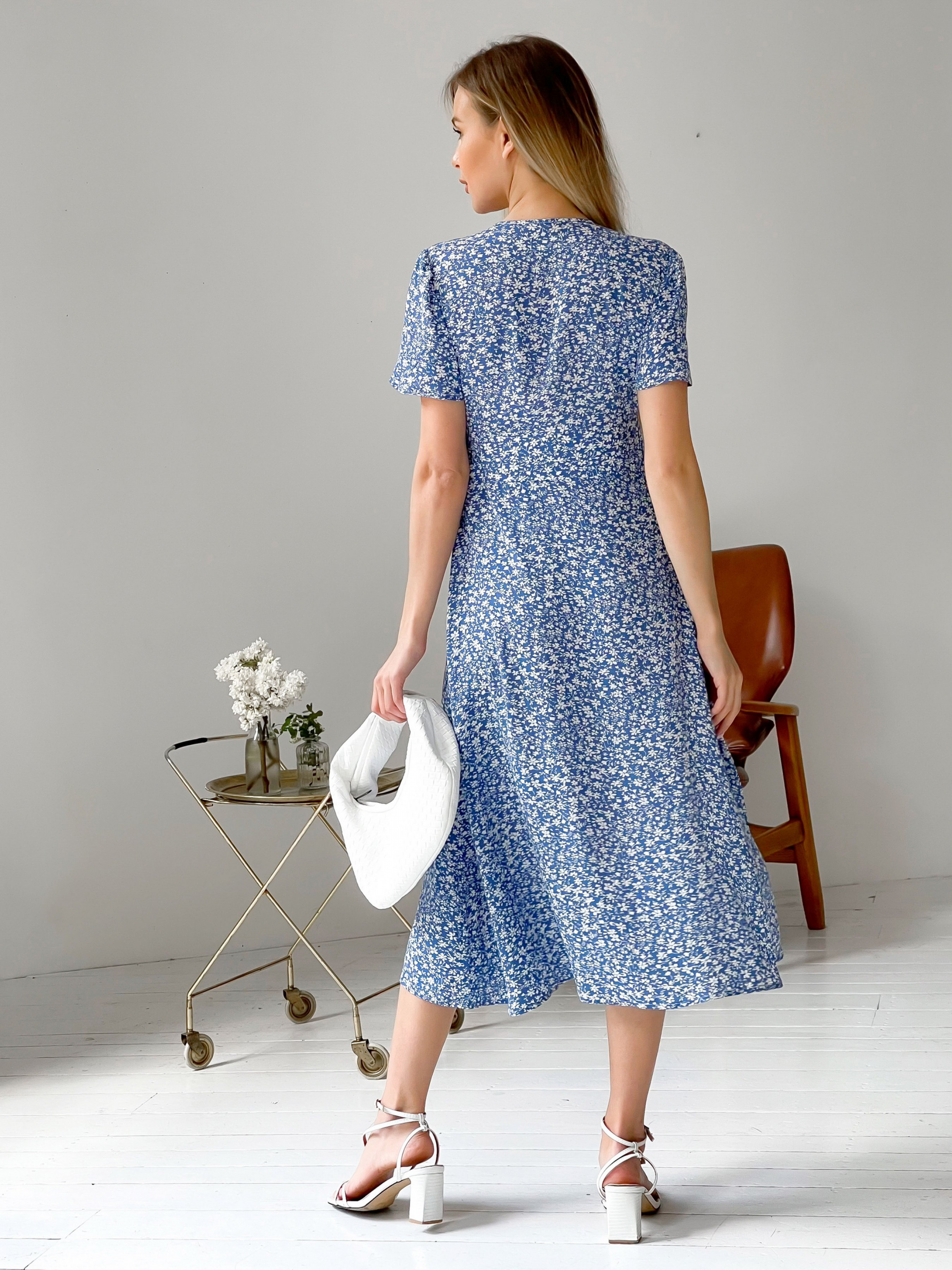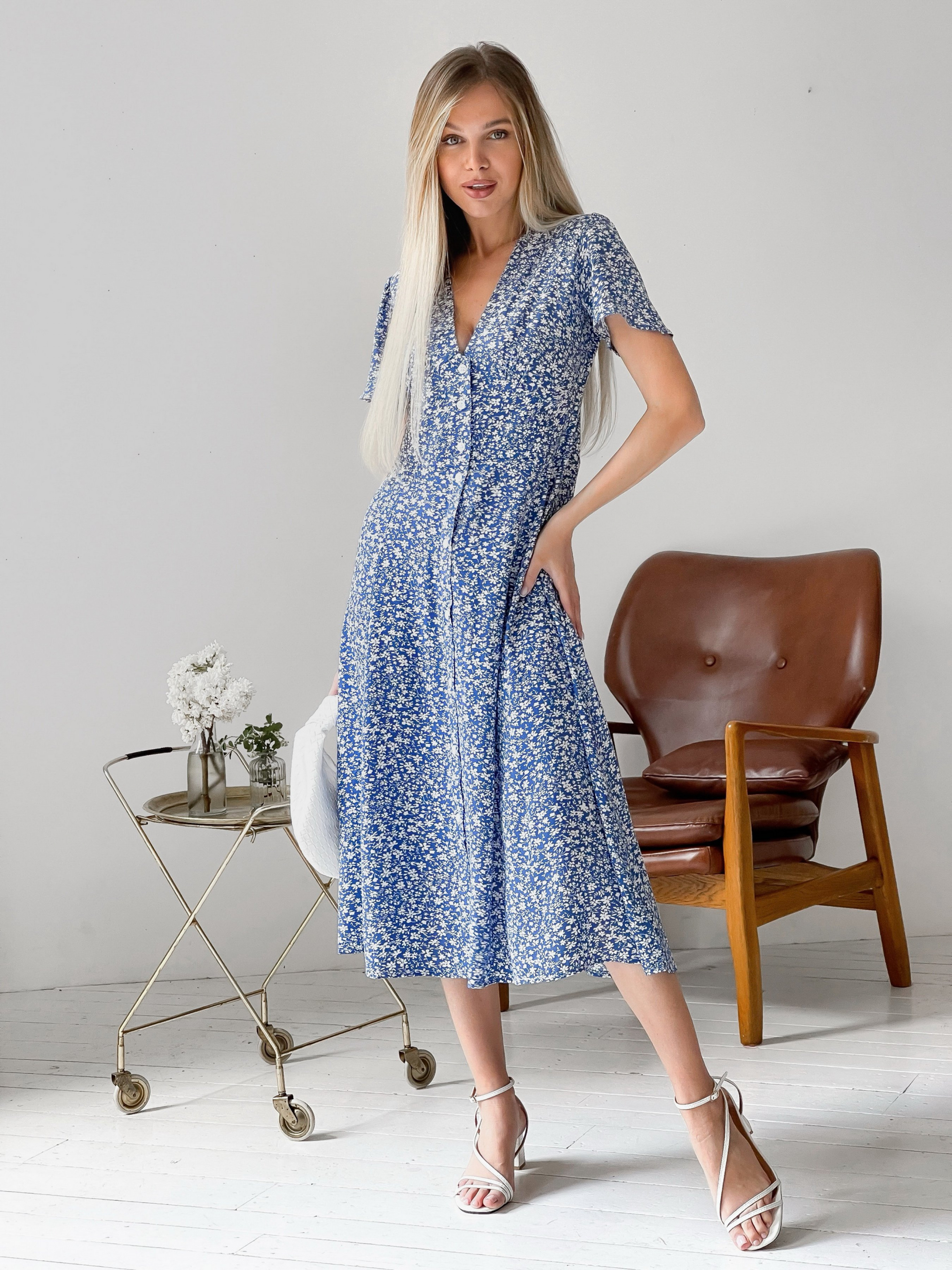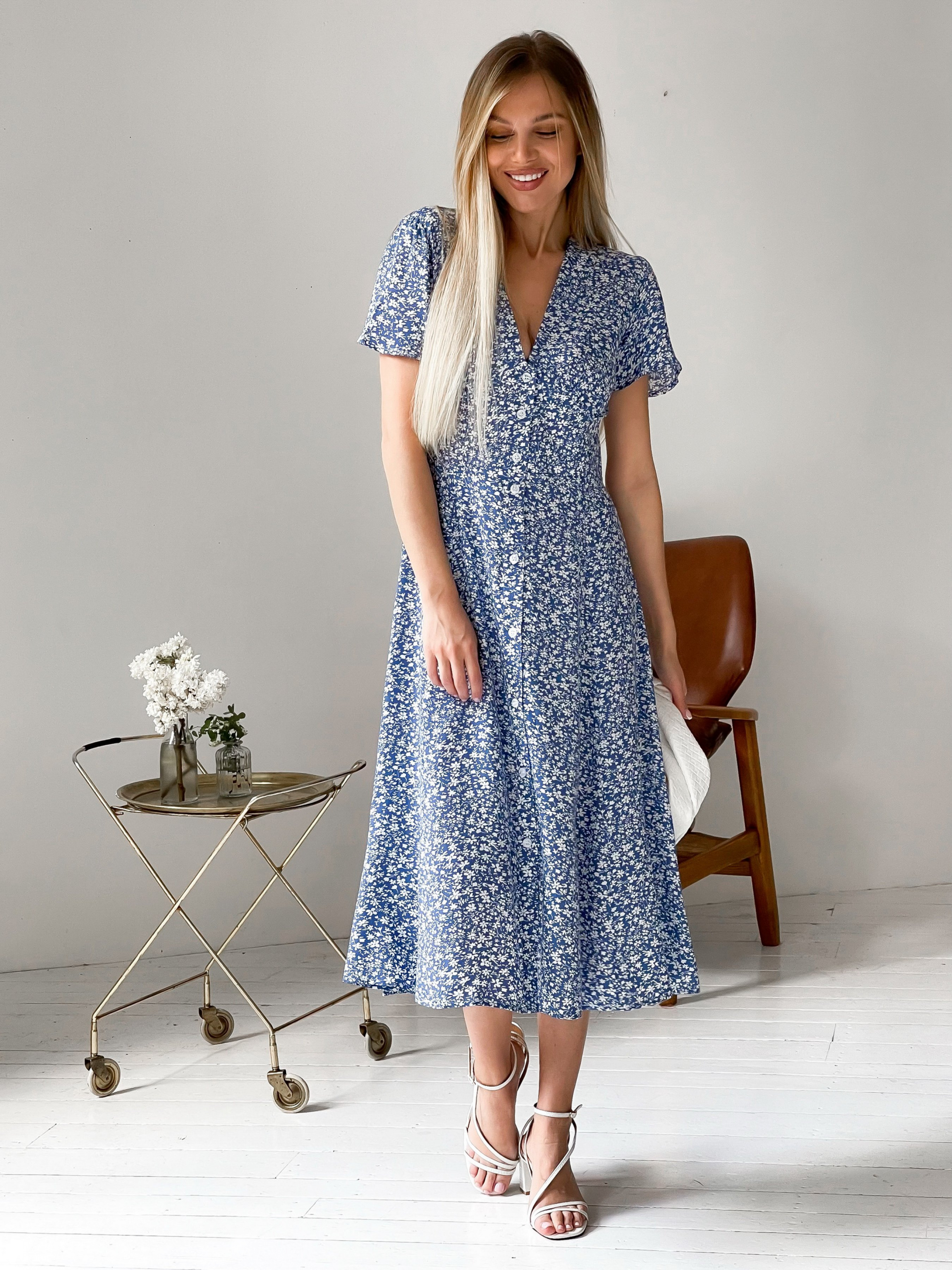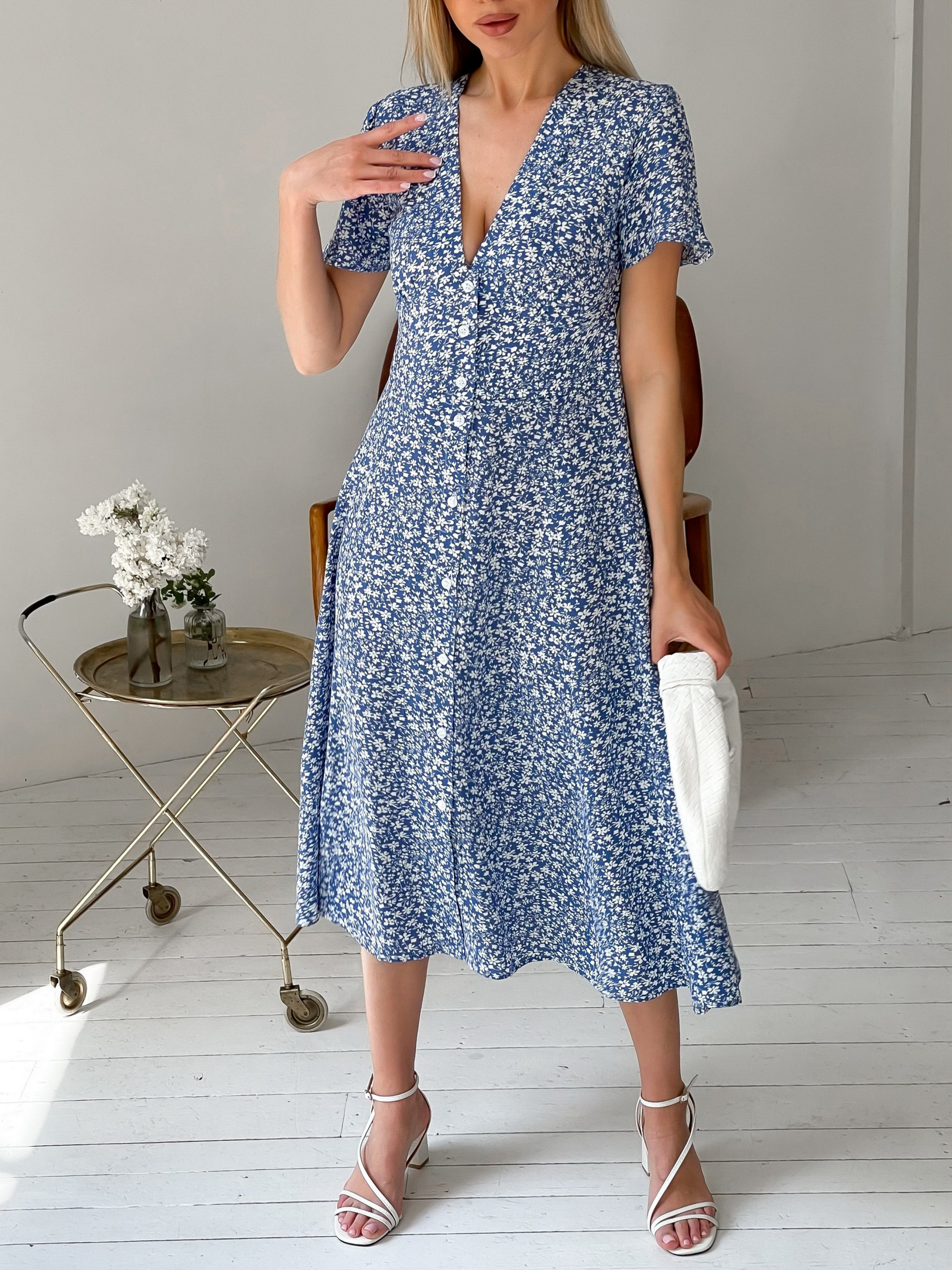 Легка та жіночна сукня в квітковий принт. Довжина міді зараз найбільш універсальна та стильна. Спереду сукня застібається на ґудзики. З цією моделлю виходять ненав'язливі та витончені образи для літа, теплої весни та осені. Доповнити можна капелюхом у спеку, сумкою та тонкими аксесуарами. Заміри: ХS: довжина 110 см. Напівобхват у грудях 41-43 см. Напівобхват талії 34-35 см у стегнах вільно S: Довжина 110 см. Напівобхват у грудях 43-45 см. Напівобхват талії 36-37 см у стегнах вільно М: Довжина 111 см. Напівобхват у грудях 45-47 см. Напівобхват талії 37-38 см у стегнах вільно L: Довжина 111 см. Напівобхват у грудях 47-49 см. напівобхват талії 38-39 см у стегнах вільно.