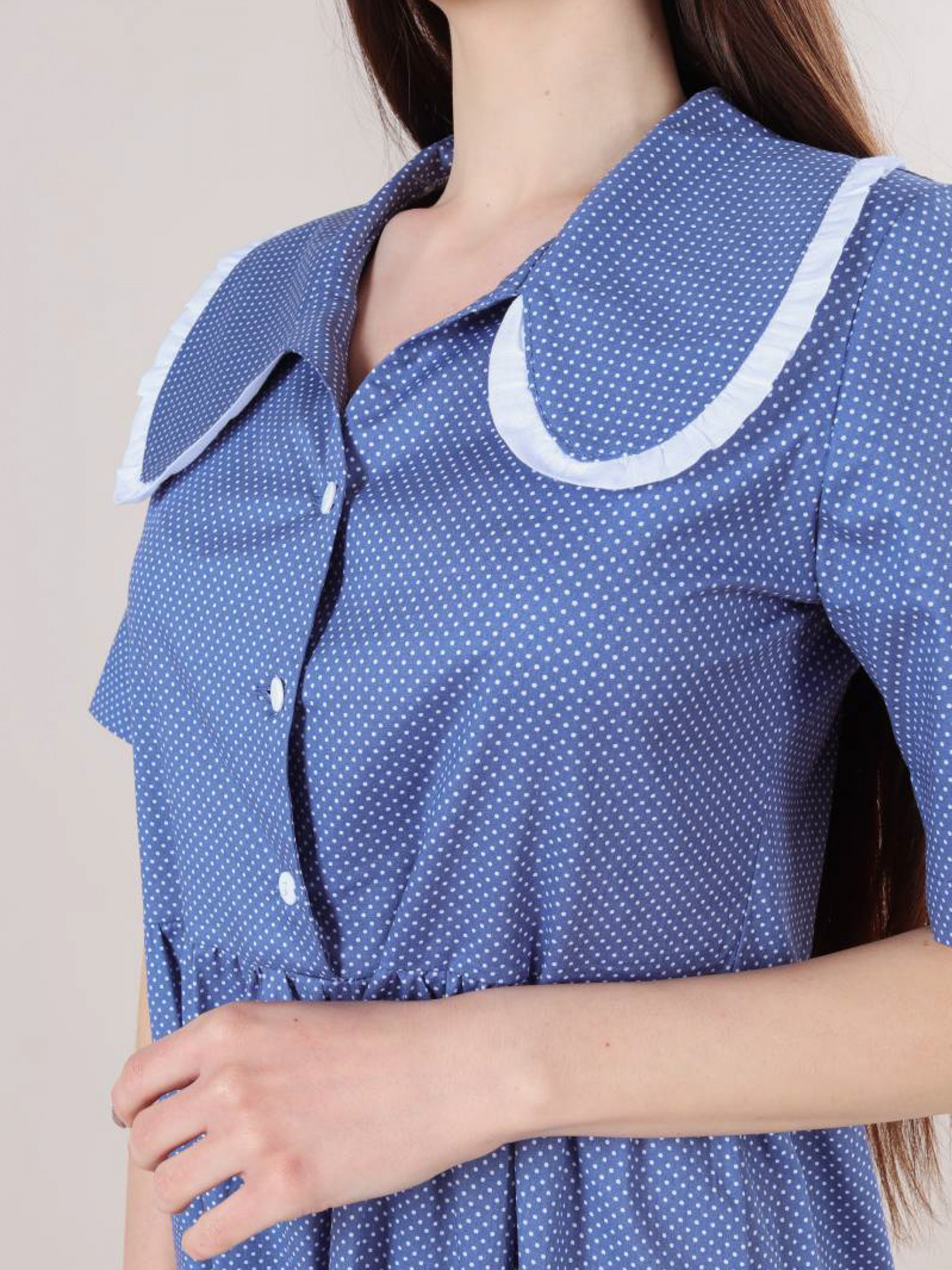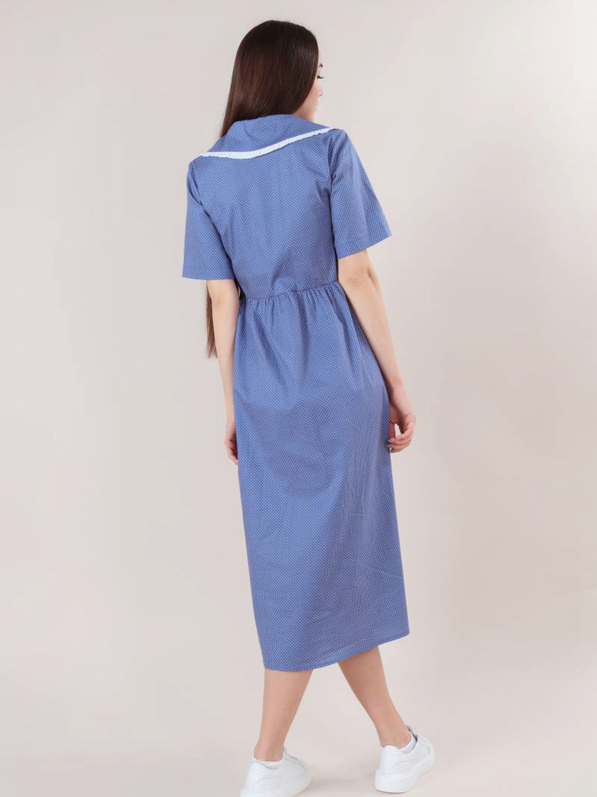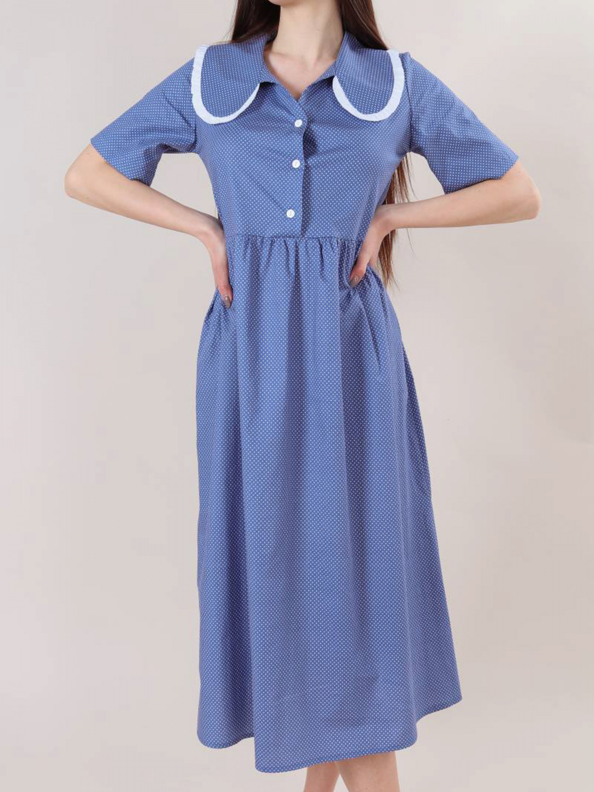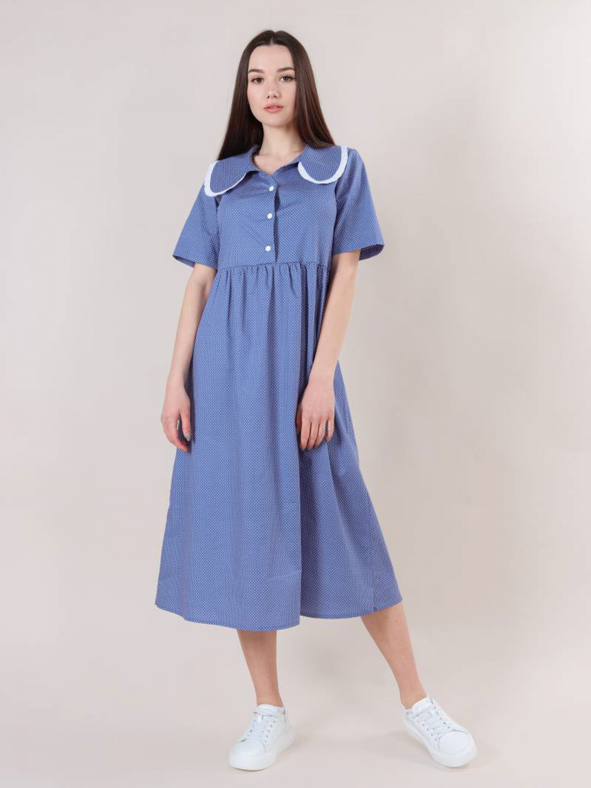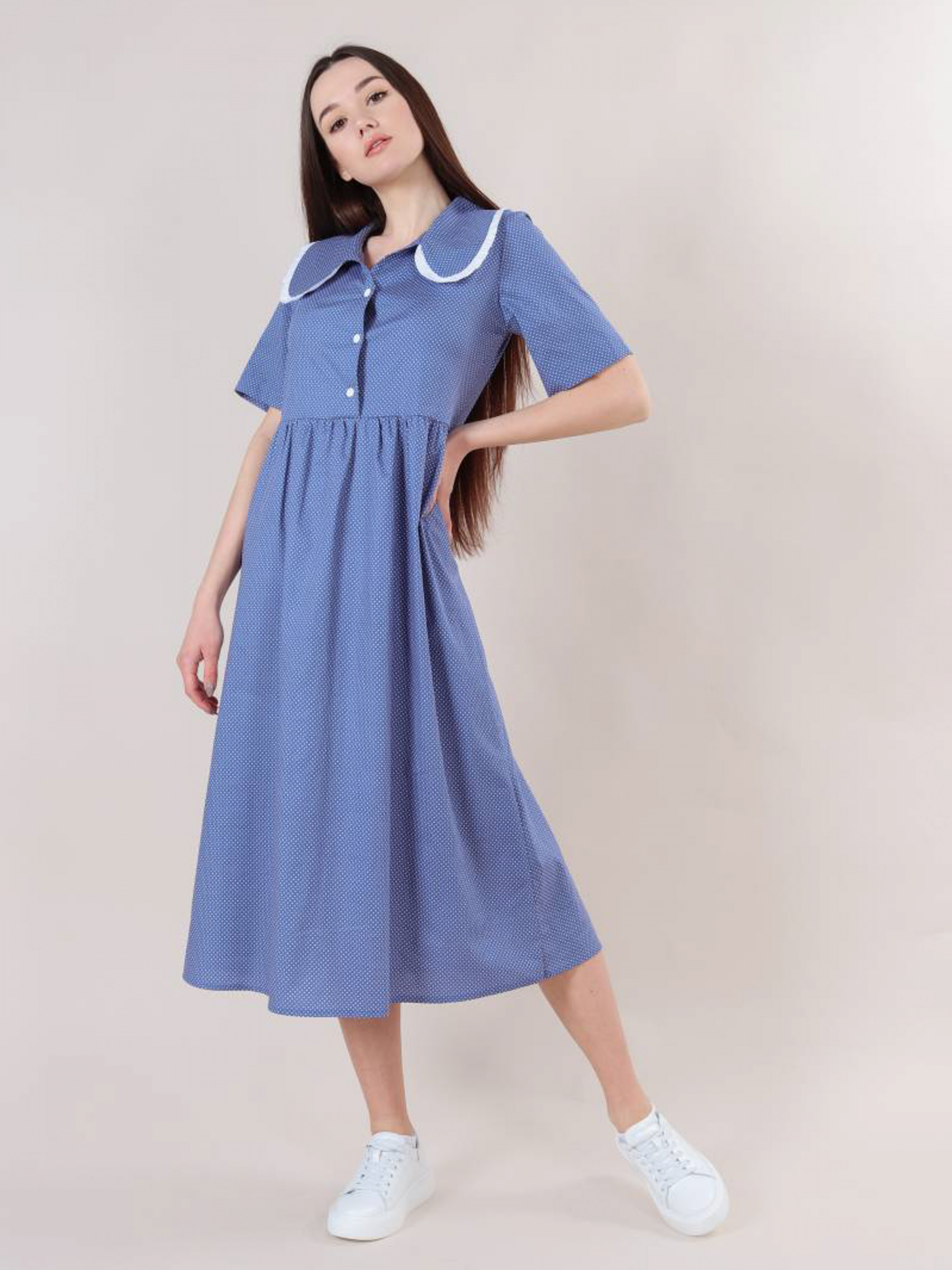 Ніжна і повітряна модель сукні довжини міді. Склад: 99% бавовна, 1% еластан. Рукава короткі, є комір. Футболка застібається на три гудзики по центру. Відмінний casual варіант для прогулянок, навчання або особливих зустрічей. XS-S : Довжина по спині : 120 см Довжина рукава : 37 см Напівобхват грудей : 43+ см Плечі : 37 см Напівобхват талії : 120 см S-M : Довжина по спині : 120 см Довжина рукава : 38 см Напівобхват грудей : 47+ см Плечі : 38 см Напівобхват талії : 120 см
