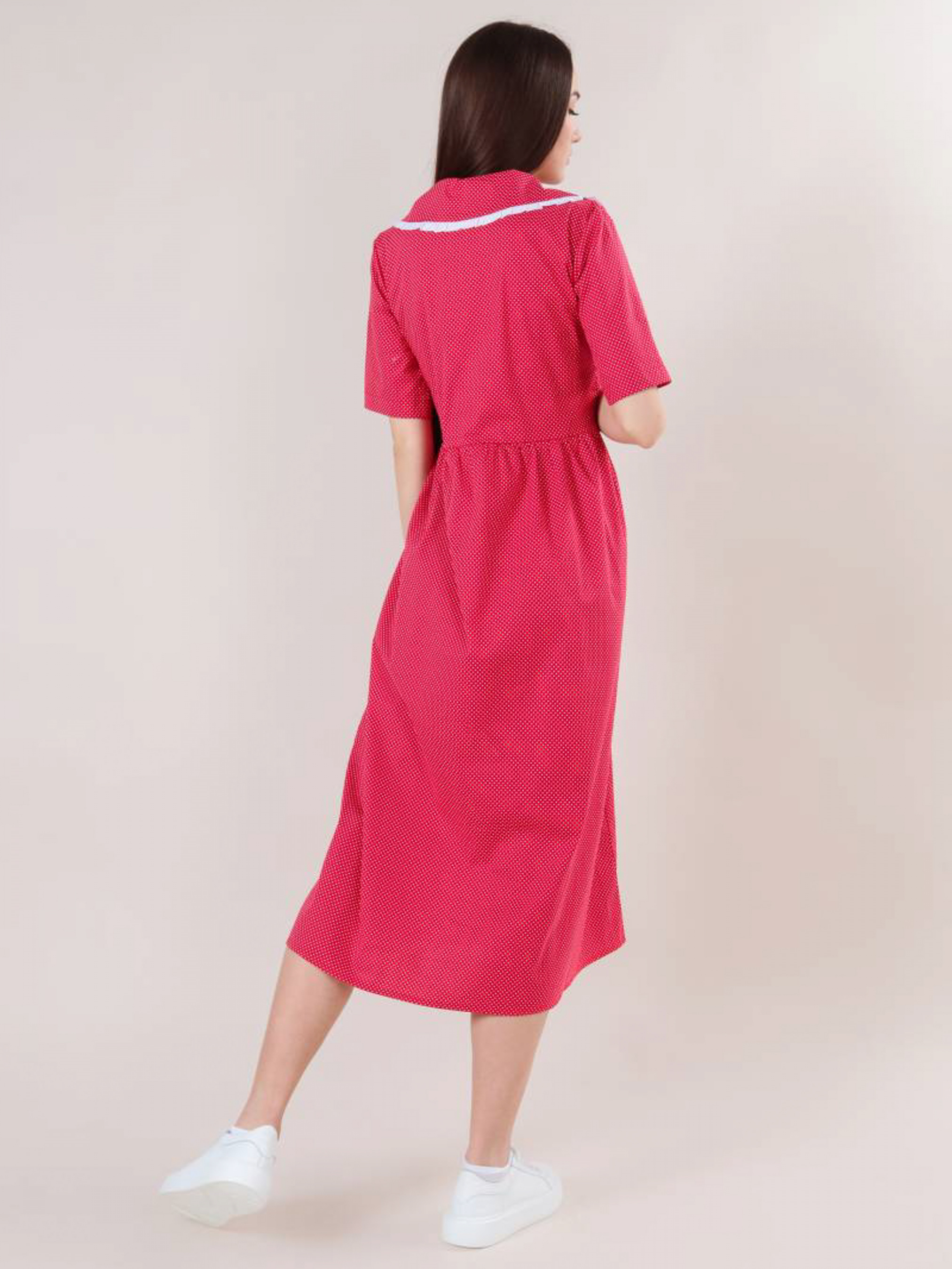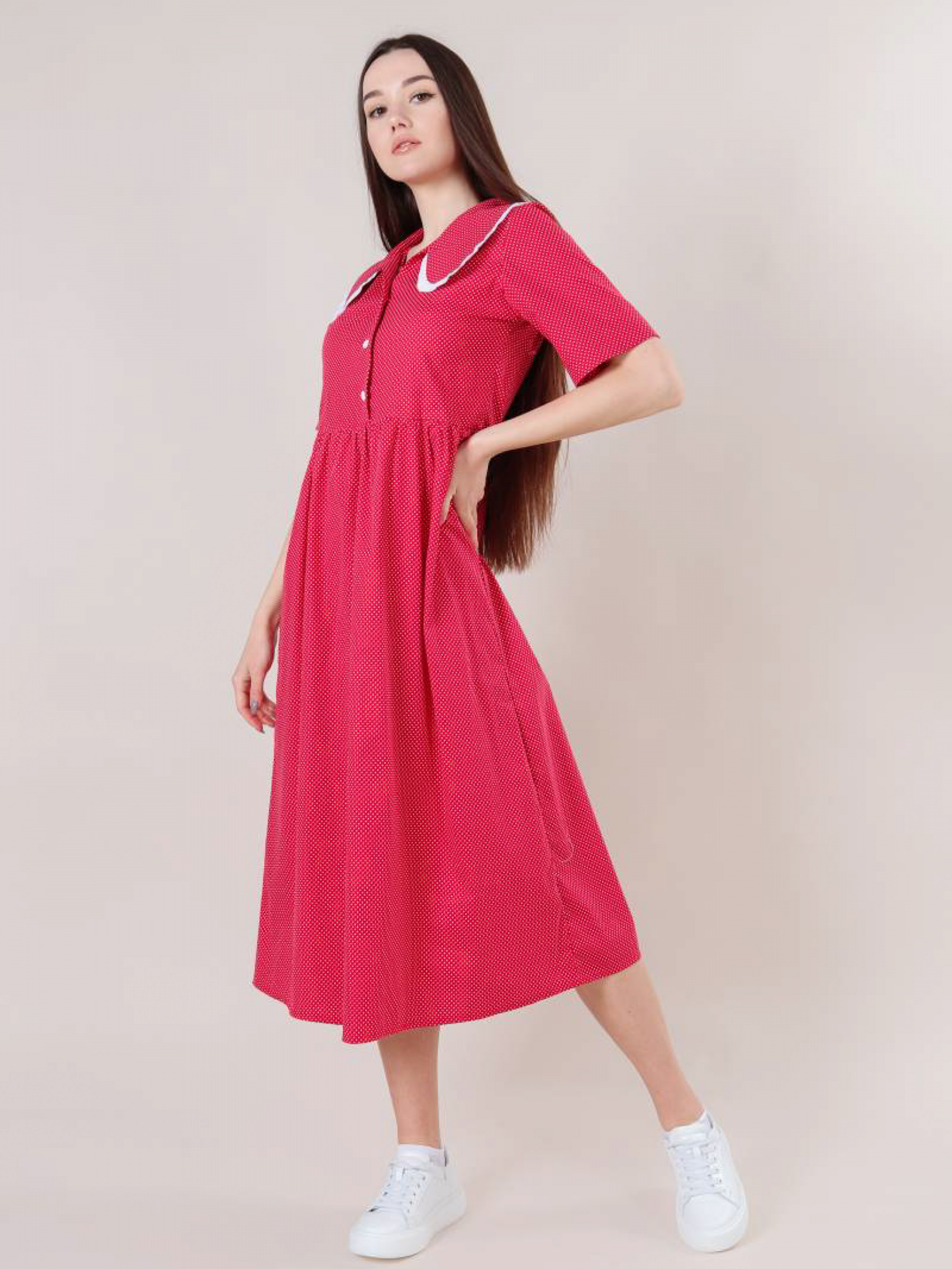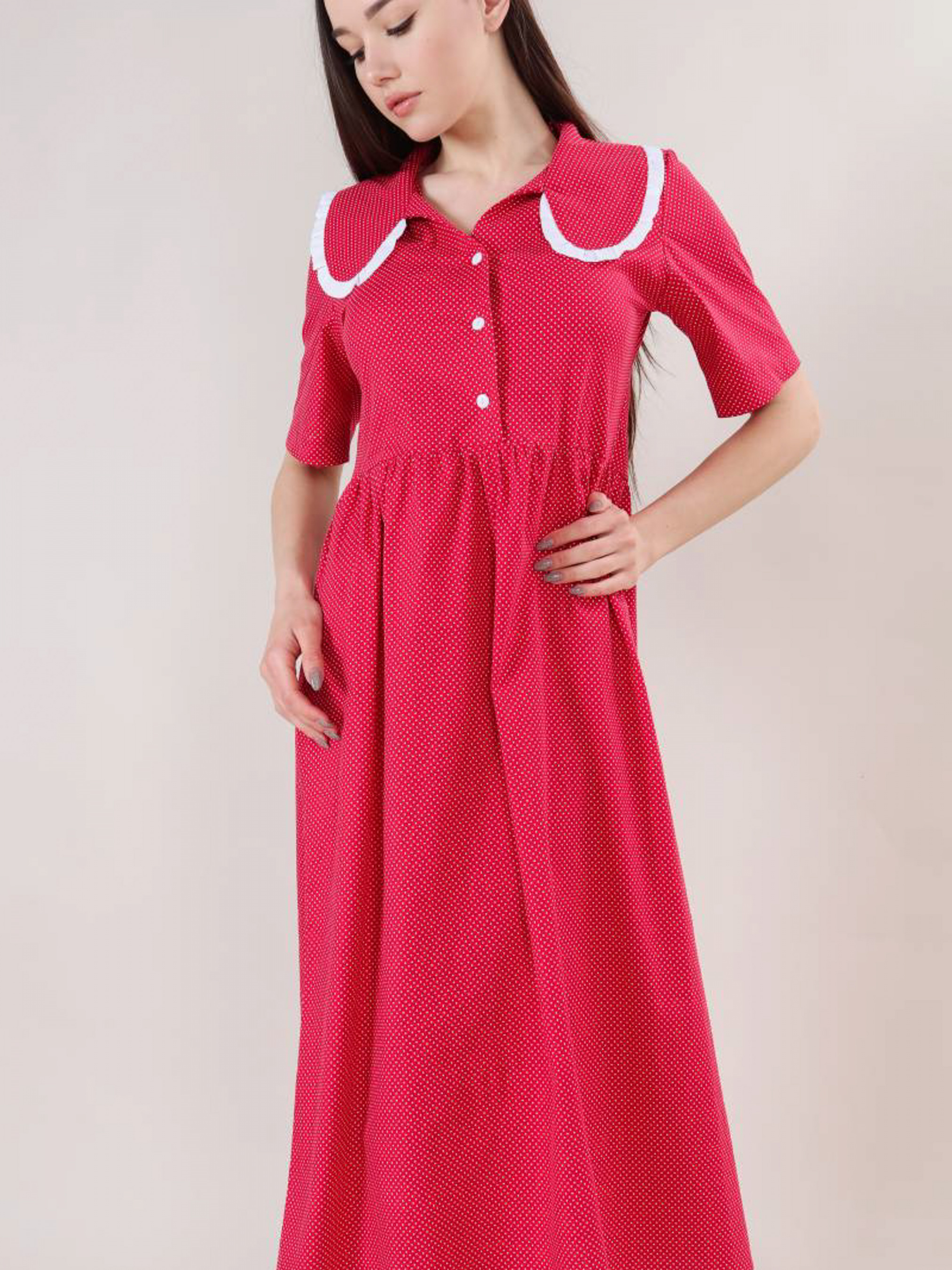 Ніжна і повітряна модель сукні довжини міді. Склад: 99% бавовна, 1% еластан. Рукава короткі, є комір. Футболка застібається на три гудзики по центру. Відмінний casual варіант для прогулянок, навчання або особливих зустрічей. XS-S : Довжина по спині : 120 см Довжина рукава : 37 см Напівобхват грудей : 43+ см Плечі : 37 см Напівобхват талії : 120 см S-M : Довжина по спині : 120 см Довжина рукава : 38 см Напівобхват грудей : 47+ см Плечі : 38 см Напівобхват талії : 120 см