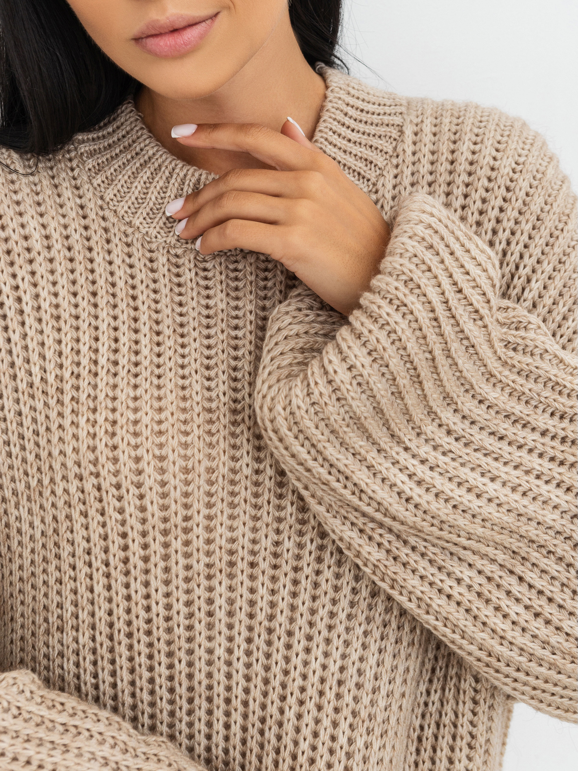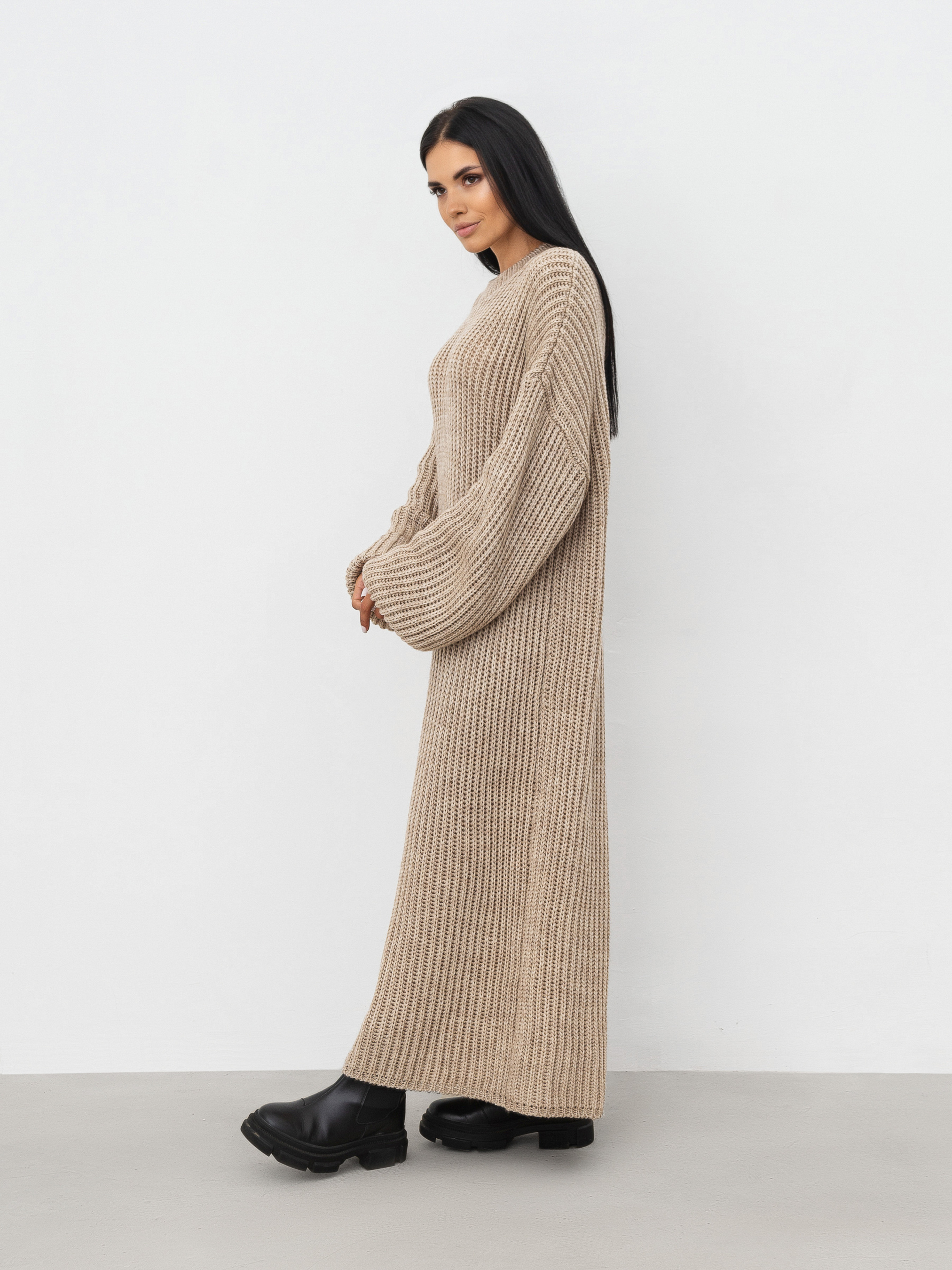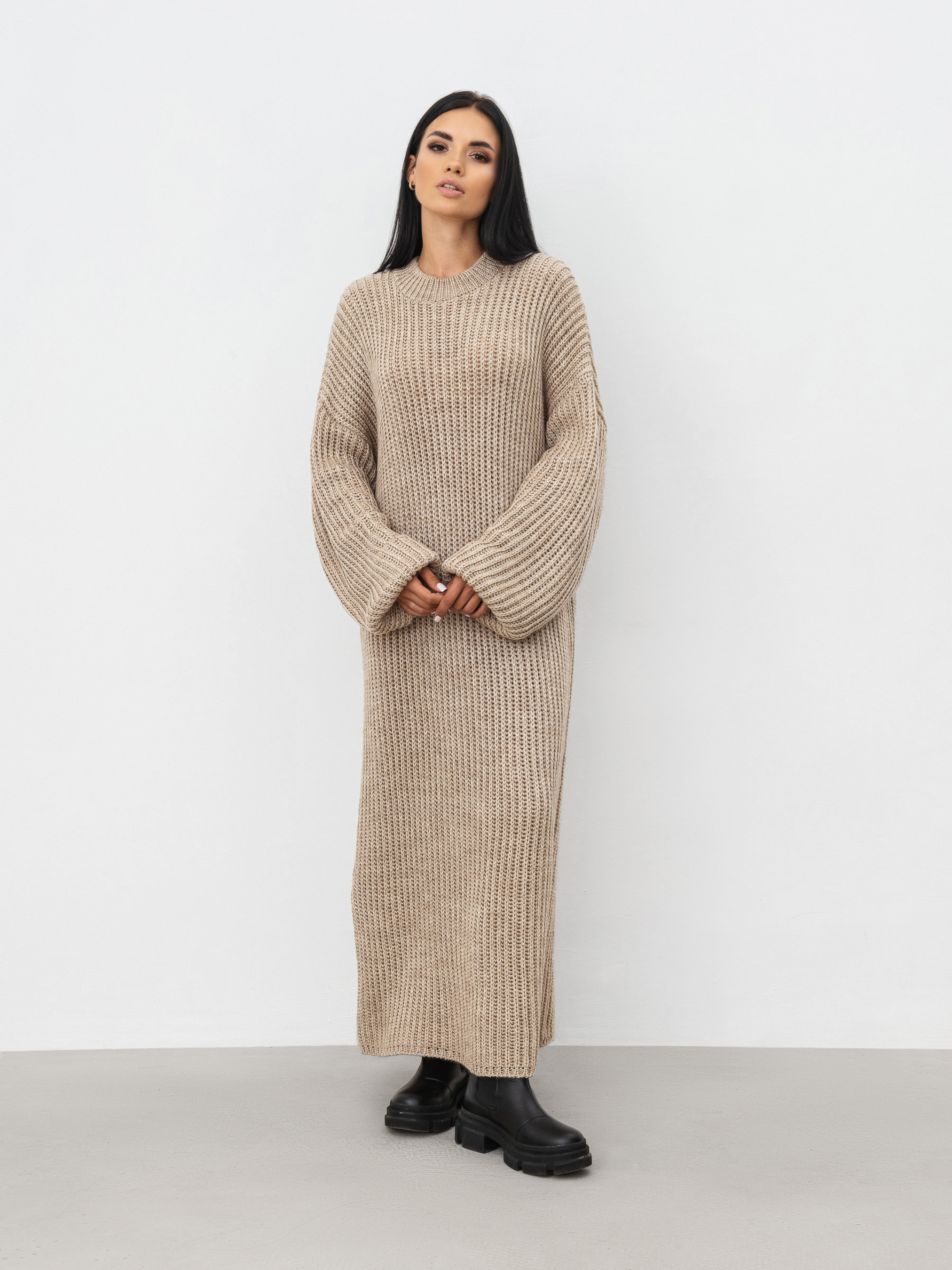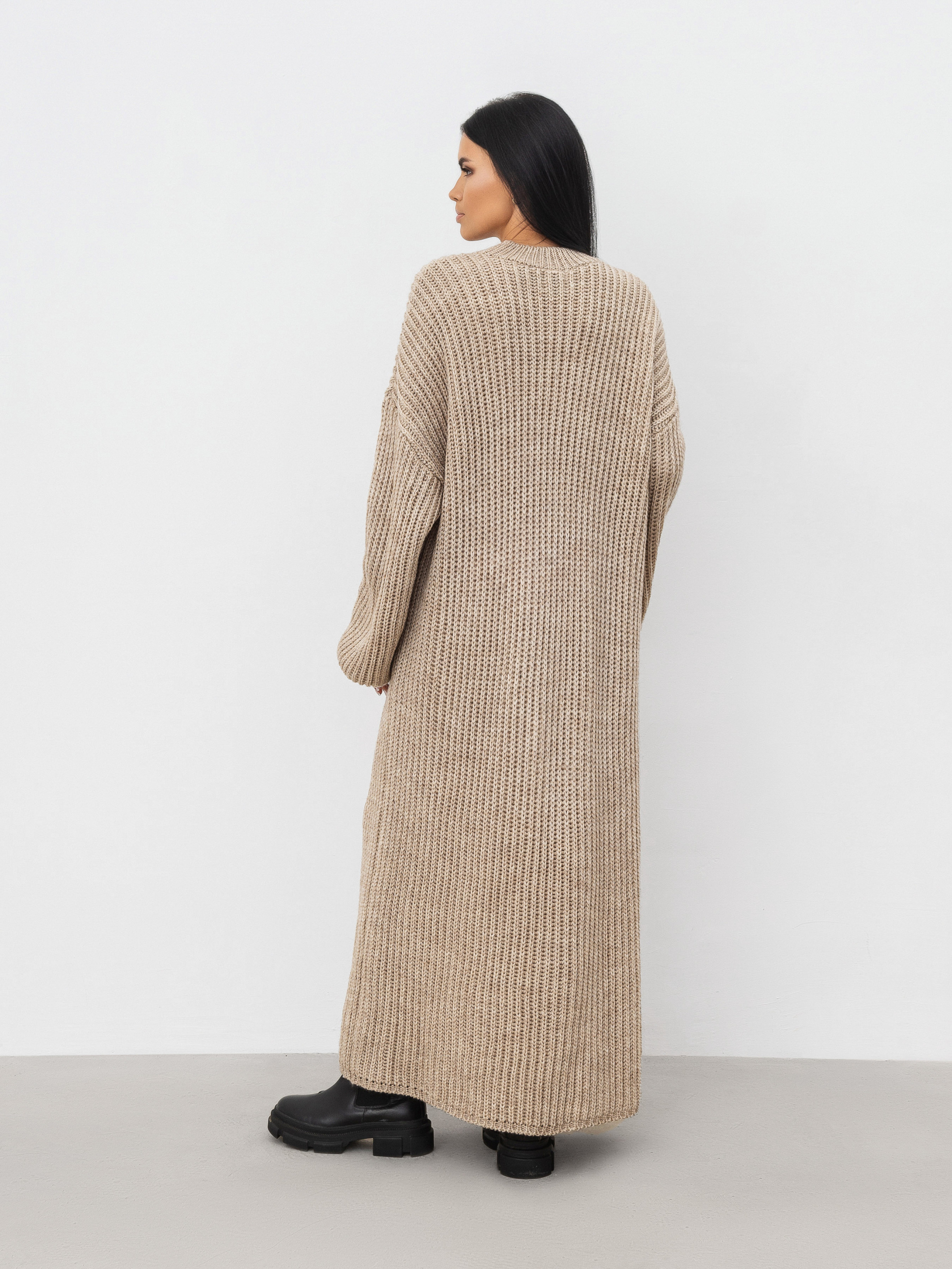 В'язана сукня довжини міді. Модель має актуальну об'ємну в'язку. У складі є шерсть. Комфортно сидить на тілі, не відчувається ""важкою"". Її можна комбінувати з будь-яким верхнім одягом, доповнюючи образ сумкою та аксесуарами. Довжина по спині : 110-115 см Довжина рукава : від спущеного шва 50 см Напівобхват грудей : 50 см Напівобхват стегон : 50 см Плечі : 60 см