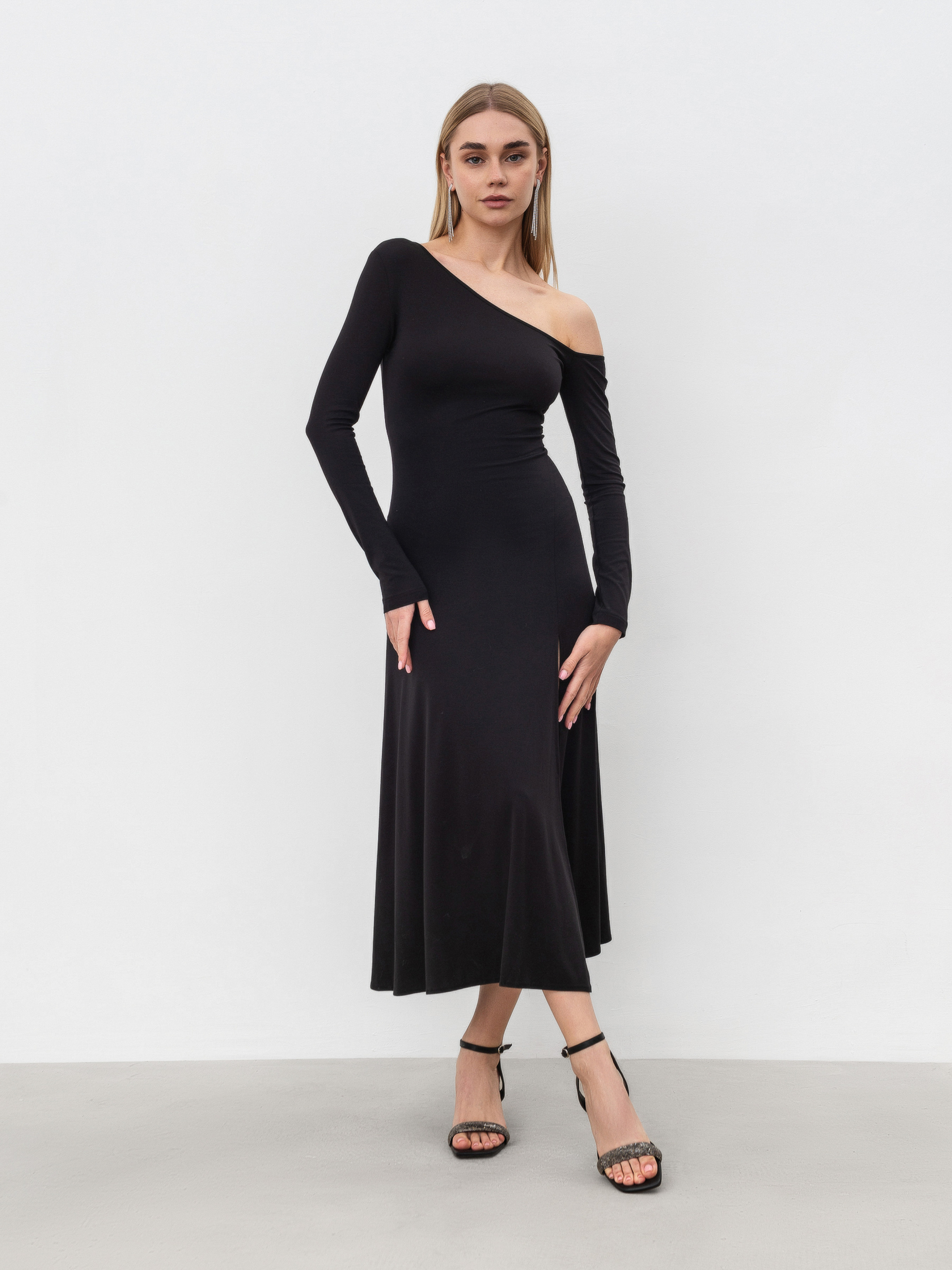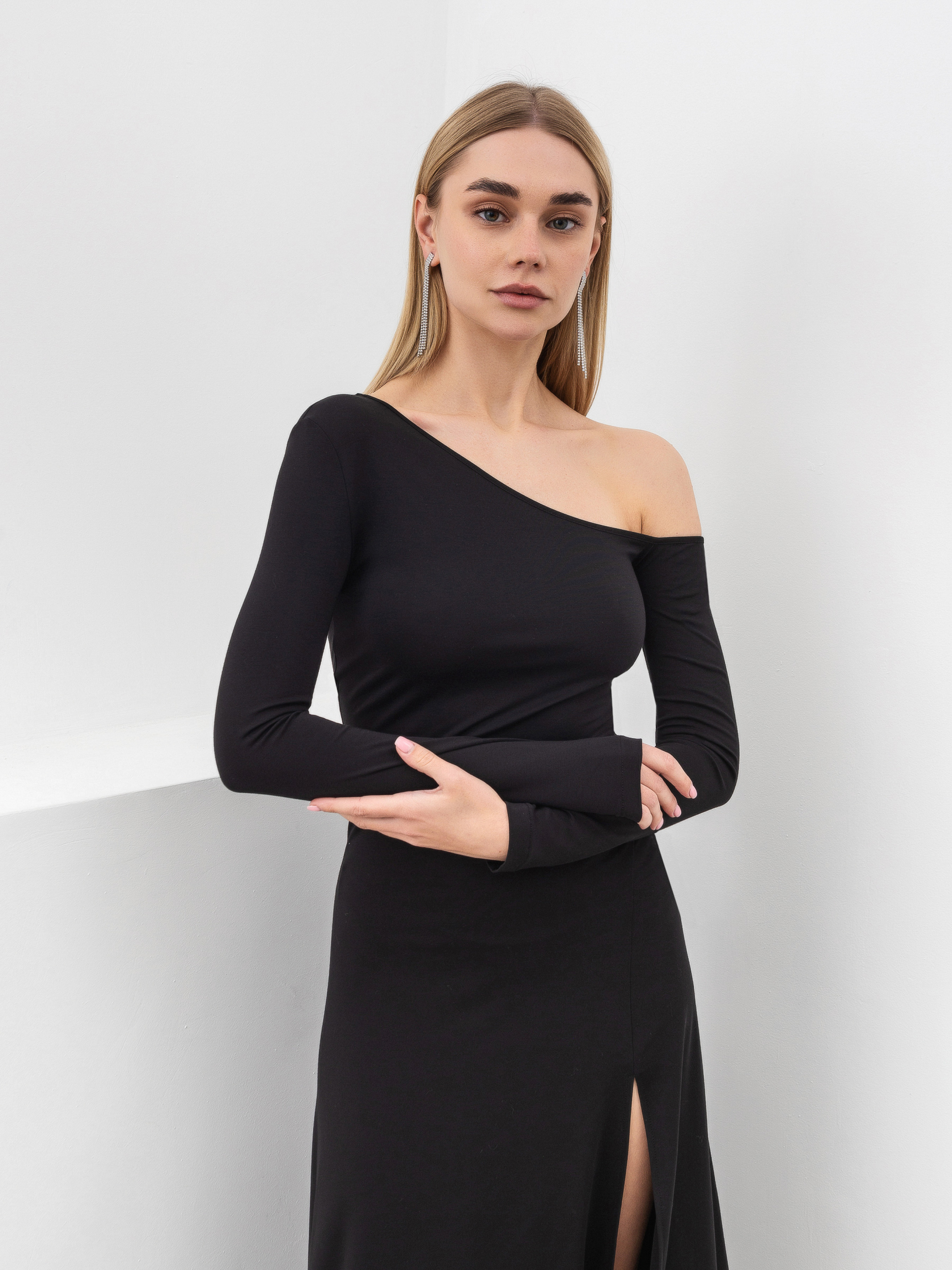 Сукня прилеглого силуету з асиметричною горловиною. Довгі рукава. Відрите одне плече за рахунок асиметрії. Розріз по спідниці, що виходить з фігурного шва. Еластичний, приємний до тіла матеріал.