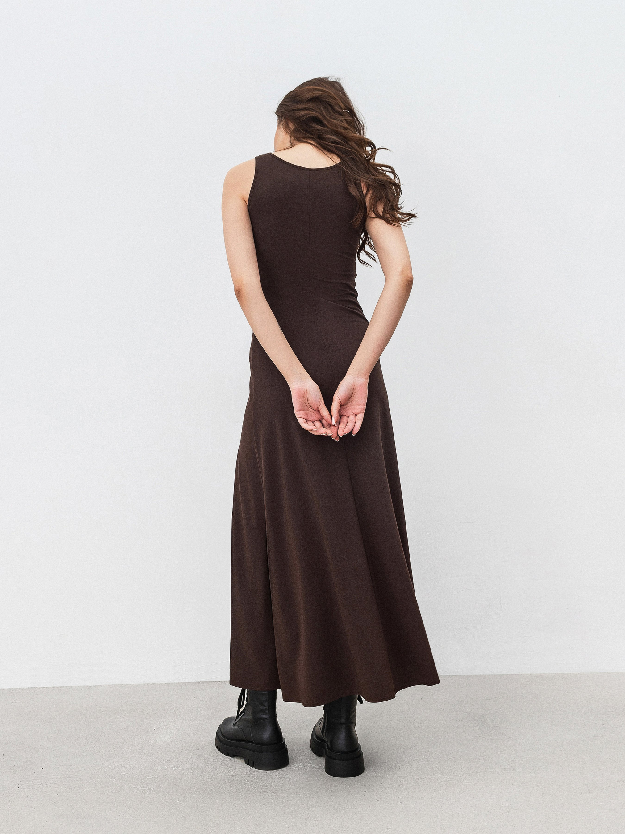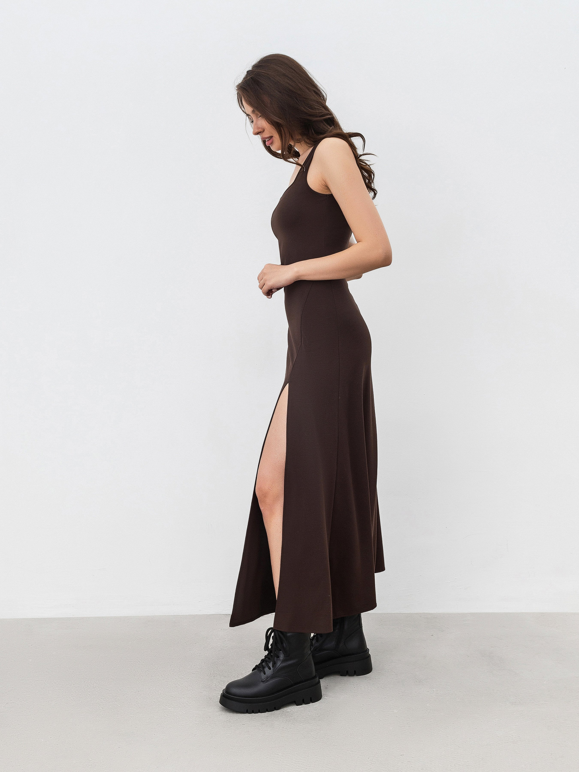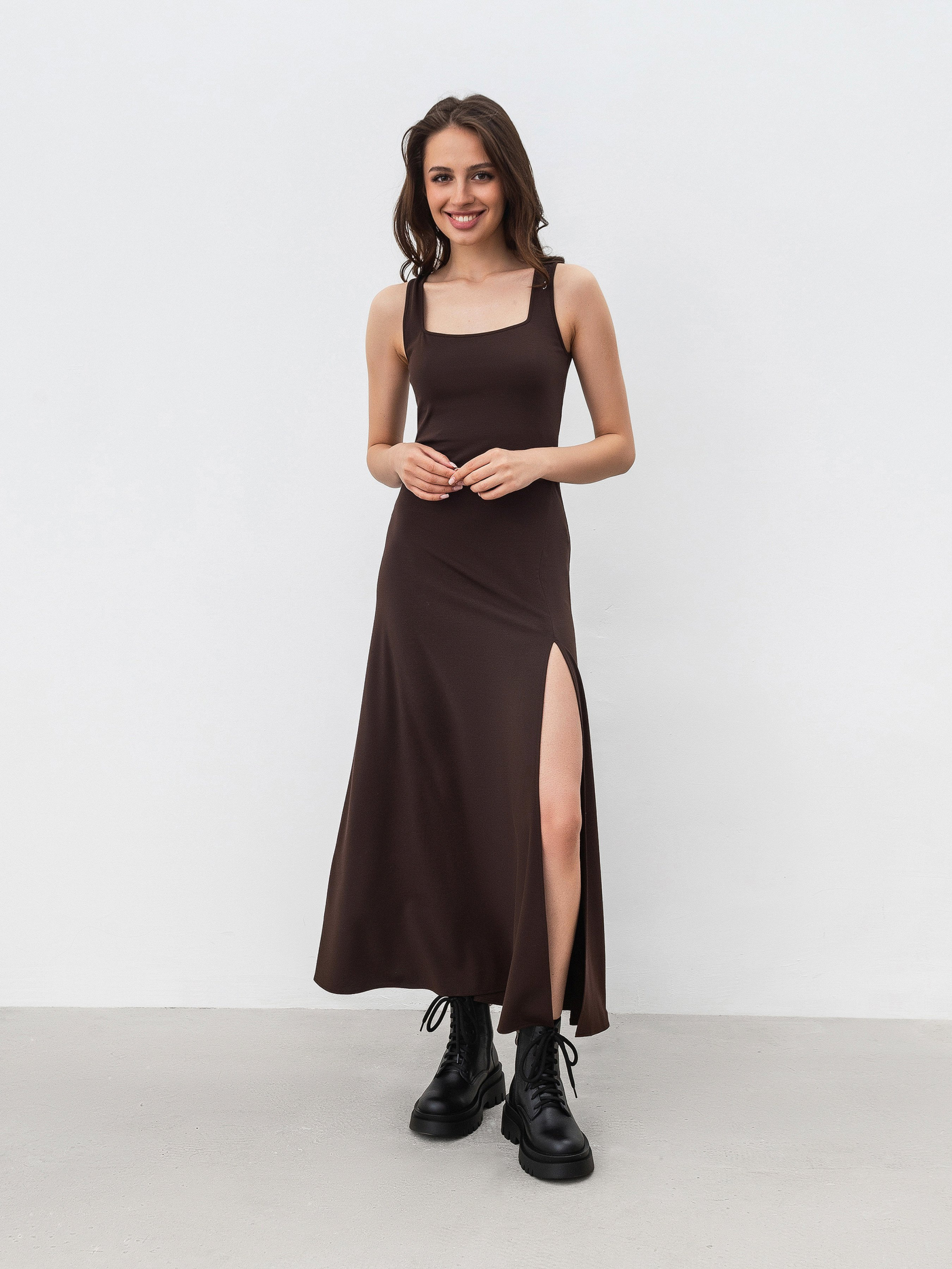 Сукня довжини міді. Спереду розріз на ніжці. Виріз м'який квадрат. Виготовлена з трикотажу, який має у складі великий вміст віскози, що робить виріб м'яким і приємним до тіла. Склад 65% віскоза 30% нейлон 5% спандекс. Базовий варінт сукні-майки під будь-який верх. XS|S:- Довжина по спині: 126 см; Напівобхват грудей: 36 см; Ширина плечей: 27 см; Напівобхват талії: 33 см, S|M:- Довжина по спині: 126 см; Напівобхват грудей: 37 см; Ширина плечей: 28 см; Напівобхват талії: 35 см, M|L:- Довжина по спині: 127 см; Напівобхват грудей : 39 см; Ширина плечей : 29 см; Напівобхват талії : 36 см, L|XL:- Довжина по спині : 128 см; Напівобхват грудей : 41 см; Ширина плечей : 30 см; Напівобхват талії : 38 см, XL|XXL:- Довжина по спині : 129 см; Напівобхват грудей : 42 см; Ширина плечей : 31 см; Напівобхват талії : 39 см.