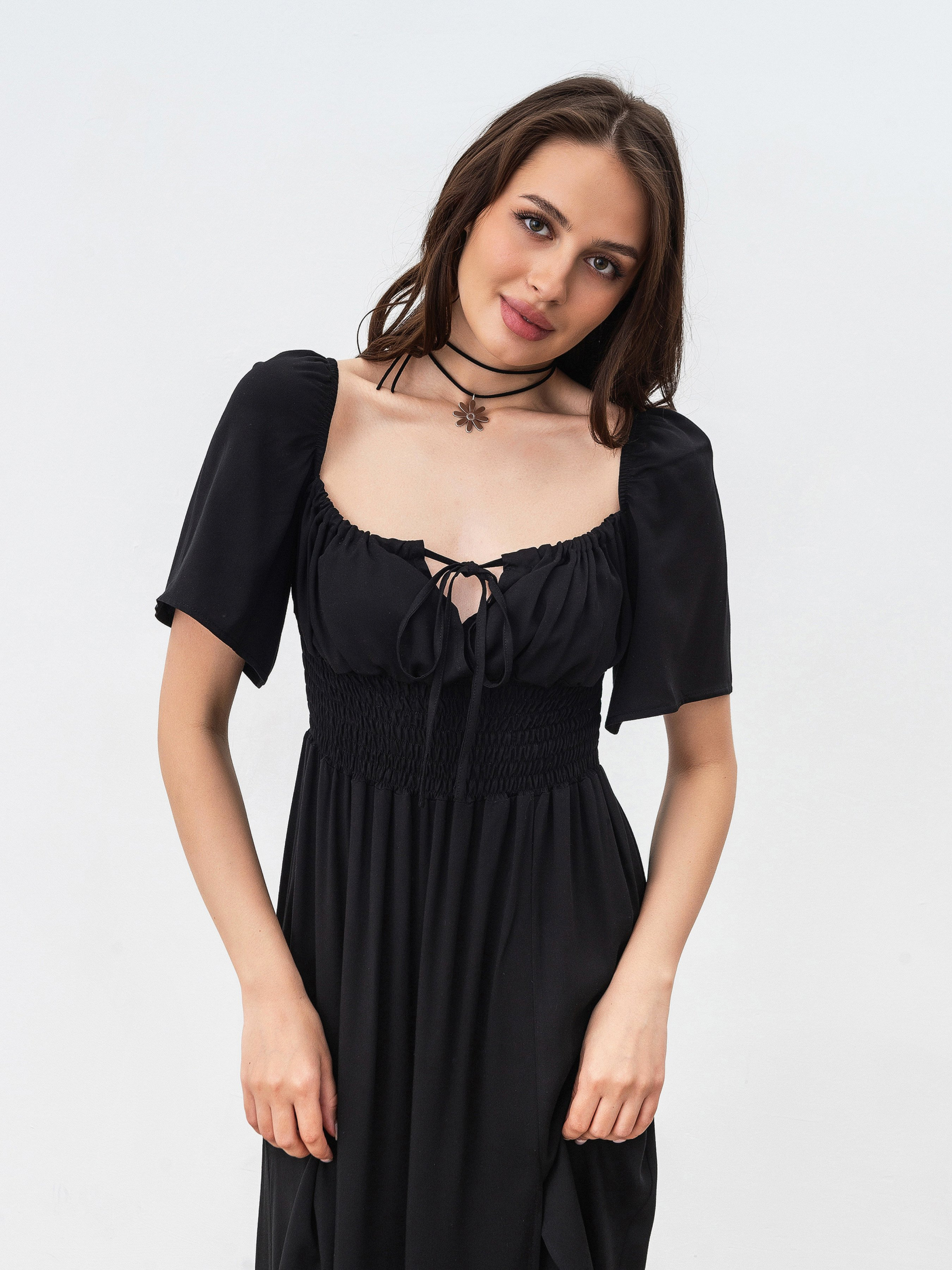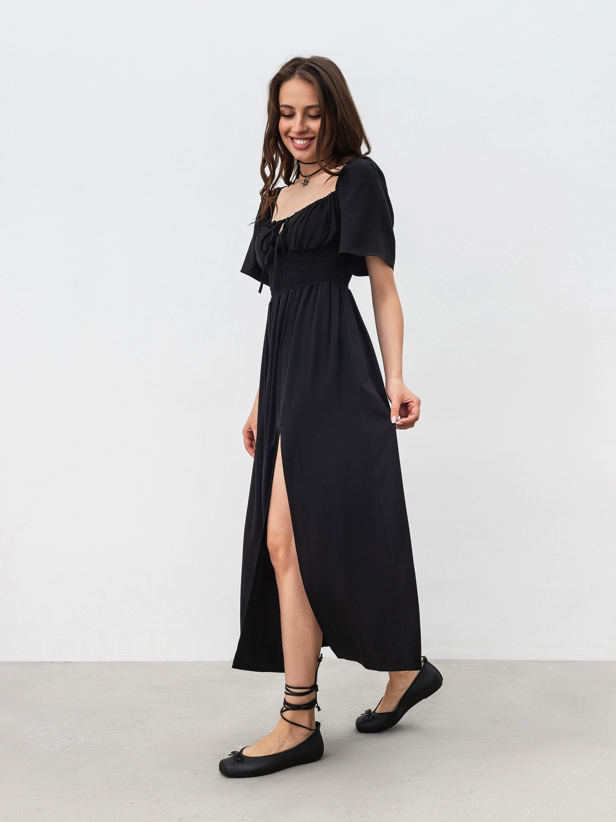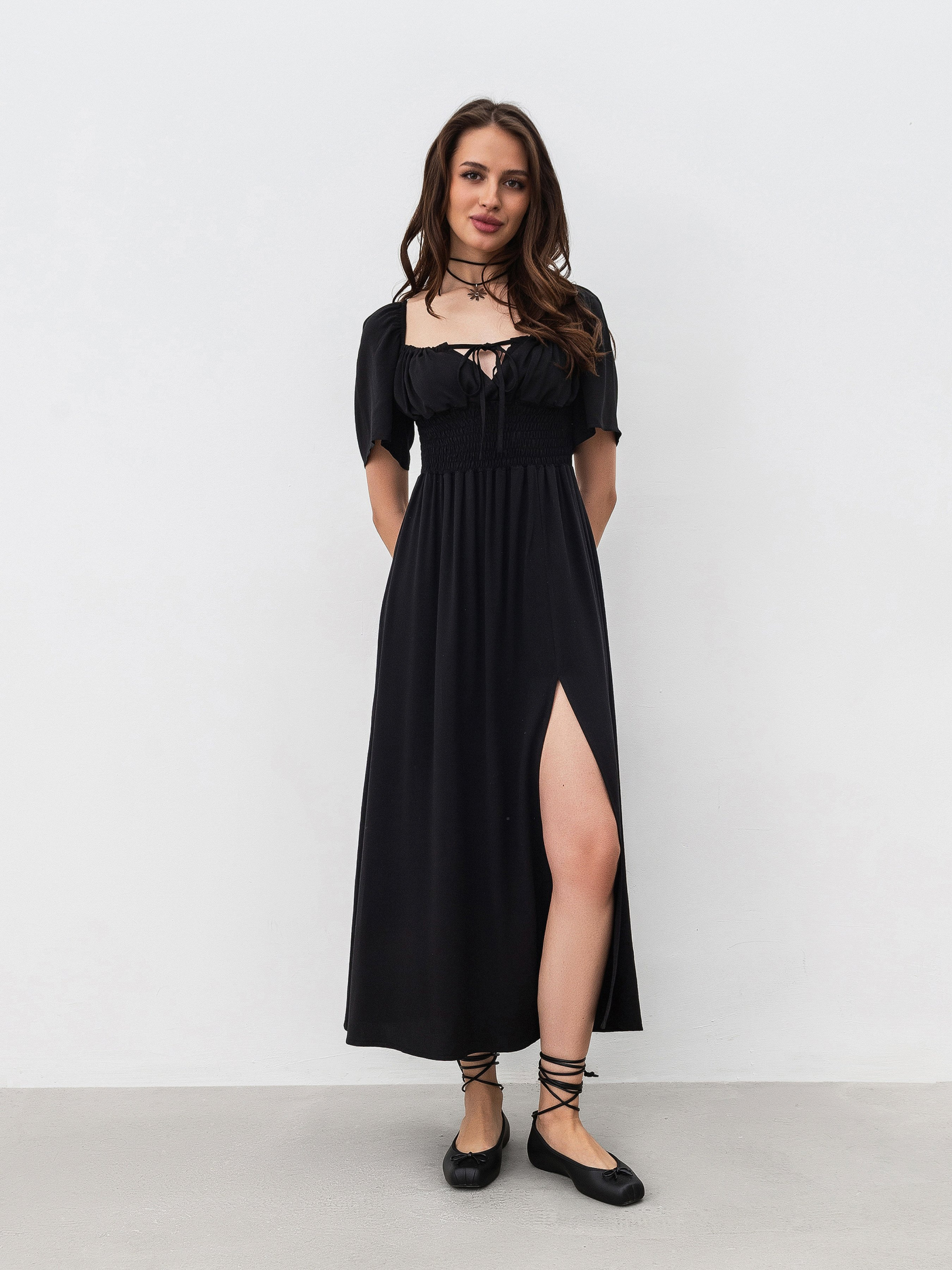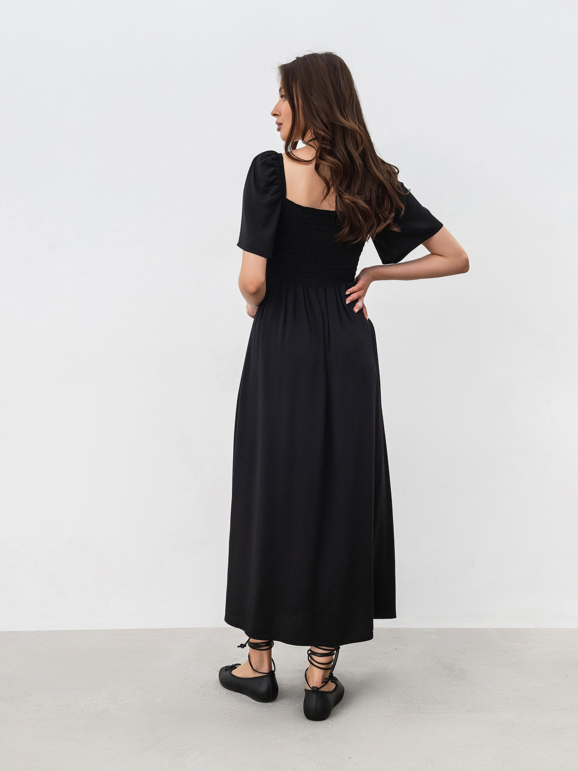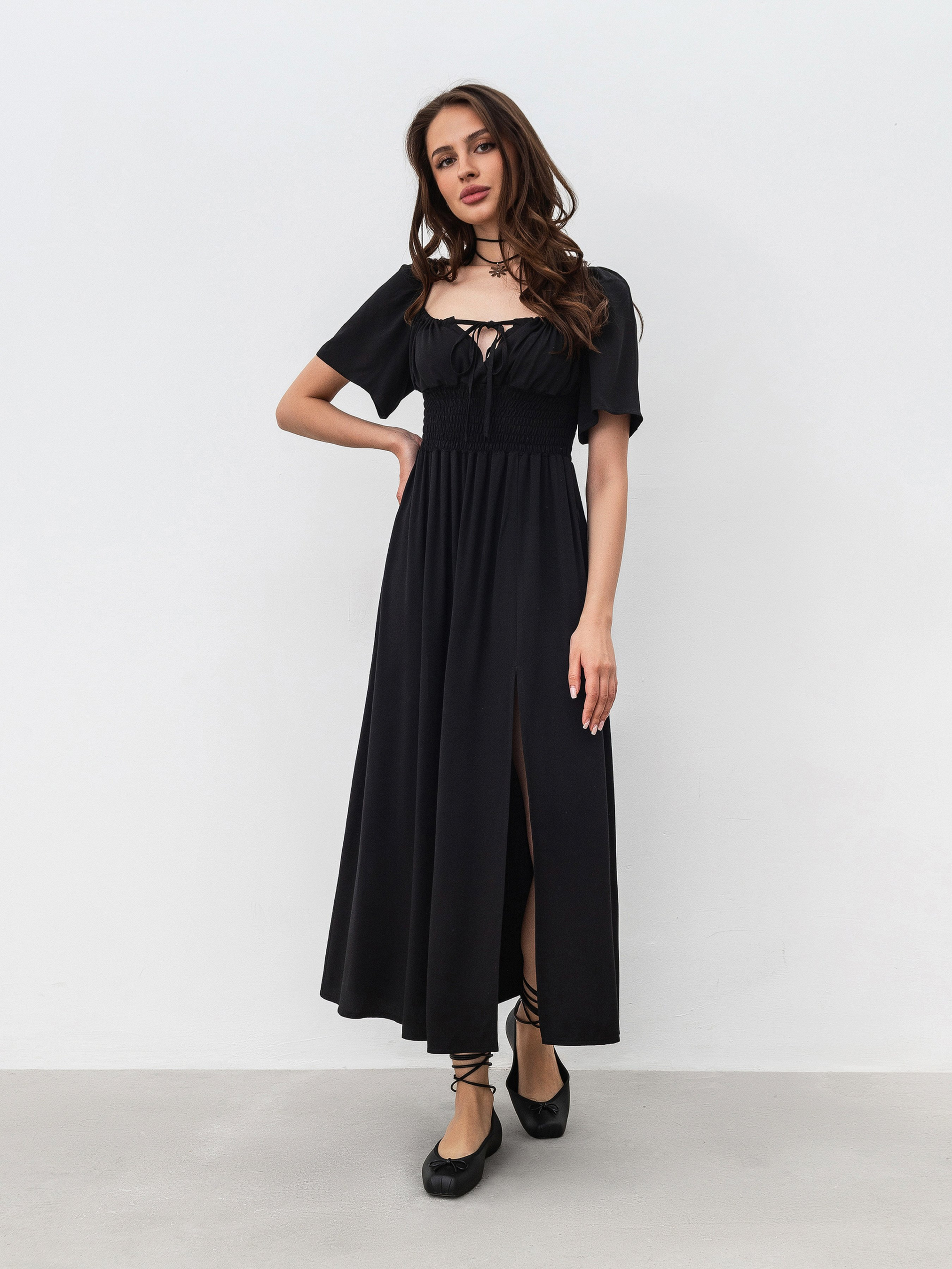Романтична сукня довжини міді. На талії є резинка, що дає змогу підлаштовувати посадку під різні параметри фігури. На грудях є куліска, тому теж можна регулювати все за своїми вподобаннями та комфортом. На ніжці йде розріз вище коліна. Матеріал: 100% віскоза, тому сукня комфортно сидить на тілі. Фасон універсальний, тому його можна поєднувати з різним взуттям, тим самим створюючи образи протилежних вайбів. XS|S:- Довжина по спині: 114 см; Довжина рукава: 27 см; Напівобхват грудей: 28 см (резинка); Ширина плечей: 38 см; Напівобхват талії: 29 см (резинка), S|M:- Довжина по спині: 114 см; Довжина рукава: 27 см; Напівобхват грудей: 31 см (резинка); Ширина плечей: 39 см; Напівобхват талії: 30 см (резинка), M|L: - Довжина по спині: 115 см; Довжина рукава: 27 см; Напівобхват грудей: 35 см (гумка); Ширина плечей: 40 см; Напівобхват талії: 34 см (гумка), L|XL:- Довжина по спині: 115 см; Довжина рукава: 27 см; Напівобхват грудей: 37 см (гумка); Ширина плечей: 41 см; Напівобхват талії: 36 см (гумка).