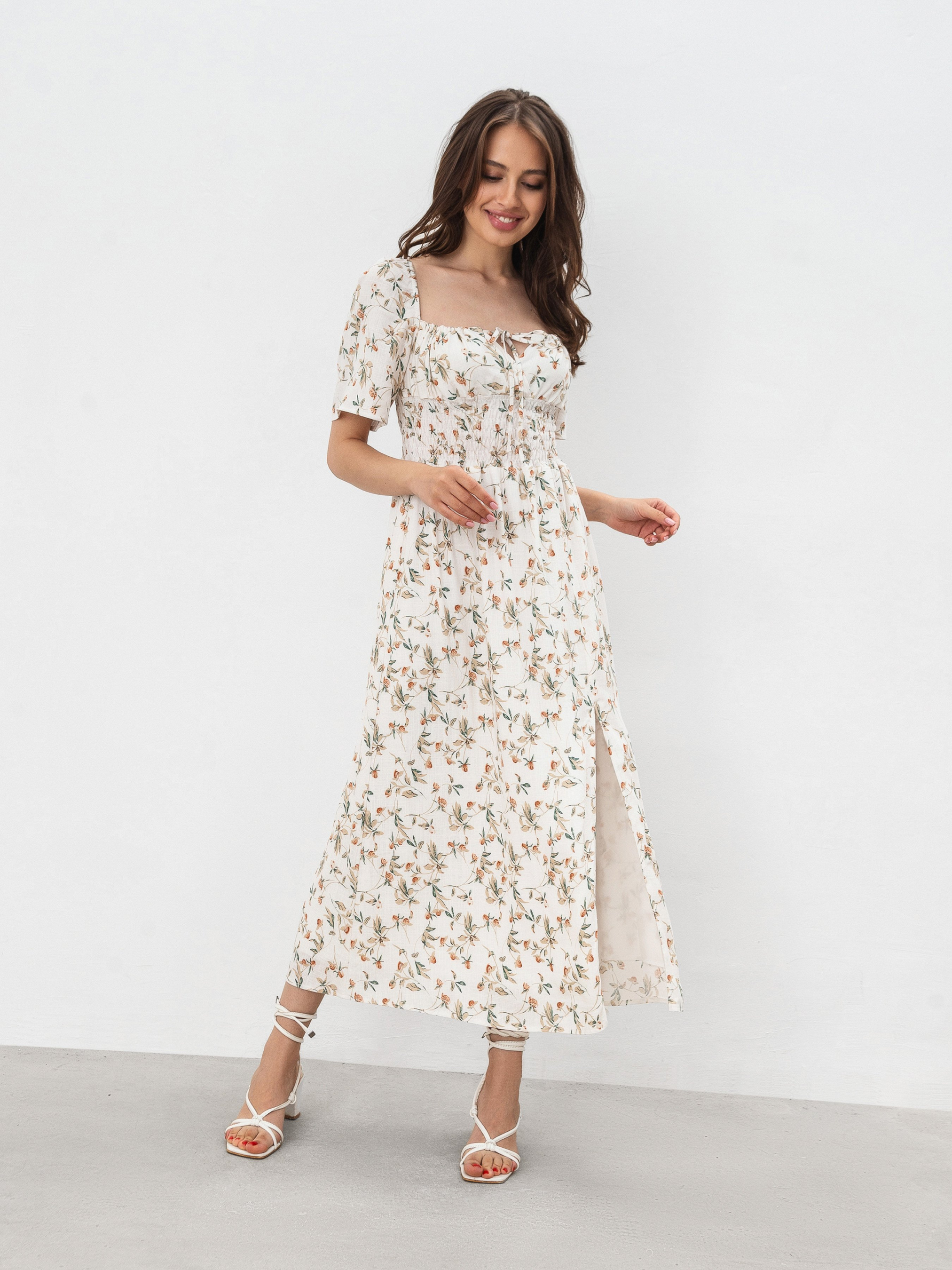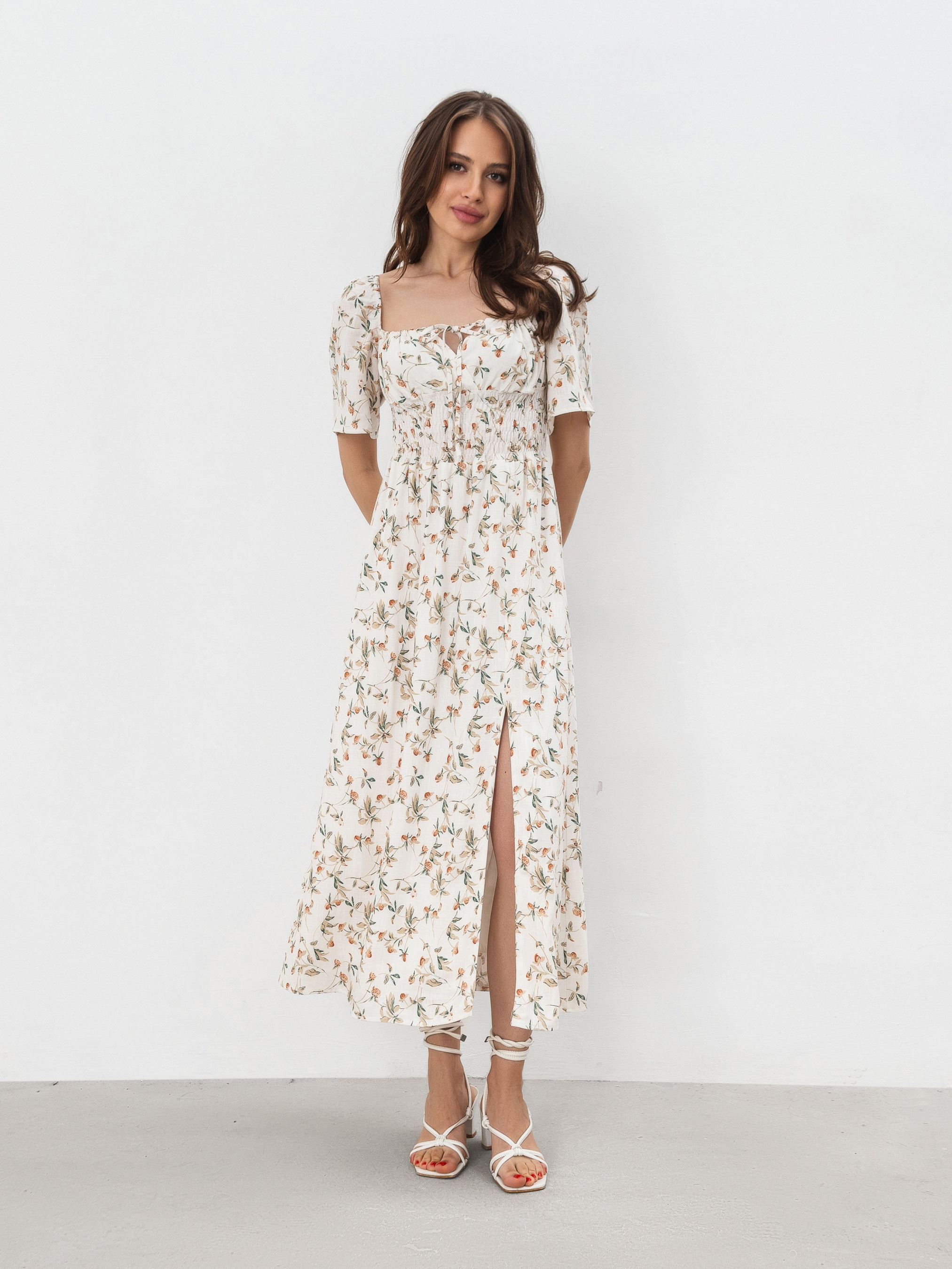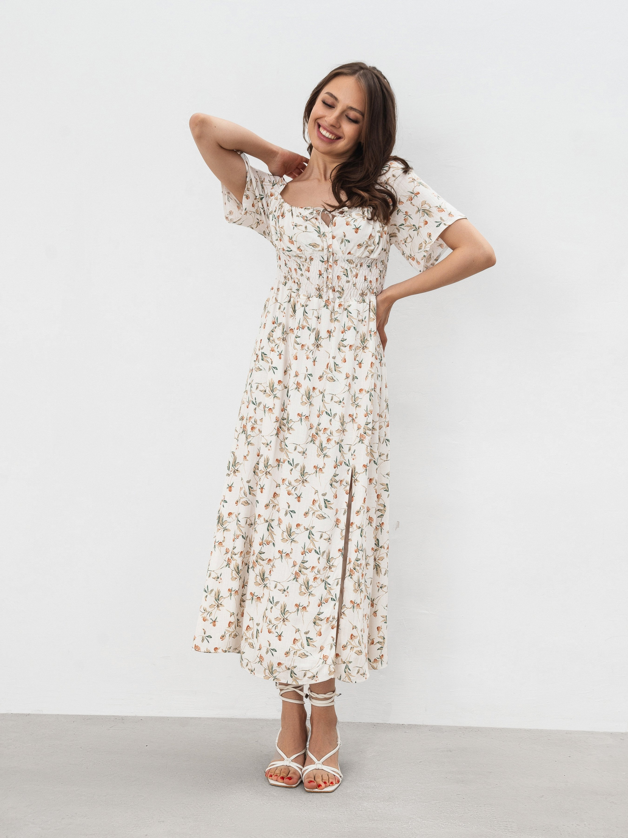 Сукня довжини міді. Виготовлена зі змішаного льону, який у складі має 70% віскози та 30% льону. Підкладка виконана зі 100% віскози - м'яка та приємна до тіла. На талії є резинка, що дає змогу підлаштовувати посадку під різні параметри фігури. На грудях куліска, тому теж можна регулювати за потреби. На ніжці йде розріз. Рукав короткий, не доходить до ліктя. Ніжний варіант сукні для теплої погоди. Можна комбінувати з різним взуттям і отримувати більш повсякденні або романтичні луки. XS|S:- Довжина по спині: 115 см; Довжина рукава: 26 см; Напівобхват стегон: 52 см; Напівобхват грудей: 30 см; Ширина плечей: 30 см; Напівобхват талії: 27 см (гумка), S|M:- Довжина по спині: 115 см; Довжина рукава: 26 см; Напівобхват стегон: 54 см; Напівобхват грудей: 31 см; Ширина плечей: 31 см; Напівобхват талії: 29 см (гумка), M|L: - Довжина по спині: 115 см; Довжина рукава: 26 см; Напівобхват стегон: 55 см; Напівобхват грудей: 35 см; Ширина плечей: 33 см; Напівобхват талії: 34 см (гумка), L|XL:- Довжина по спині: 115 см; Довжина рукава: 26 см; Напівобхват стегон: 57 см; Напівобхват грудей: 38 см; Ширина плечей: 35 см; Напівобхват талії: 37 см (гумка).