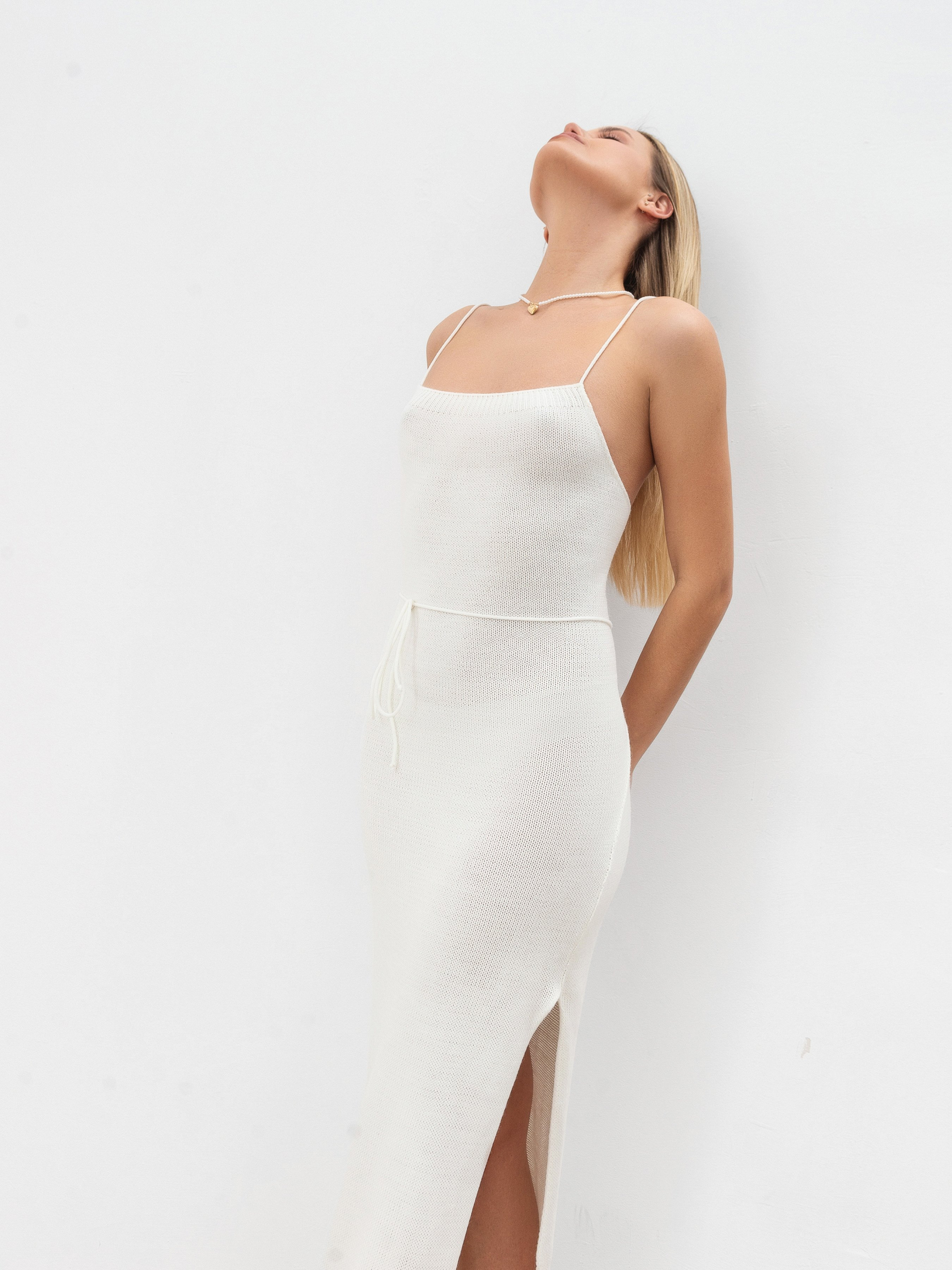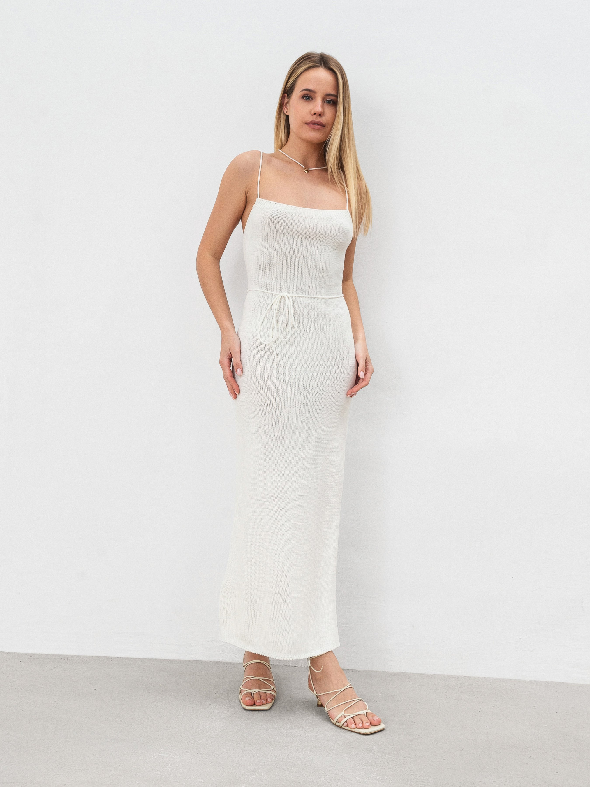 Сукня довжини міді з приємного до тіла матеріалу. Склад матеріалу в'язки: 65% поліестер, 30% бавовна, 5% спандекс. Тканина щільна, проте еластична. На спинці є зав'язки, якими можна регулювати посадку. Збоку є розріз для комфортної ходьби. Модель на тонких бретелях. Ніжний варіант сукні на теплу погоду. Доповнювати можна тренчем або оверсайз піджаком. XS|S:- Довжина по спині: 113 см; Напівобхват стегон: 40 см; Напівобхват грудей: 24 см; Напівобхват талії: 32 см, M|L:- Довжина по спині: 116 см; Напівобхват стегон: 41 см; Напівобхват грудей: 25 см; Напівобхват талії: 35 см.