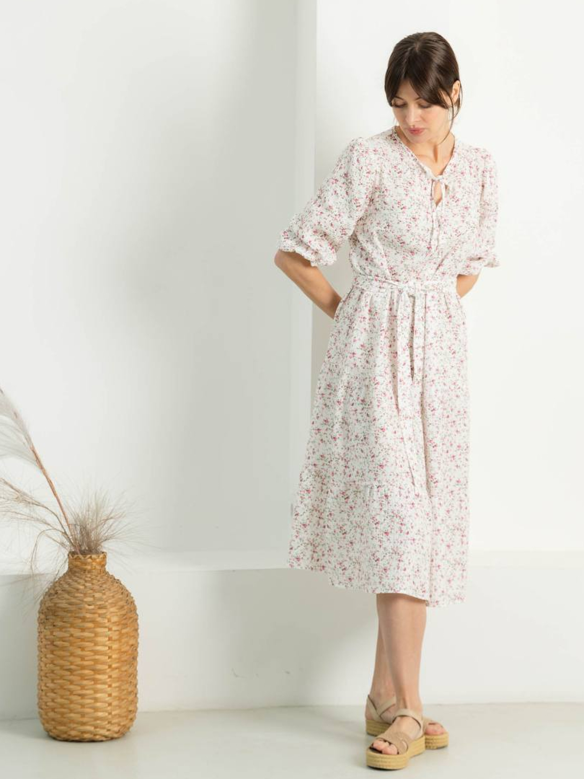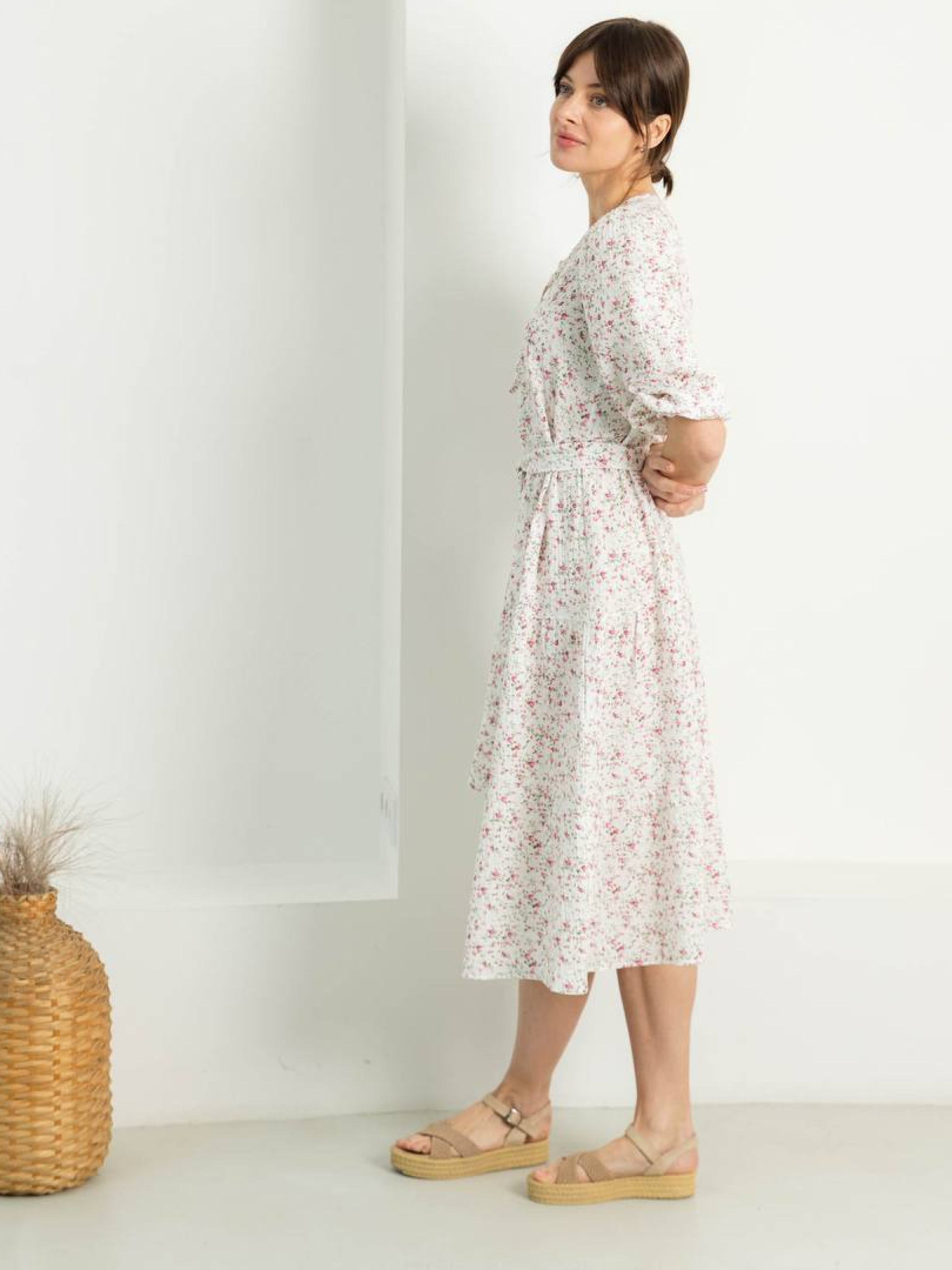 Літня сукня Ця сукня — ідеальний вибір для теплих весняних та літніх днів. Виготовлена з натурального мусліну, вона забезпечує приємне відчуття прохолоди та свободи рухів. Вільний фасон з кльошованою спідницею створює елегантний силует, а декоративні волани та розріз спереду додають вишуканості. Рукави 3/4 і пояс підкреслюють жіночність та комфорт Основні характеристики: • Матеріал: натуральний муслін — легкий, дихаючий, приємний до тіла. • Фасон: вільний, спідниця кльош. • Деталі: волани, рукав 3/4, пояс, декоративний розріз спереду. • Сезон: весна, літо. • Догляд: ручне прання при температурі до 30°C Розмірна сітка: S/M: Обхват грудей: 84-88см; Обхват талії: 68-72см; Обхват стегон: 92-96см; Довжина виробу: 120см; Довжина рукава: 43см; L/XL: Обхват грудей: 92-96см; Обхват талії: 76-81см; Обхват стегон: 100-105см; Довжина виробу: 121см; Довжина рукава: 44см; 2XL/3XL: Обхват грудей: 100-105см; Обхват талії: 86-91см; Обхват стегон: 110-115см; Довжина виробу: 123см; Довжина рукава: 46см; Поради щодо стилю: Ця сукня чудово поєднується з легкими сандалями або еспадрильями для створення повсякденного образу. Для більш елегантного вигляду оберіть туфлі на підборах та додайте витончені аксесуари. Замовляйте сукню Seventeen вже зараз та додайте до свого гардеробу стильний та комфортний елемент, який підкреслить вашу індивідуальність