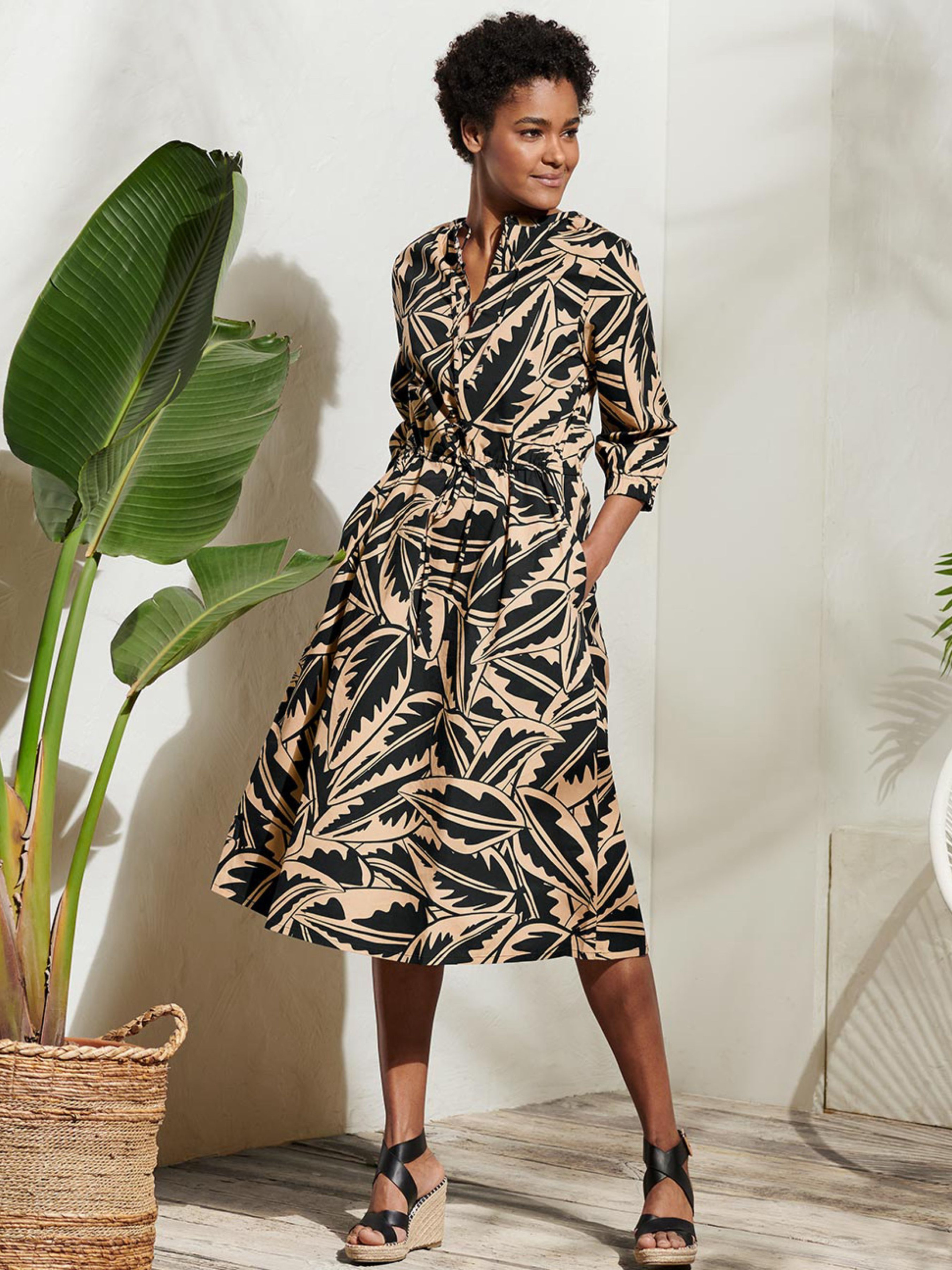 Легка якість виготовлена з високоякісного бавовняного попліну. Сертифіковано GOTS. Довжина міді. Прикріплена спідниця легкого А-силуету. Горловина з розрізом, 2 ґудзики та ремінець. Еластичні манжети на рівні талії. Рукав 3/4 з еластичними манжетами. Бічні кишені. Нагрудні дротики для оптимальної посадки. Повний принт пальмового листя. Перевірено на вміст шкідливих речовин – сторонніми акредитованими інститутами Зверніть увагу, вказано розміри за Євро шкалою (Український розмір = Євро + 6) Склад: 97% бавовна (органічна), 3% еластан (LYCRA®). Розмір 34 євро ПОГ: 44 см, ПОТ: 44 см, Напівобхват стегон: 59 см, Довжина рукава від плеча: 44 см, Довжина: 120 см. 36-38 євро ПОГ: 47 см, ПОТ: 47 см, Напівобхват стегон: 64 см, Довжина рукава від плеча: 44 см, Довжина: 120 см. Одяг бренду TCM Tchibo практично весь без паперових етикеток, за рідкісним винятком, і зі зрізаними частково або повністю внутрішніми бірками і ярликами зі складом тканини та іншими даними