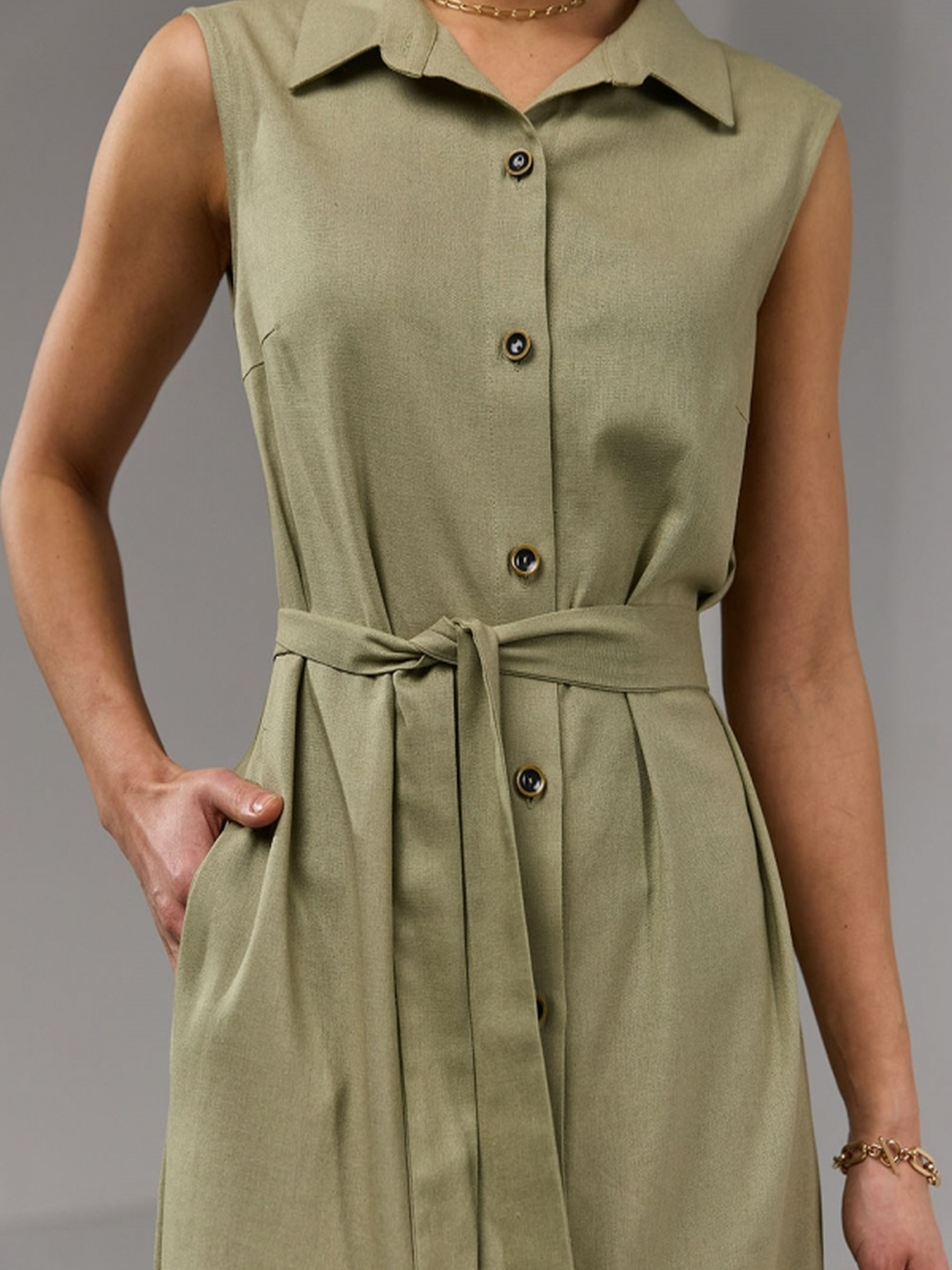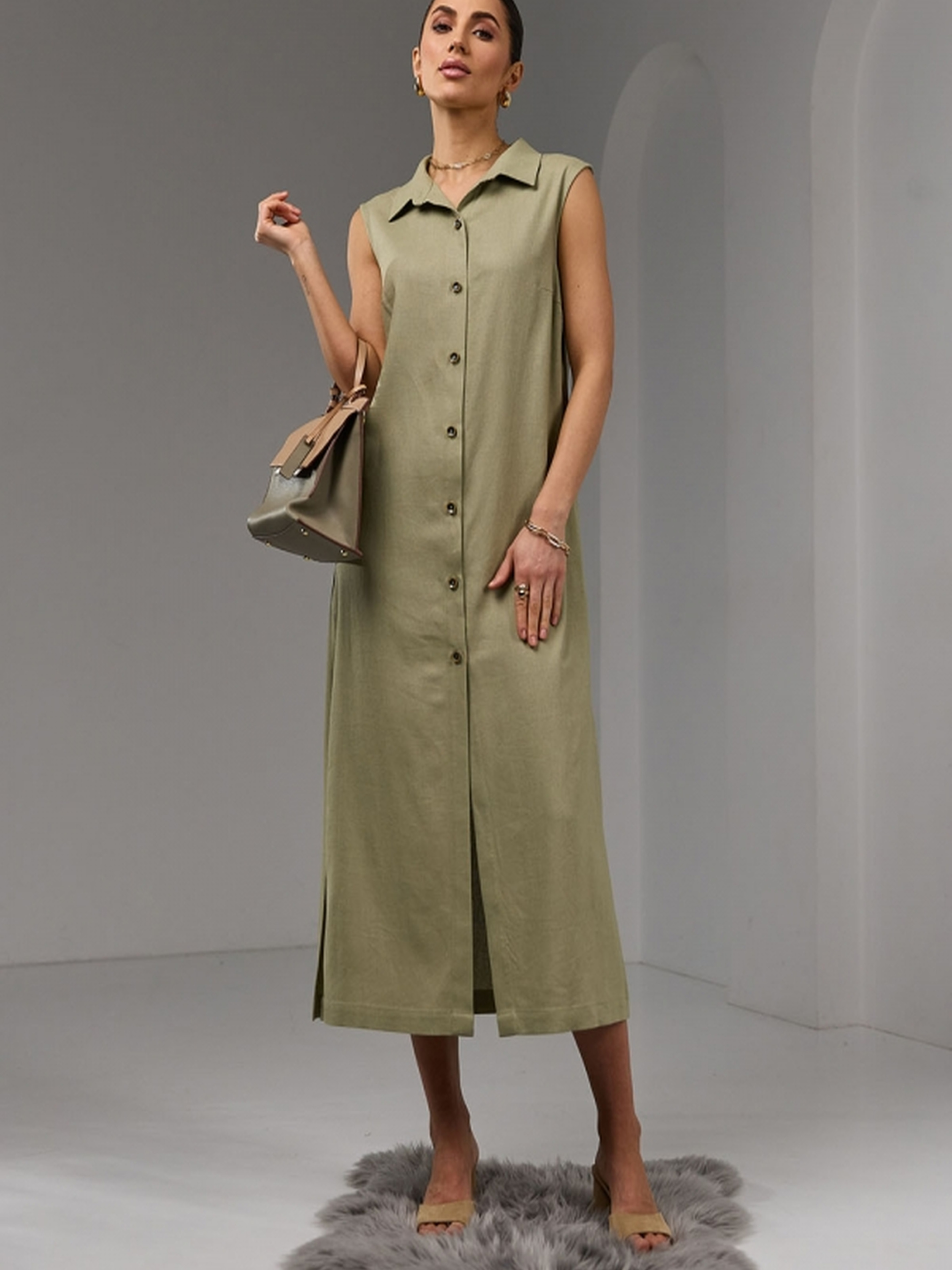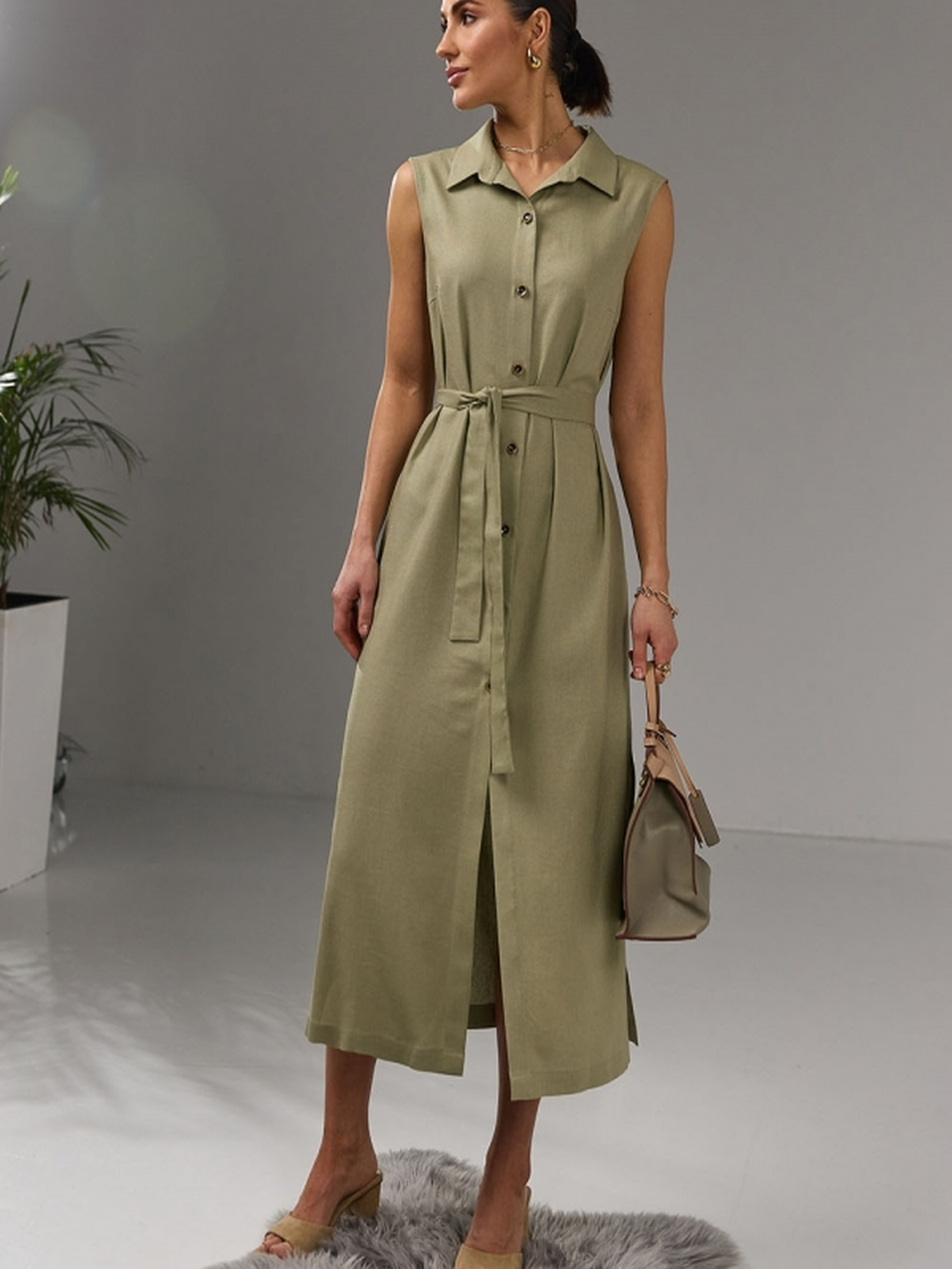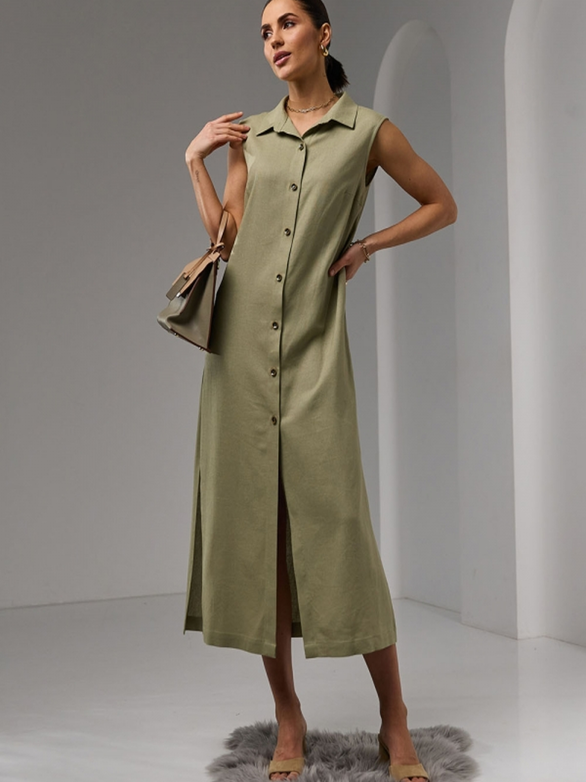 Жіноча подовжена сукня з легкої натуральної тканини з додаванням льону та віскози – ідеальний вибір для теплого сезону. Модель застібається на гудзики по всій довжині, має зручні кишені у бічних швах та пояс у комплекті, що дозволяє регулювати посадку по талії. Виріб дарує комфорт у щоденному носінні завдяки дихаючому матеріалу та вільному крою, підходить для прогулянок, подорожей або офісного стилю. • Матеріал: натуральна тканина з включенням льону та віскози • Силует: вільний з можливістю фіксації поясом • Довжина виробу: 125–128 см • Ширина під проймою: 46–56 см • Ширина у талії: 50–59 см • Ширина у стегнах: 53–63 см • Довжина розрізу: 40 см • Кишені: у бічних швах • Пояс у комплекті: довжина 153 см, ширина 4 см • Особливості: гудзики, натуральна тканина, комфортний крій Ця модель стане базовим елементом гардероба, який легко адаптується під різні стилі — від кежуал до романтичного.