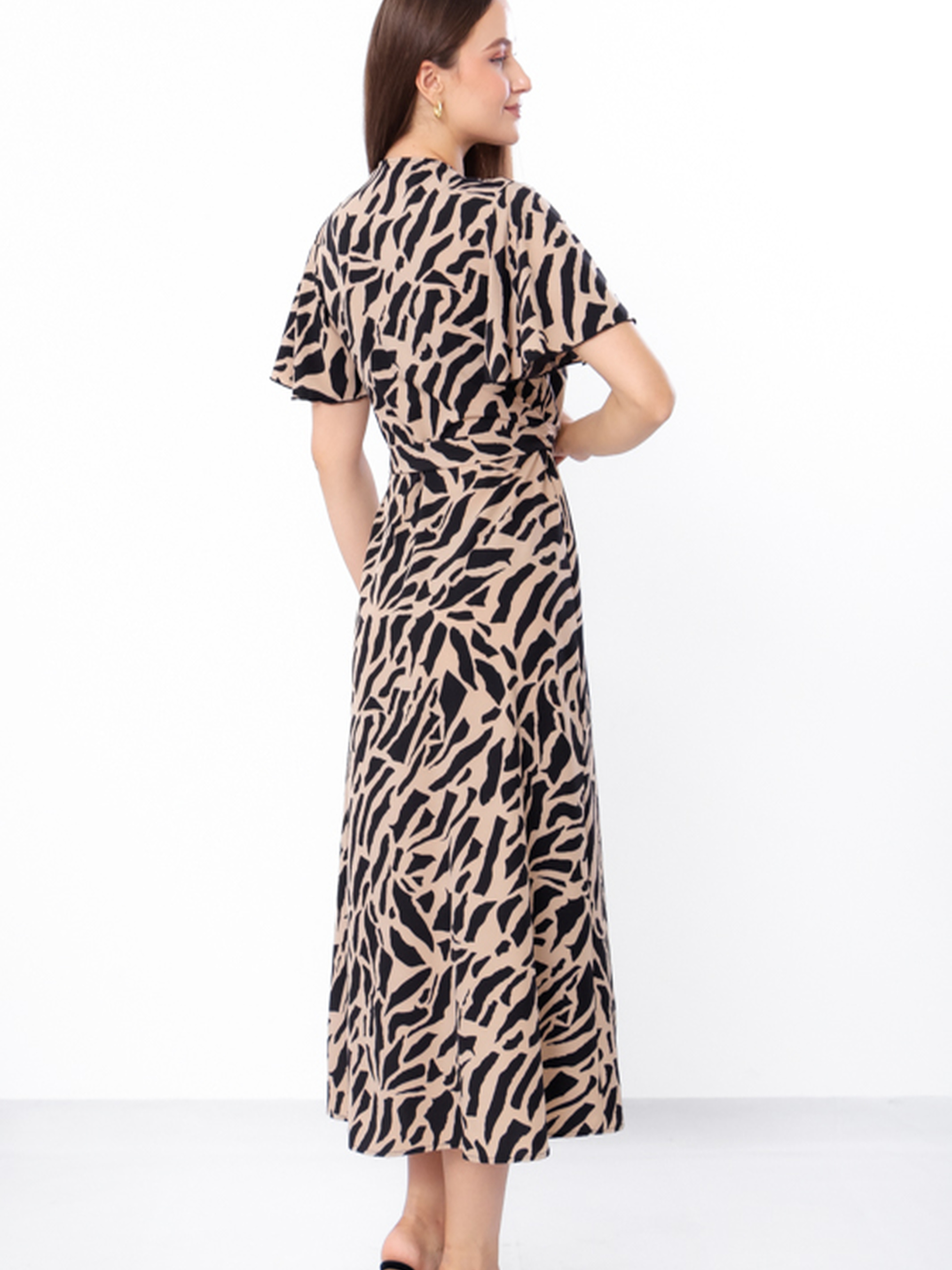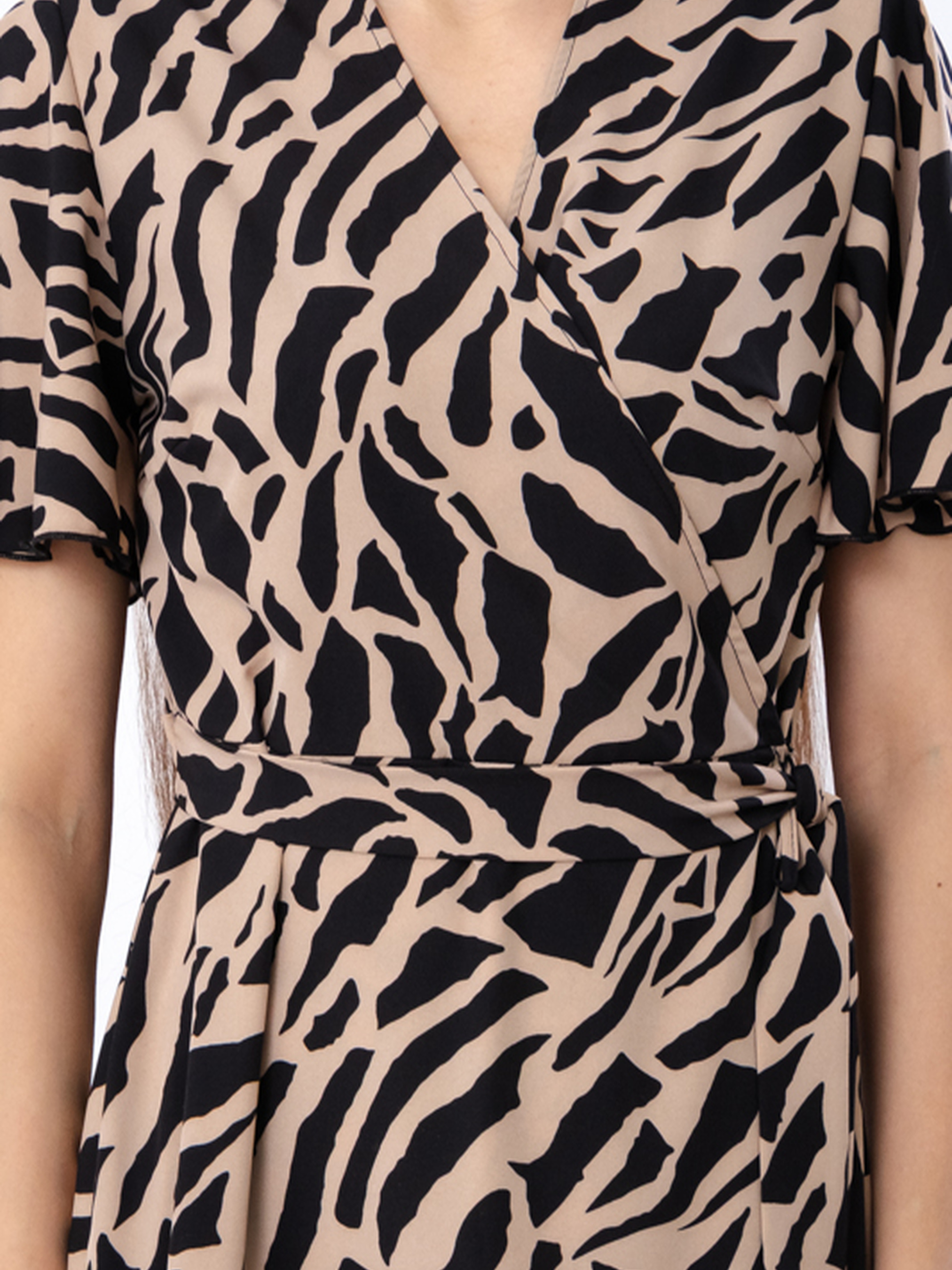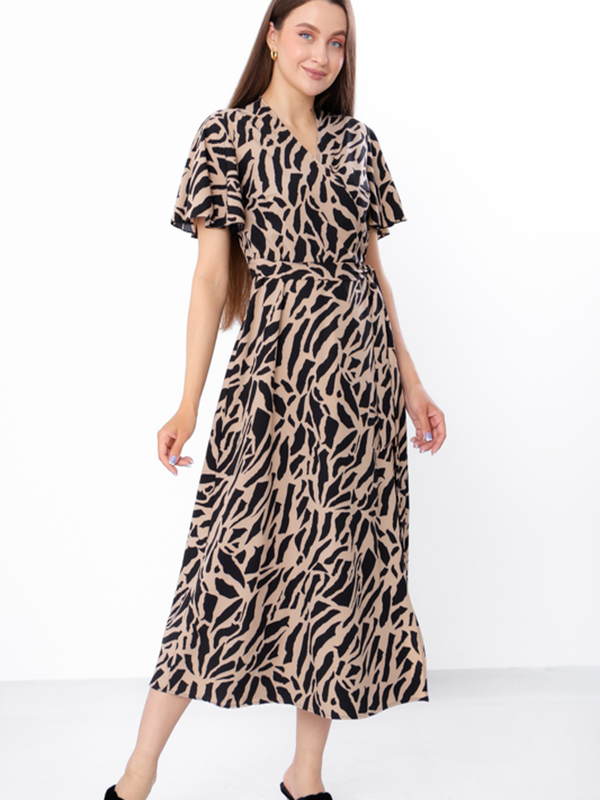 Полотно: софт принтований Склад полотна: 82% поліестер, 15% віскоза, 3% еластан Розмір: 44/46-52/54 модель створена для тих, хто цінує поєднання зручності з вишуканим стилем. Легка, дихаюча тканина з приємною текстурою забезпечує комфорт навіть у спекотні дні. Сукня струменить, не обтягує, підкреслює талію завдяки поясу і пасує різним типам фігури. Класичний фасон із запахом створює привабливу лінію декольте, а розкльошена спідниця додає легкості і жіночності. Короткий рукав із м’якою хвилею делікатно прикриває плечі, візуально роблячи руки стрункішими. Довжина — нижче коліна, що робить сукню універсальним варіантом для офісу, вечірніх прогулянок чи святкових подій.