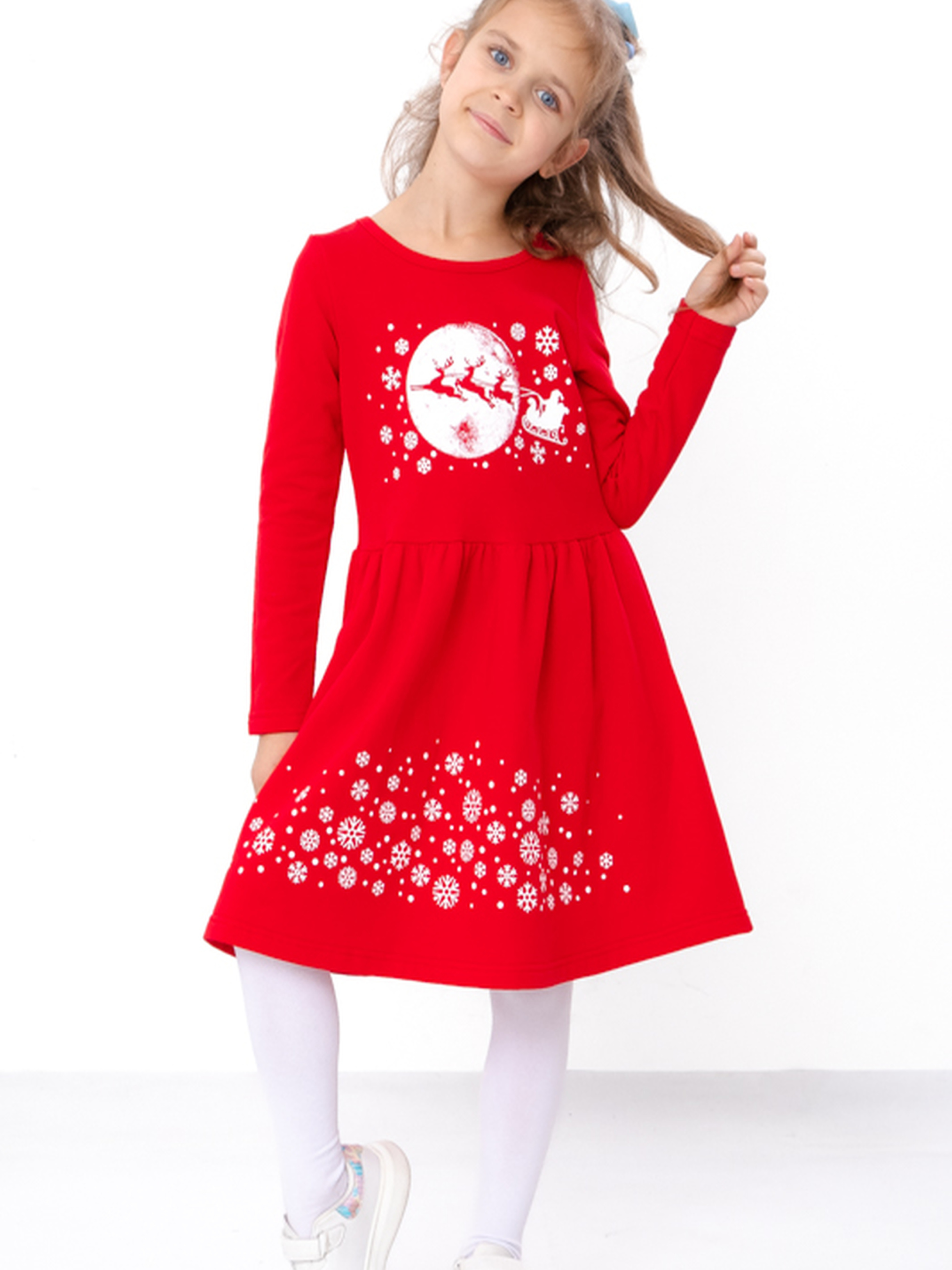 Полотно: начос однотонний Склад полотна: 100% бавовна Зріст: 92-134 Зимова сукня для дівчинки трапецієподібного крою це ідеальний вибір для холодного сезону. Модель виконана з якісного трикотажу начос однотонний сто відсотків бавовна що забезпечує тепло комфорт і ніжний стиль. Начос на внутрішній стороні зберігає тепло навіть у прохолодну погоду. Сукня має трапецієподібний крій із завищеною талією та злегка розкльошеною спідницею що виглядає святково та зручно. Новорічний принт додає чарівності. М’яка тканина не сковує рухів а довгі рукави надійно захищають від холоду.