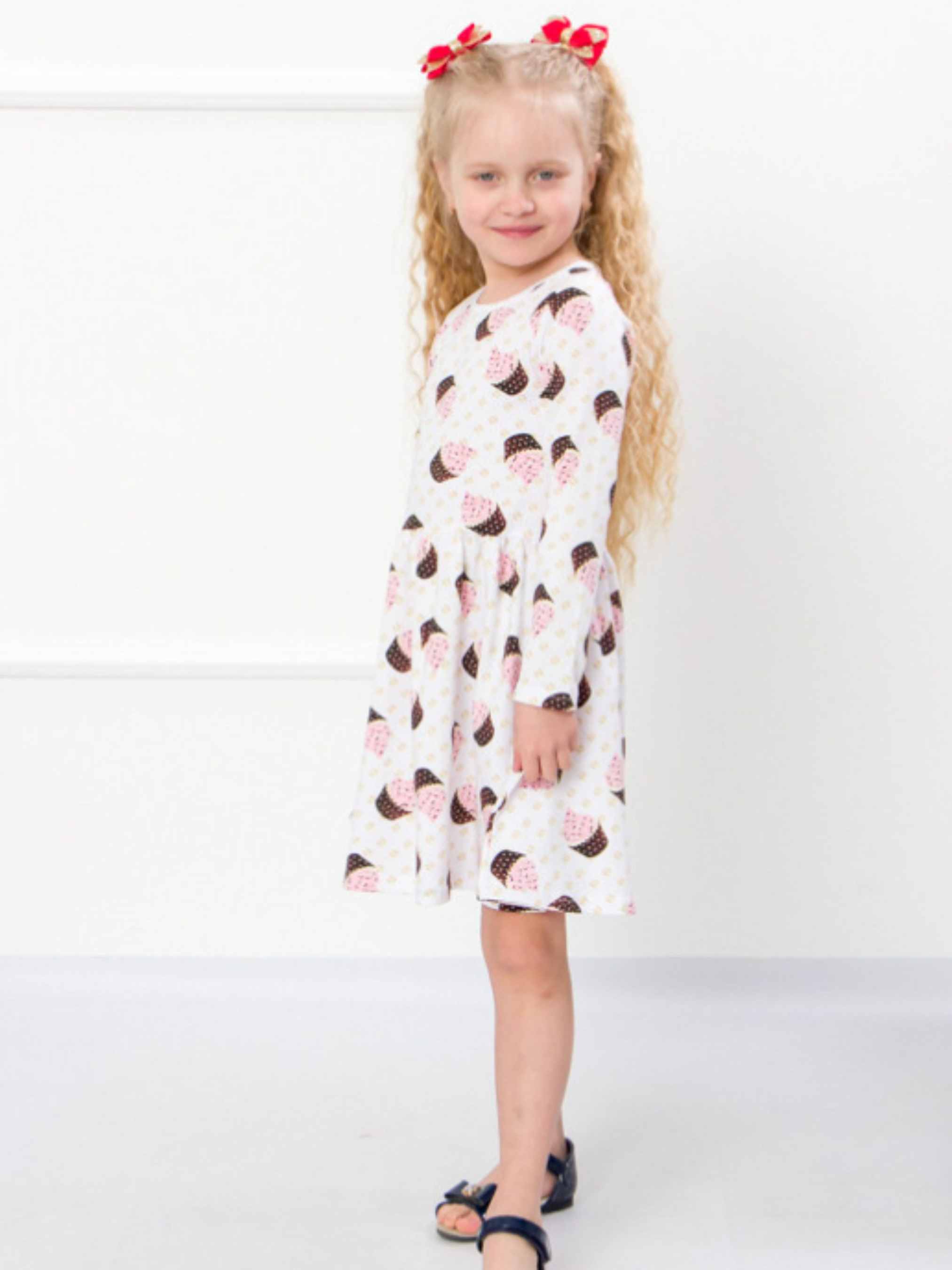 Полотно: фулікра набивна Склад полотна: 95% бавовна 5% лайкри Зріст: 92-128 В чудовій сукні ваша красуня буде виглядати чарівно. Ця річ нікого не залишить байдужими. Модель виконана з набивної фулікри. Тканина має однакову лицьову і виворітну сторону має високу розтяжність і пружність в поперечному напрямку. Вона не сідає не линяє не розтягується не викликає алергії. Модель з довгим рукавом круглим коміром і невеликими воланами на подолі. У цій сукні дівчинка може ходити на дитячі свята відвідувати кінотеатр або кафе.