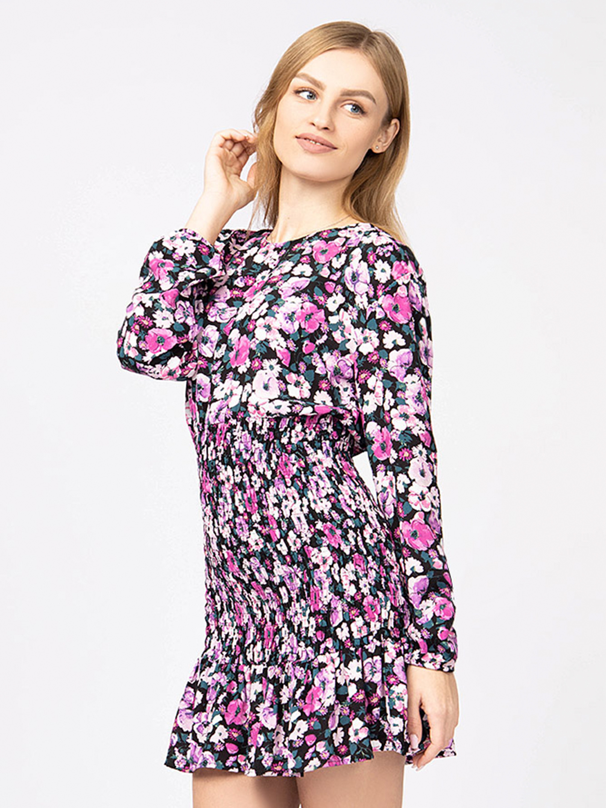 Фасон: коротка, резинка, квітковий принт Склад: 100% віскоза Сезон: демісезон Колір: фуксія Розмірний ряд: 34-40 Виробник: Туреччина Параметри моделі (груди, талія, стегна): 80-62-87 см Зріст: 164 см Розмір одягу на фото: 34