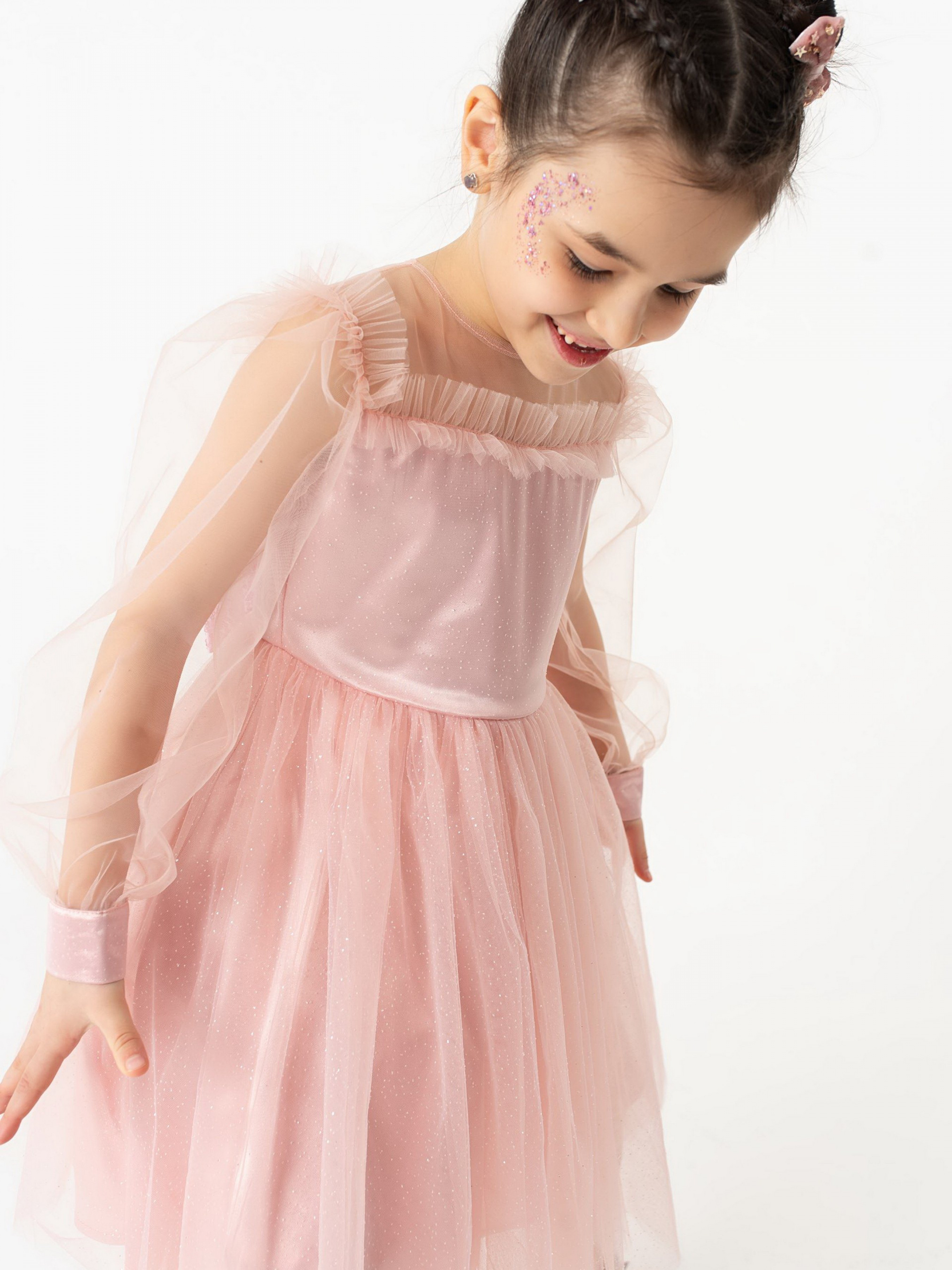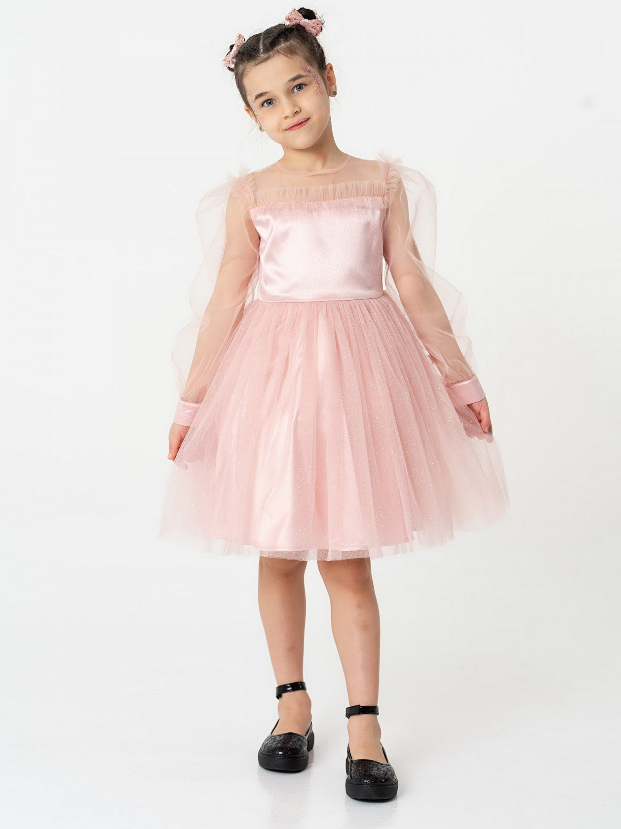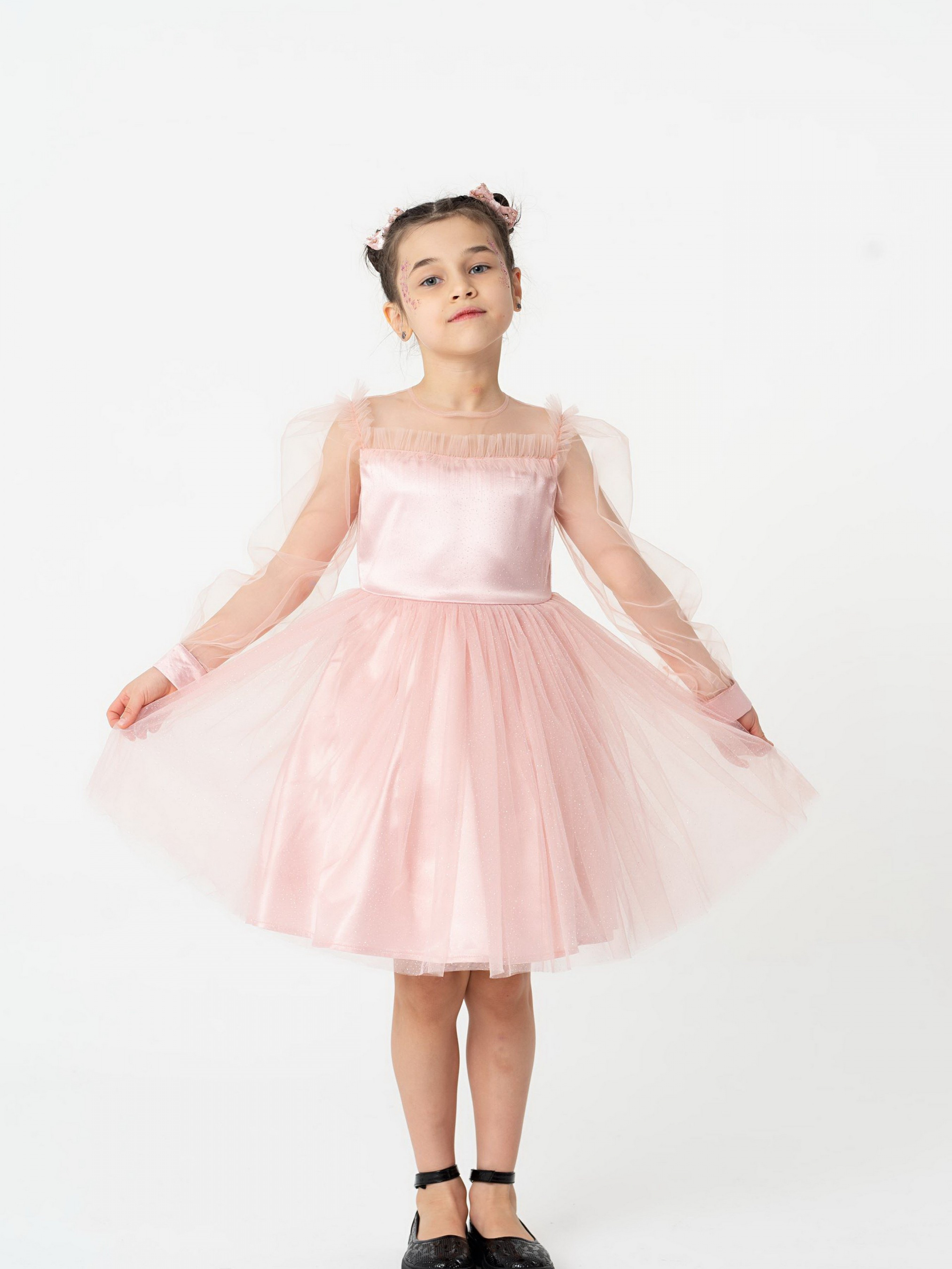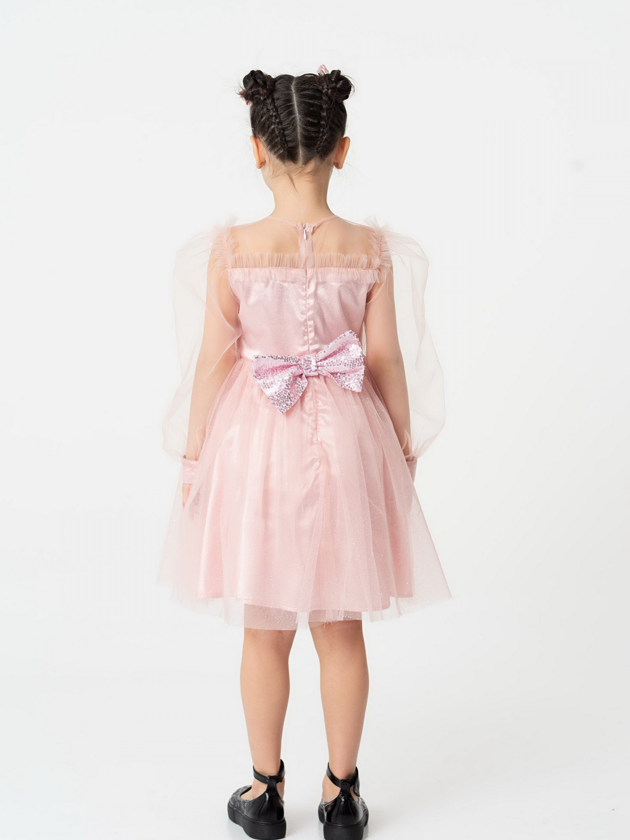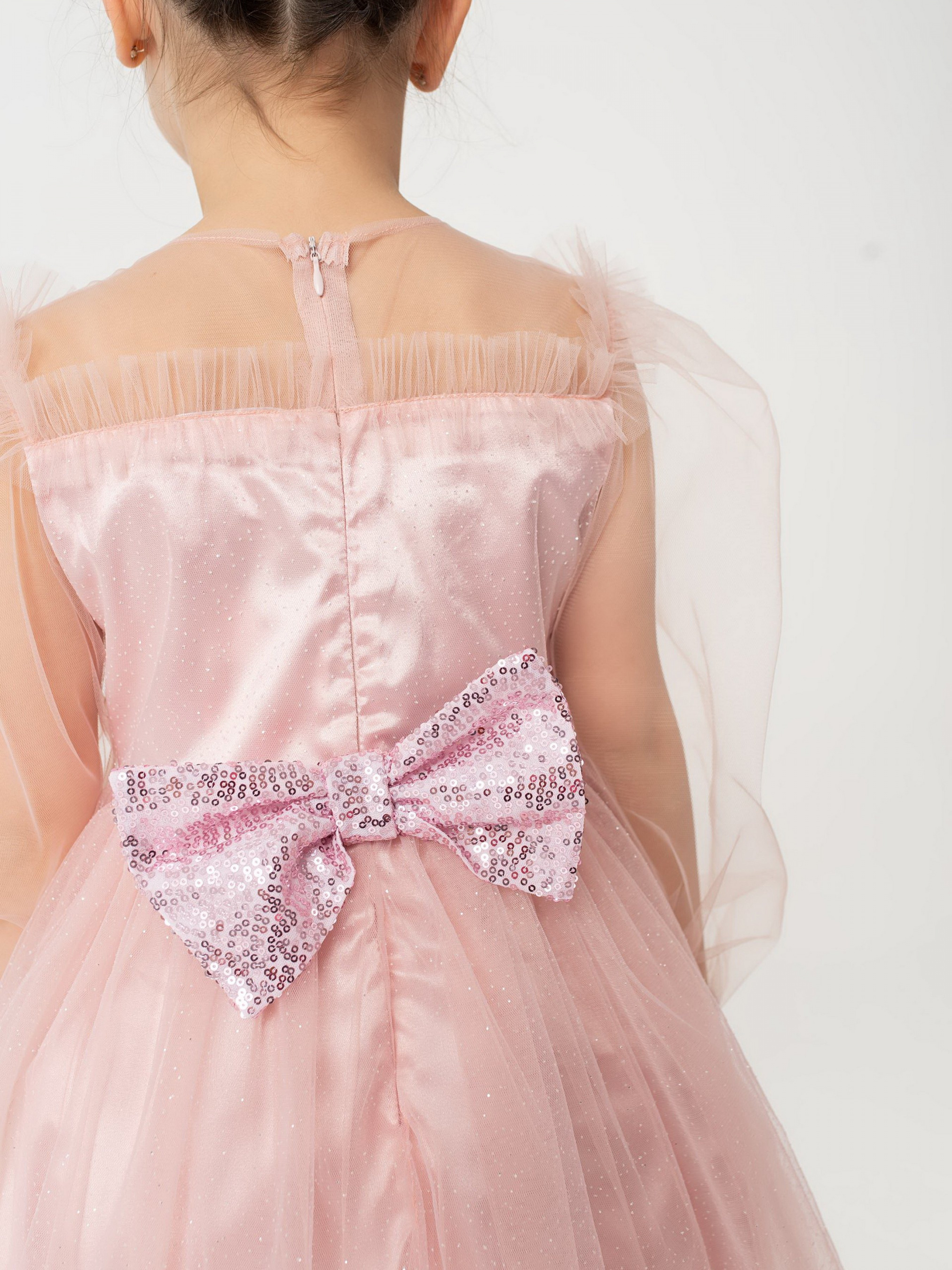 Деталі виробу: Сукня з довгим рукавом, відрізна по лінії талії. По ліфу сукні відрізна кокетка з євросітки, по швах якої, а також по проймі, налаштований рюш з євросітки (пройма рукавів окантована з вивороту). По спинці вточена блискавка. Рукава з євросітки, в формі ліхтарика. Низ рукава на манжеті, що застібається на ґудзички. Манжет рукава виконаний з декількох шарів тканини, верхній з яких виконаний з сітки з блискучим напиленням. Нижня частина ліфа також складається з кількох шарів, верхній з яких - євросітка з блискучим напиленням. Спідниця пишна, багатошарова, зібрана по талії. Верхній шар з євросітки з блискучим напиленням. Під ним шар євросітки в тон. Під ними під'юбник з атласу, під яким підкладка з батиста, на яку налаштована деталь з фатину, що надає додаткової пишності. По спинці на талії гарний бант з паєтками, пристібається на кнопці, що дуже зручно при догляді за виробом.