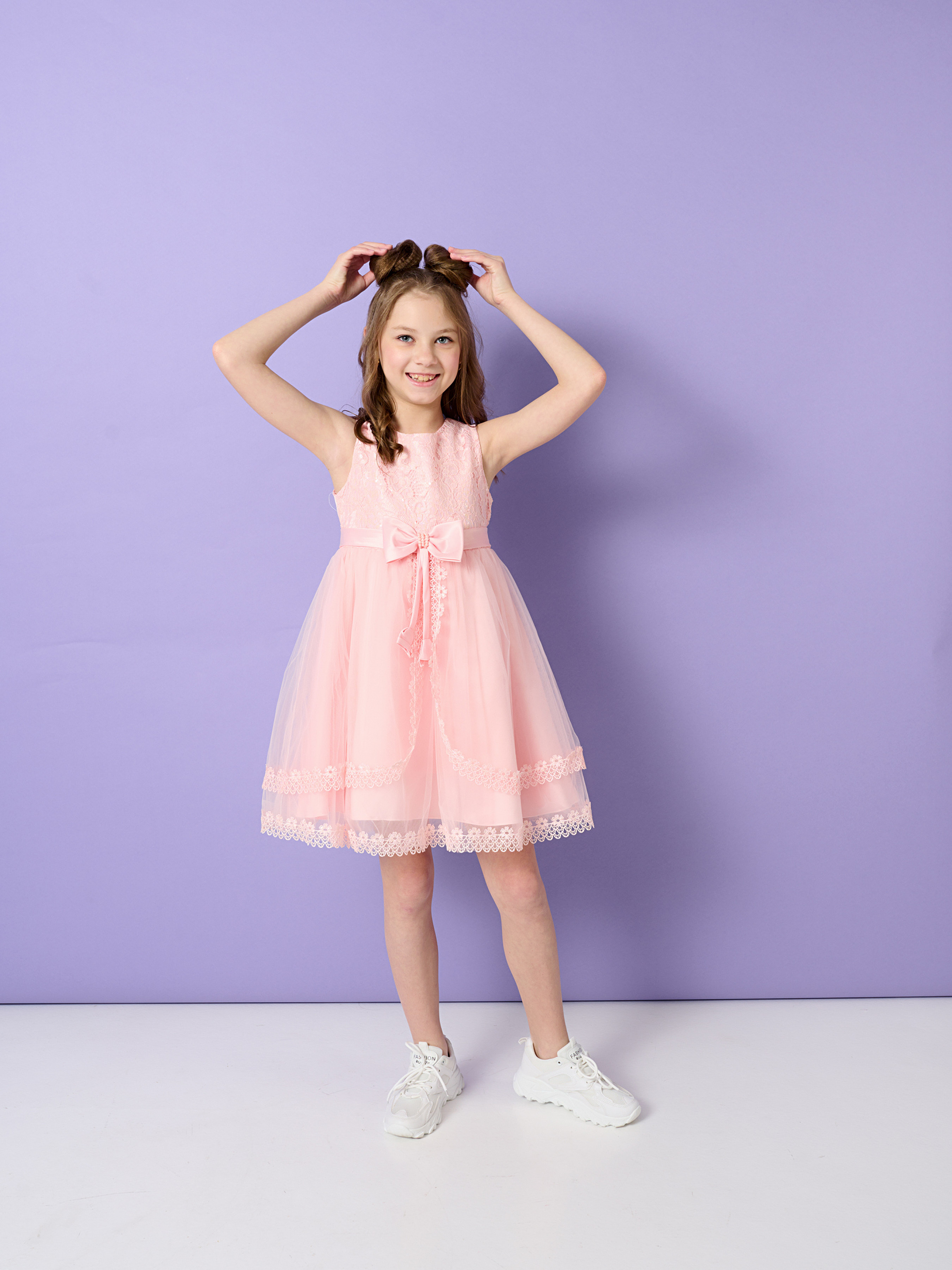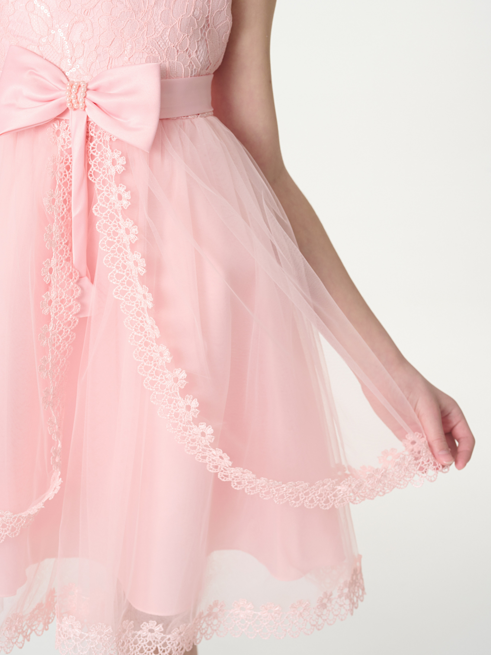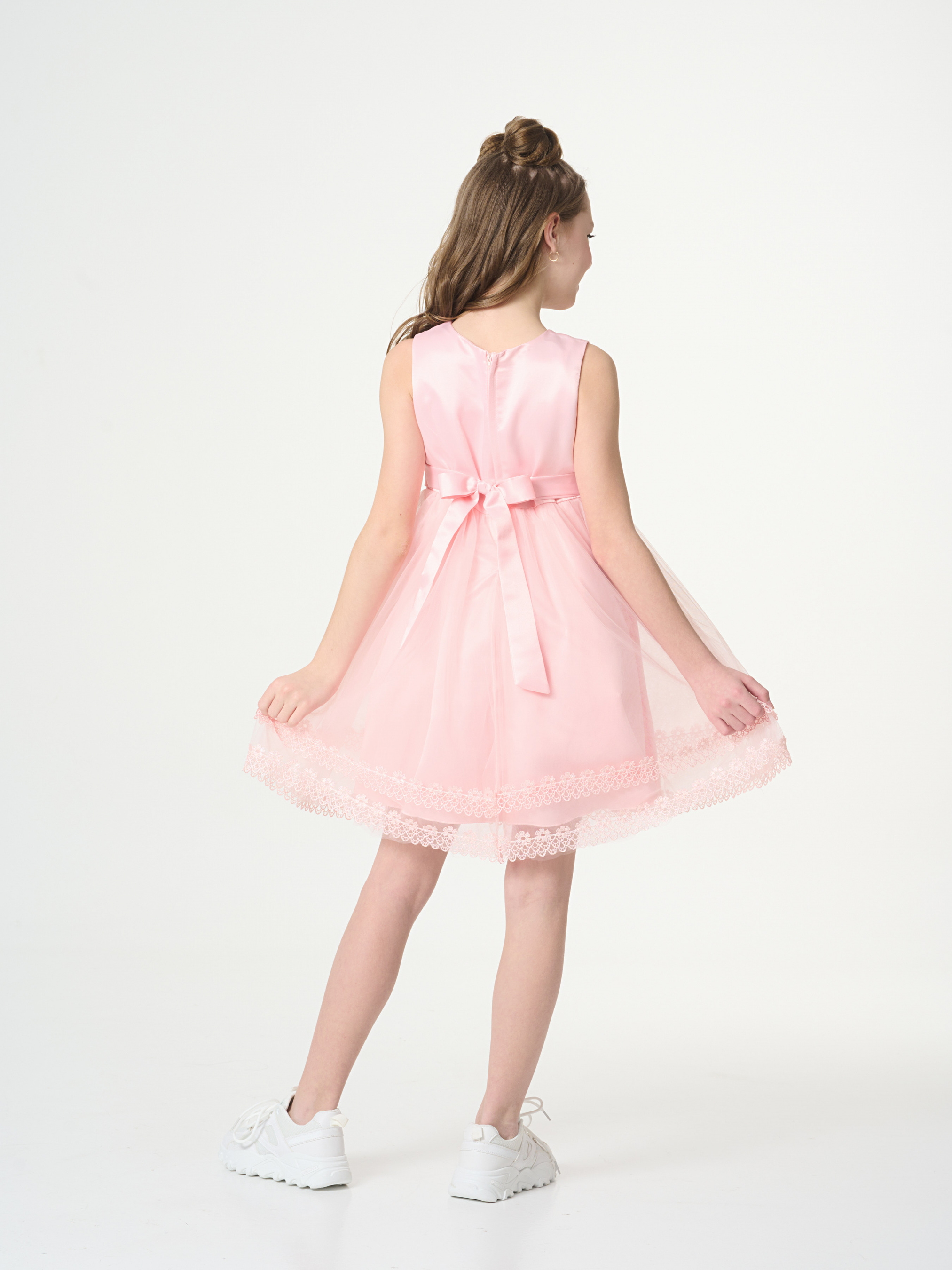 Деталі моделі: сукня рожевого кольору. Круглий виріз горловини. Без рукавів. Застібається ззаду на блискавку. Попереду ліф обрамлений сіткою з вишивкою. Висока лінія талії оформлена атласним поясом. Попереду акуратний бант, декорований перлами. Позаду пояс зав'язується на бант. Спідниця сукні складається із трьох шарів. Нижній – непрозора тканина. Два верхні шари - євросітка, обрамлена мереживом.