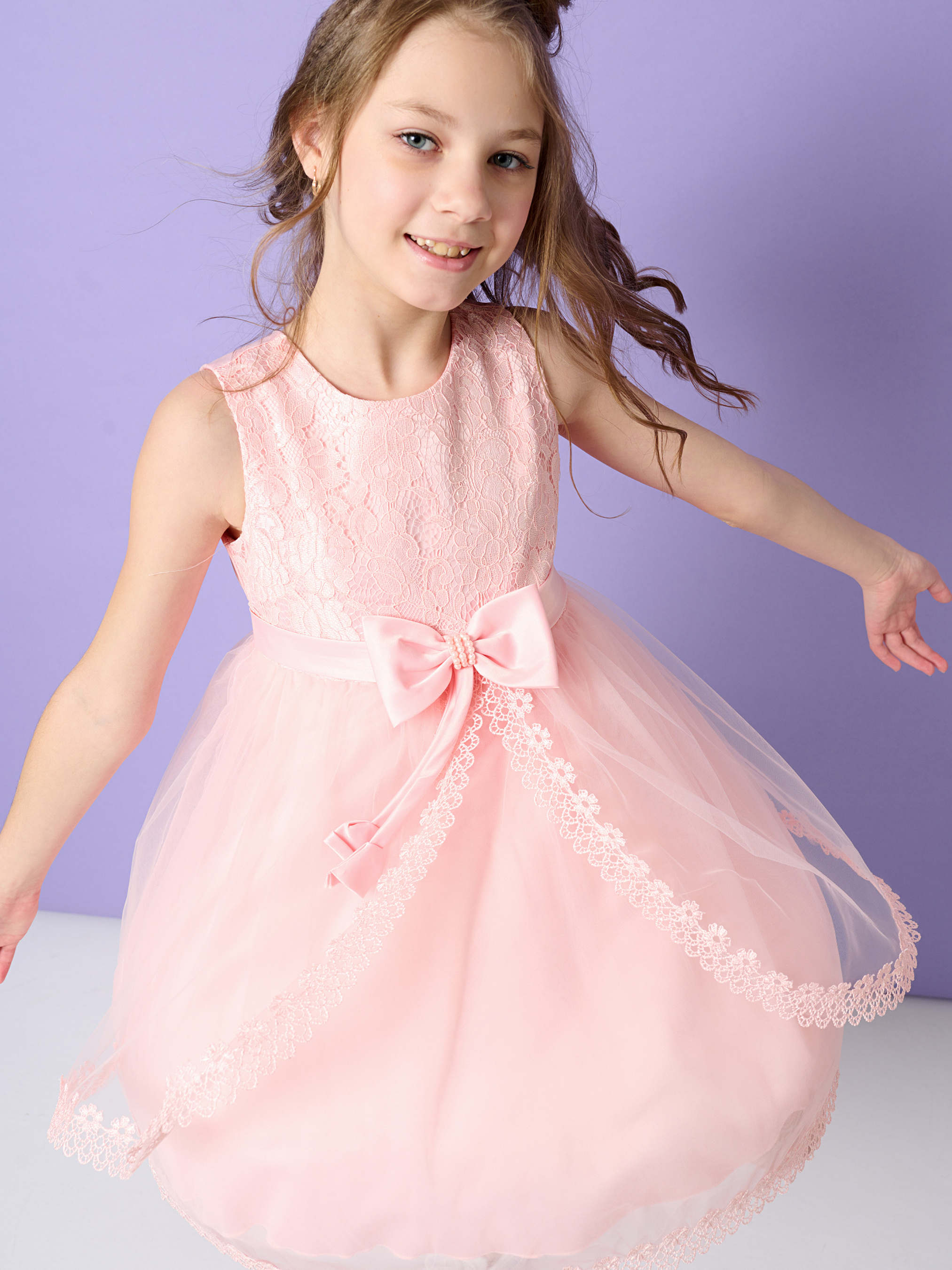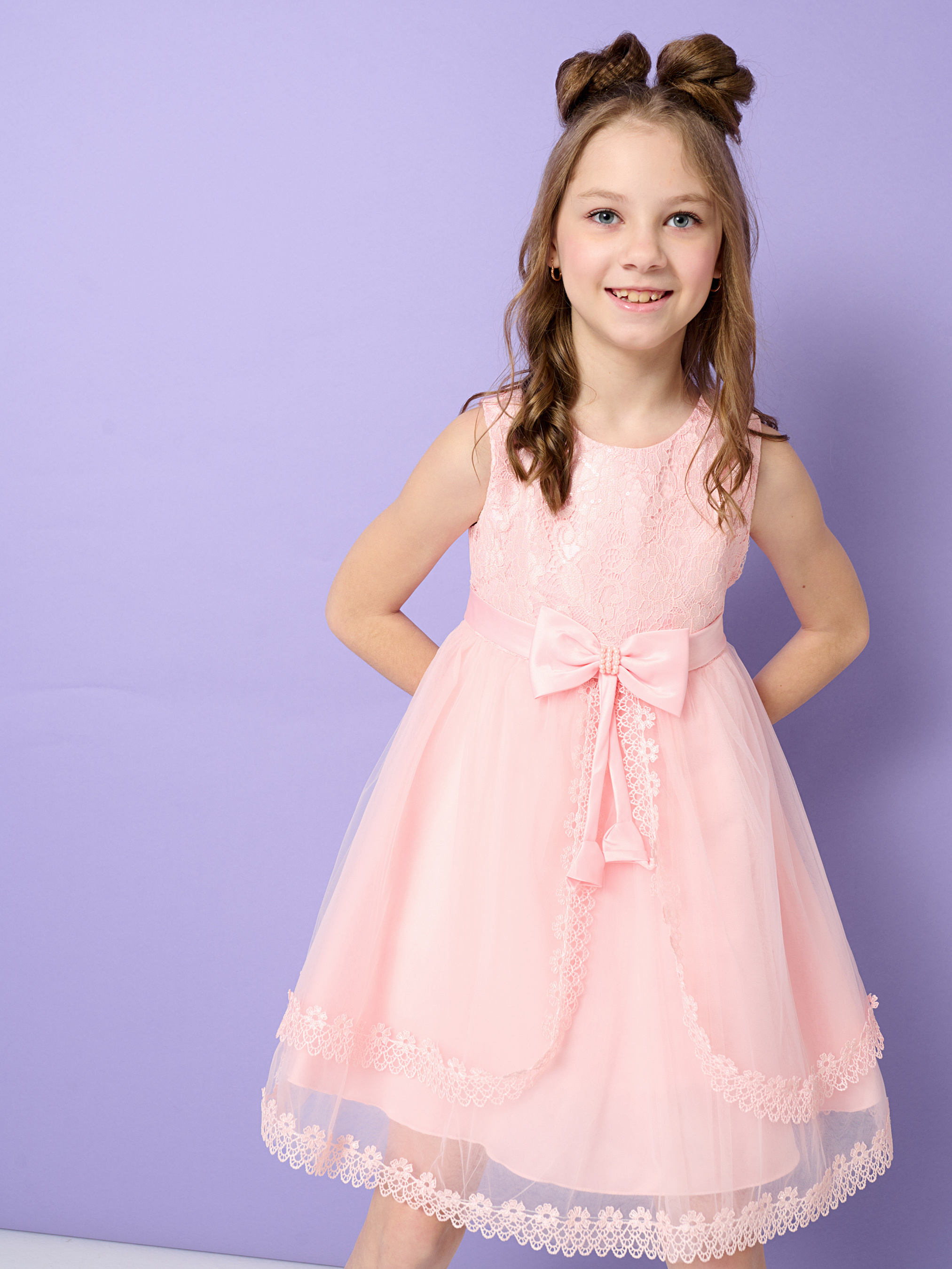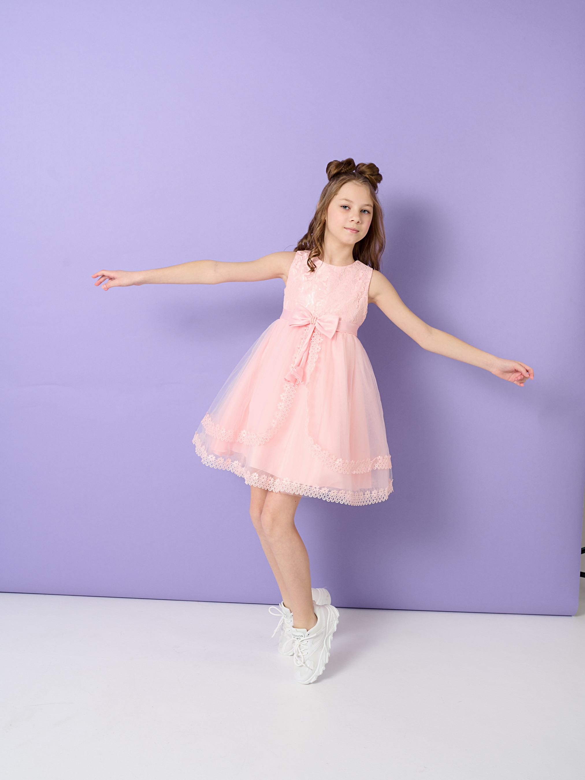 Деталі моделі: сукня рожевого кольору. Круглий виріз горловини. Без рукавів. Застібається ззаду на блискавку. Попереду ліф обрамлений сіткою з вишивкою. Висока лінія талії оформлена атласним поясом. Попереду акуратний бант, декорований перлами. Позаду пояс зав'язується на бант. Спідниця сукні складається із трьох шарів. Нижній – непрозора тканина. Два верхні шари - євросітка, обрамлена мереживом.