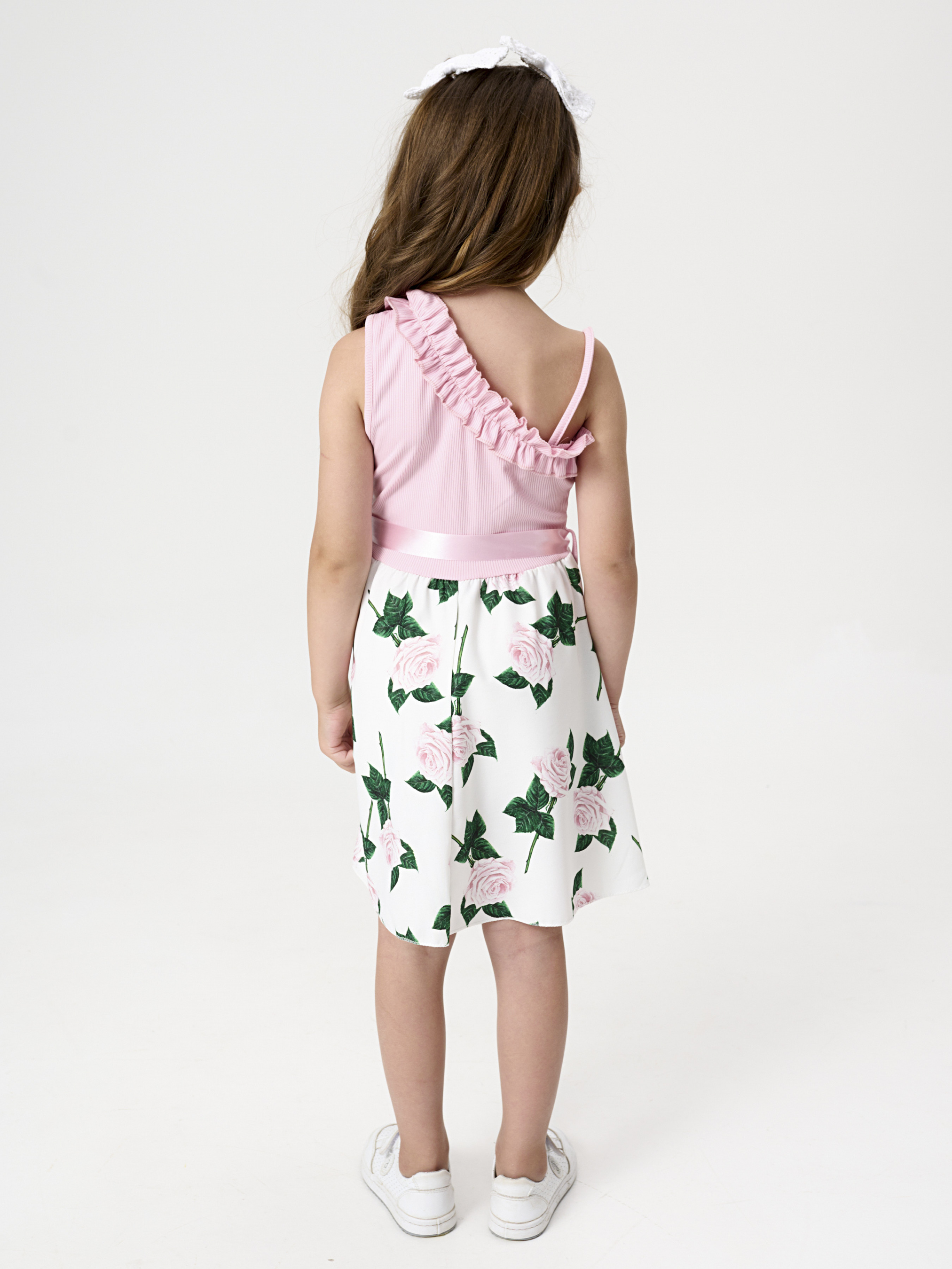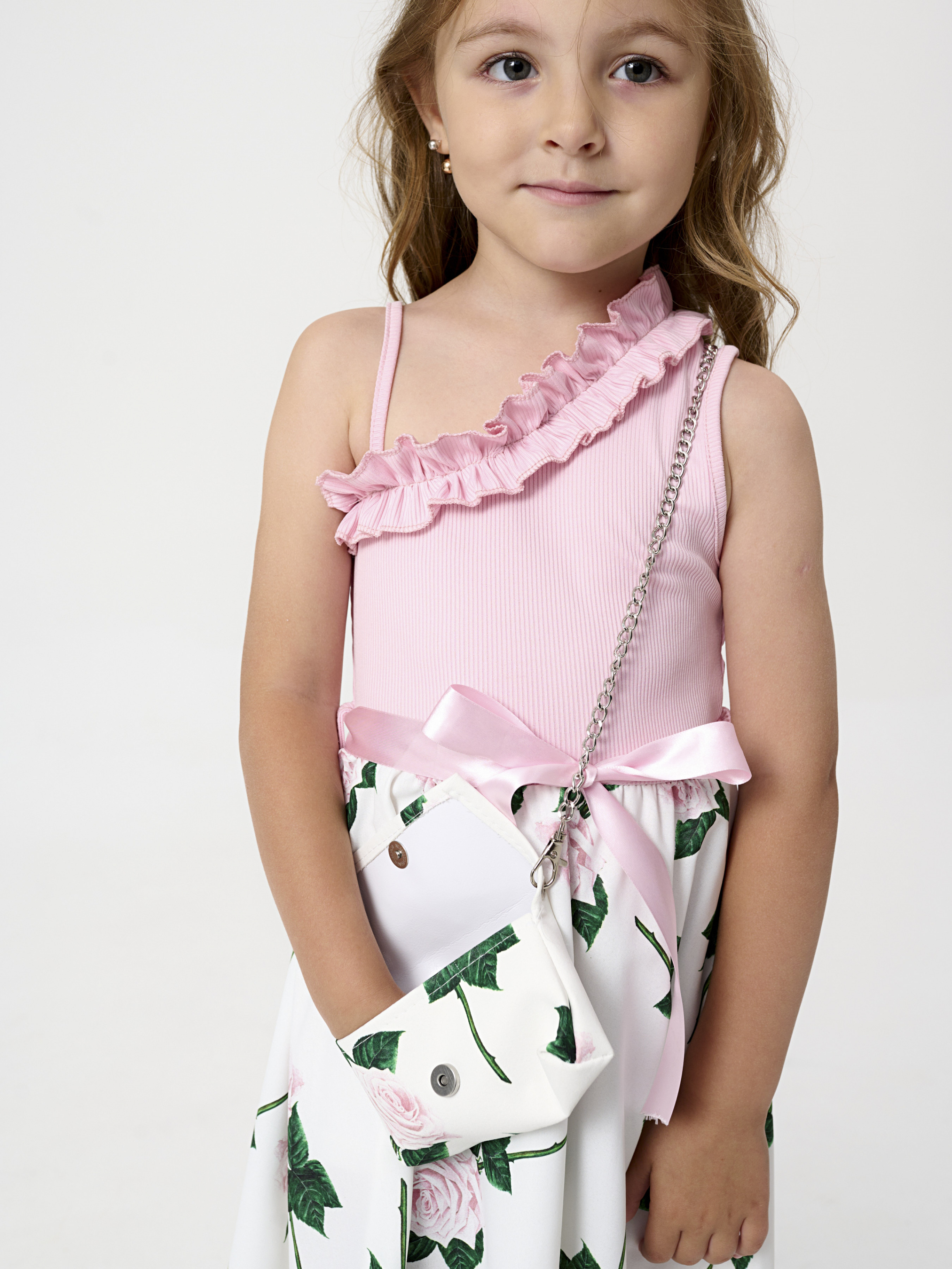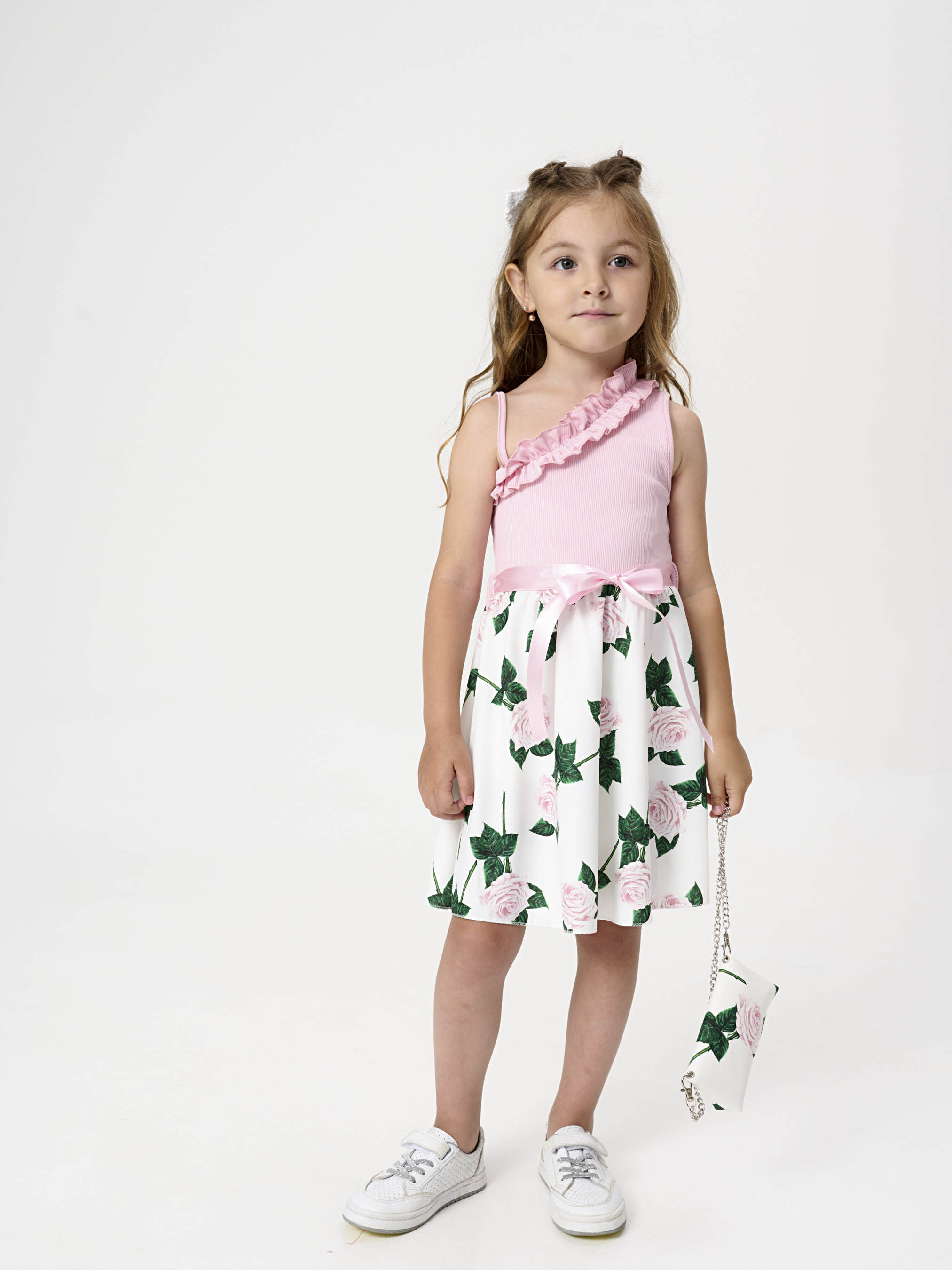 Детали модели: топ сарафана нежно-розового цвета. Одно открытое плечо. Без застежек. Пояс украшен атласной лентой с бантом. Белая юбка, свободного кроя с принтом крупных роз. Длина сарафана - до колен. В комплекте с сарафаном маленькая сумочка, на цепочке.