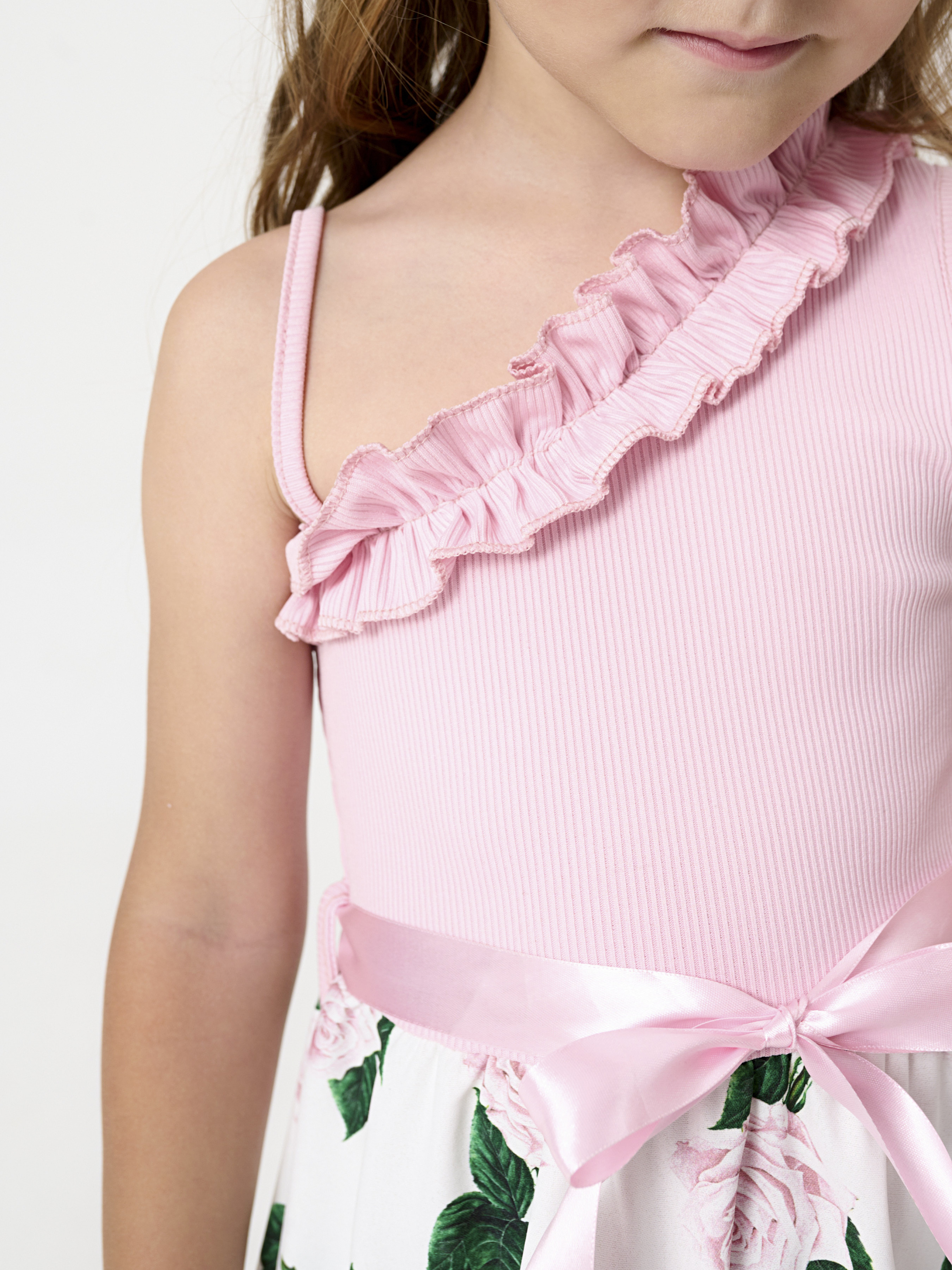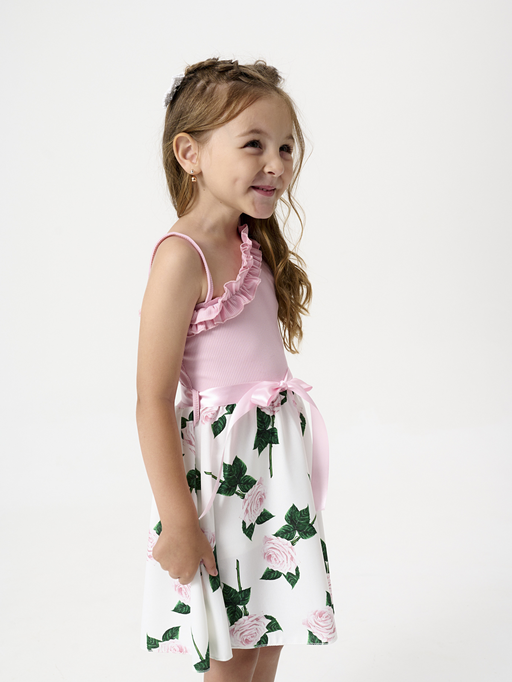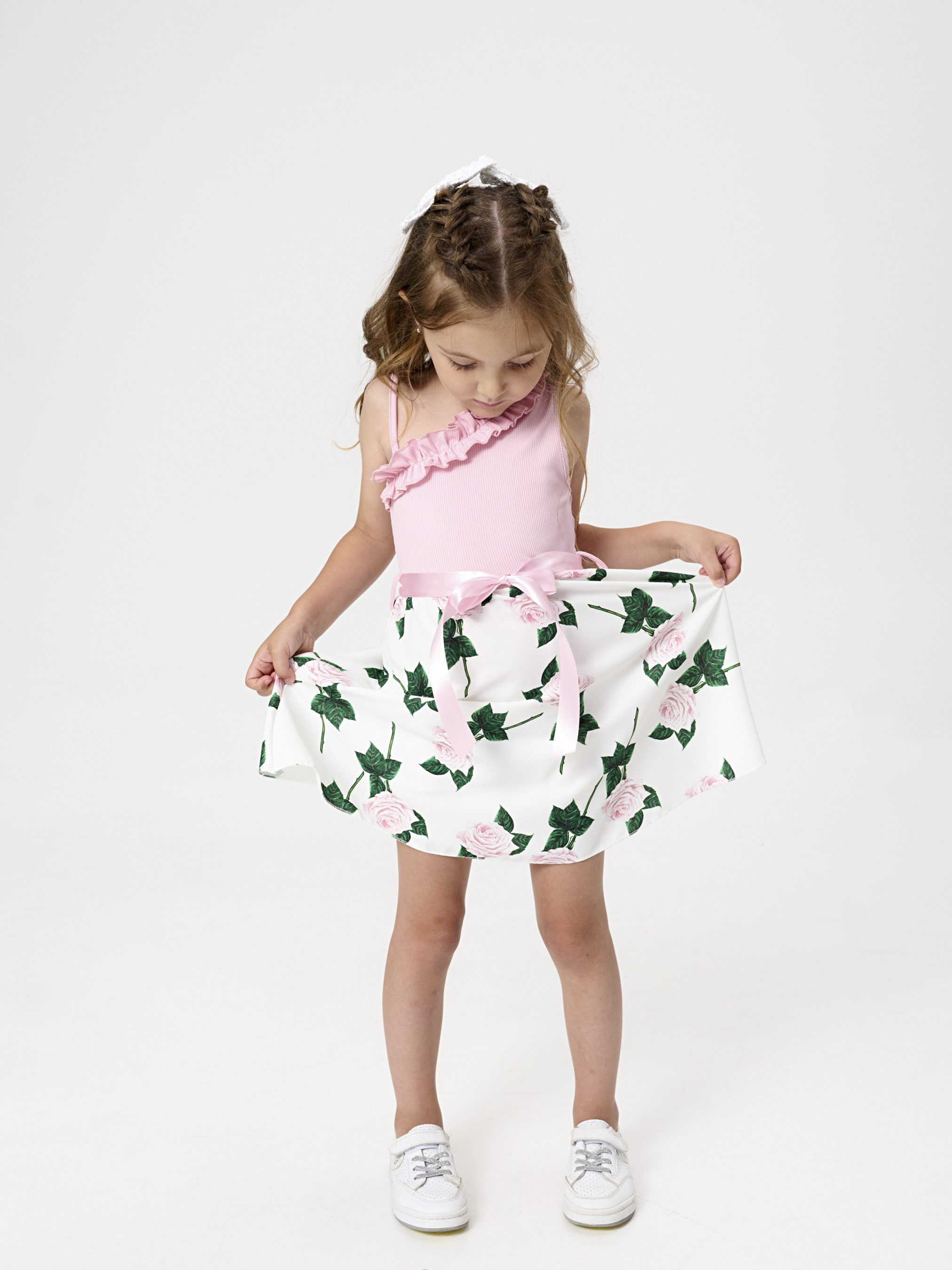Детали модели: топ сарафана нежно-розового цвета. Одно открытое плечо. Без застежек. Пояс украшен атласной лентой с бантом. Белая юбка, свободного кроя с принтом крупных роз. Длина сарафана - до колен. В комплекте с сарафаном маленькая сумочка, на цепочке.