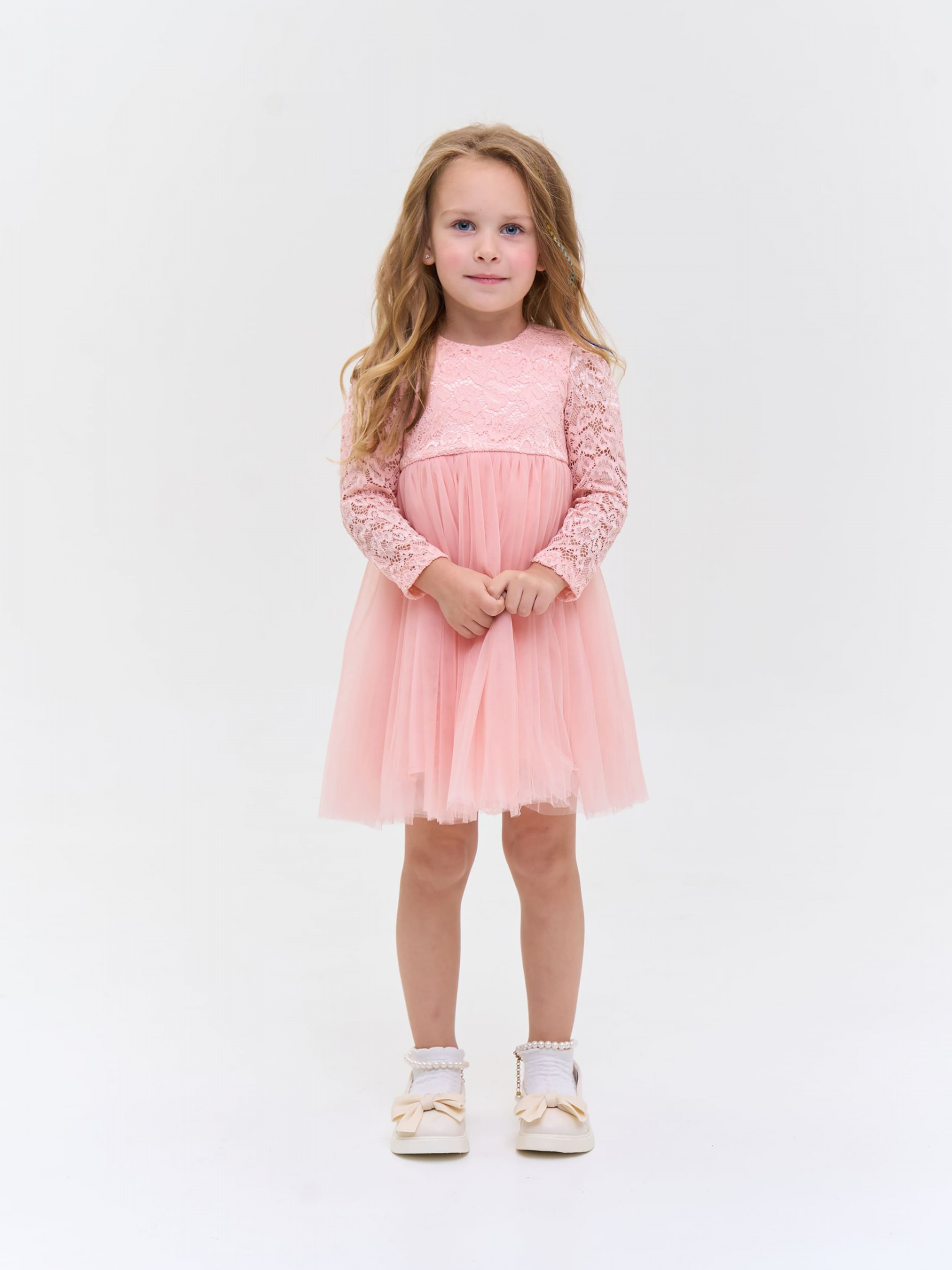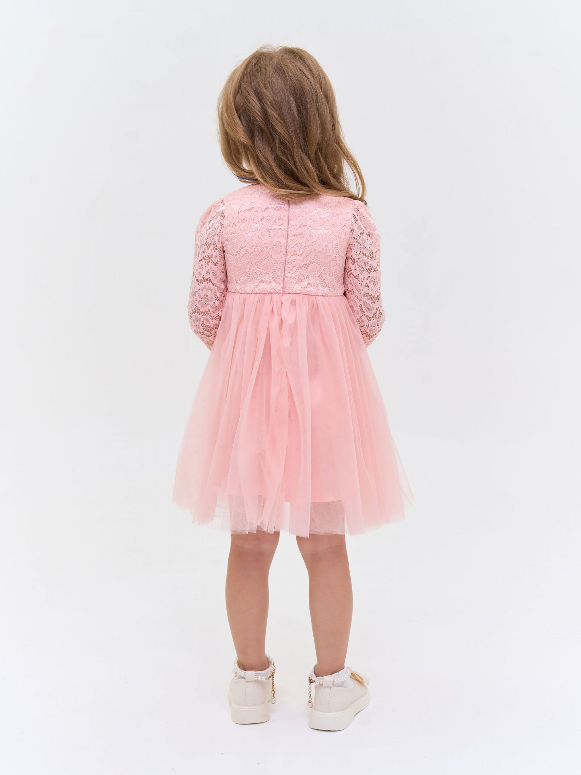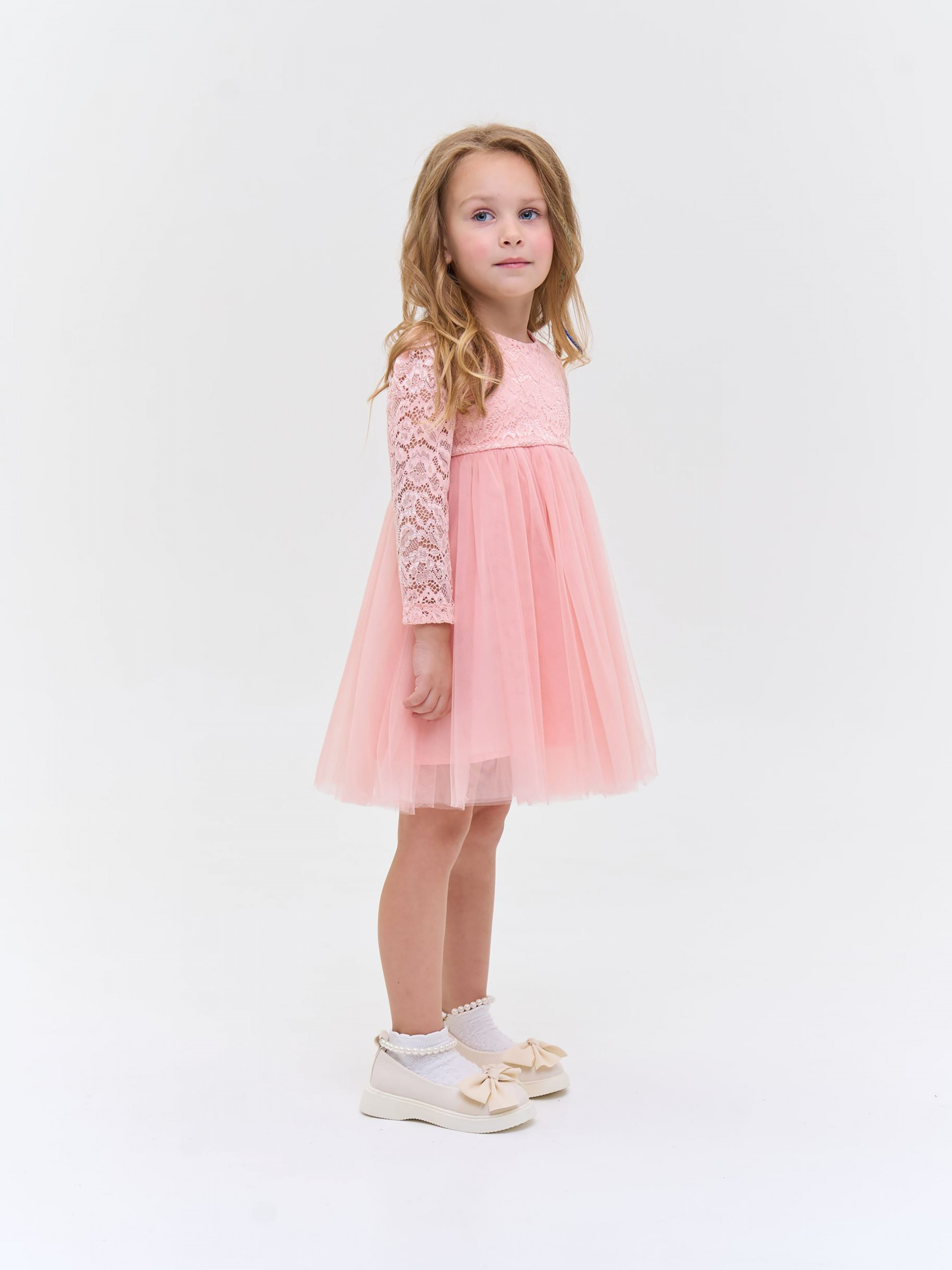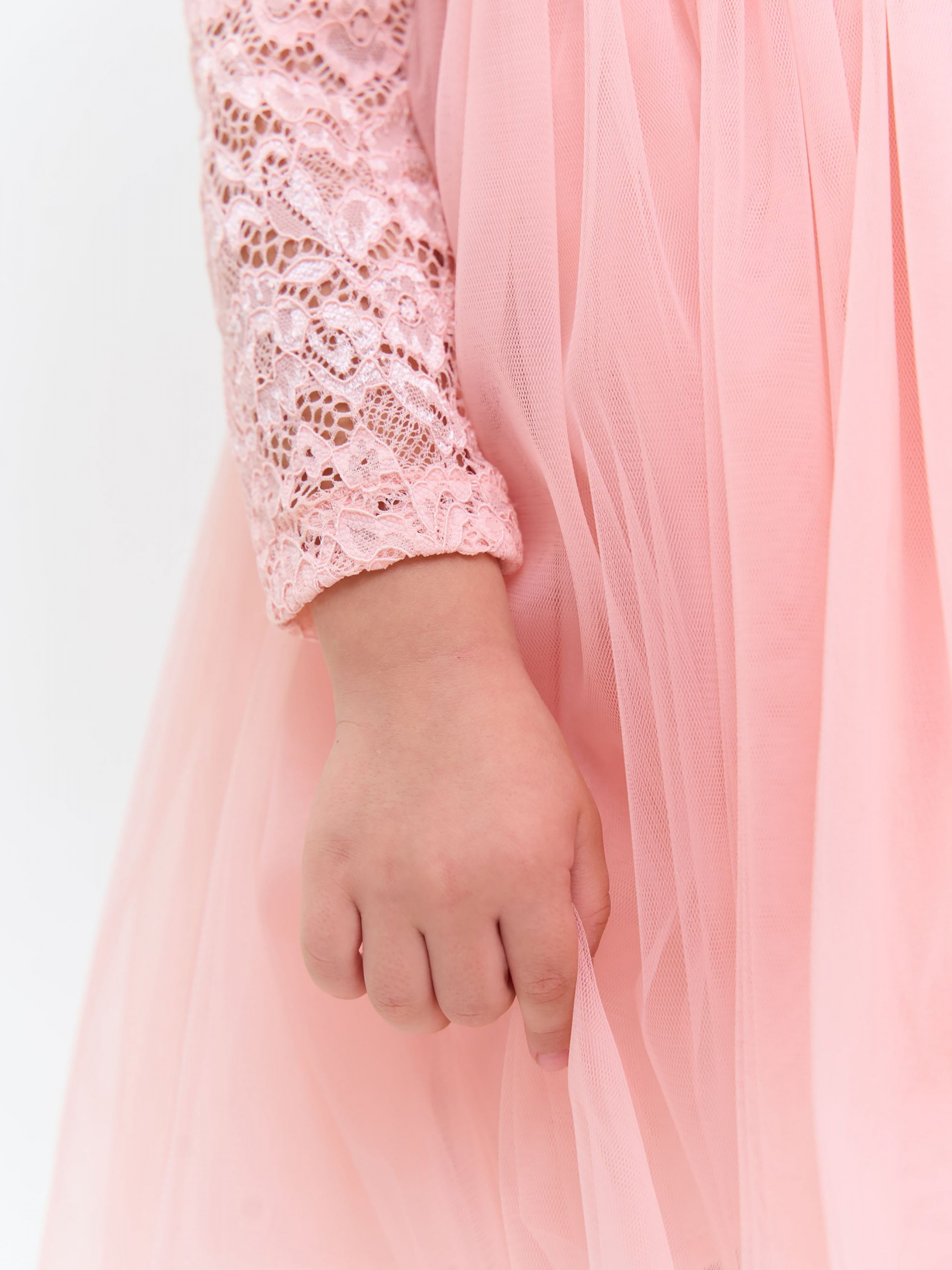Деталі моделі: Сукня пудрового кольору. Верх сукні виконаний із якісного гіпюру, Підкладка бавовняна. Кругла горловина. Довгий рукав. Застібка – блискавка на спинці. Спідниця пишна виконана із двох шарів фатину. Третій, нижній шар спідниці із атласу. Сукня добре тримає форму. Довжина виробу – по коліно.