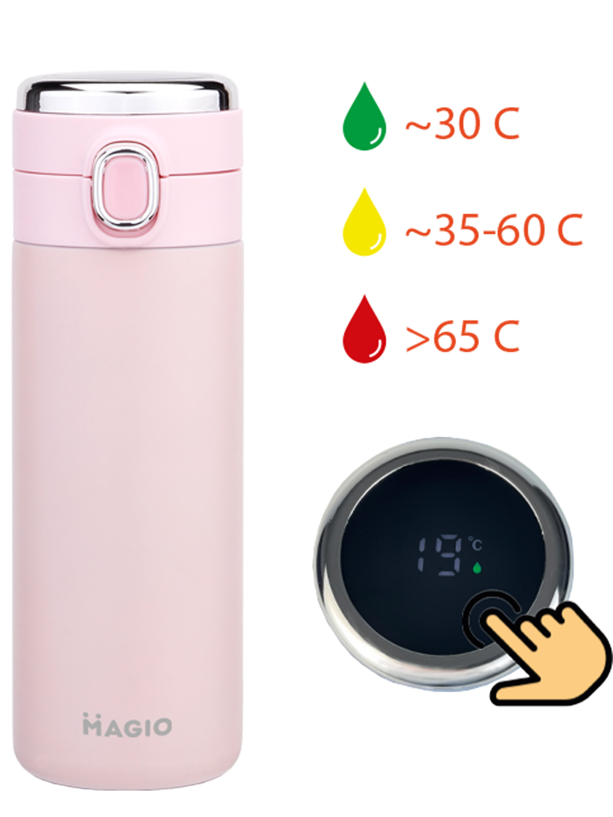 Термокружка (термос) із сенсорним індикатором температури (400 мл) рожевого кольору від торгового бренду Magio виготовлено з нержавіючої сталі та харчового пластику. Має високу якість, надійність, компактні розміри та естетичний дизайн. Стане незамінним супутником у машині, на відпочинку або в подорожі. Призначена як для гарячих, так і для холодних напоїв. Особливості: виготовлена з високоякісної нержавіючої сталі та АБС пластику; LED дисплей відображає температуру рідини всередині; подвійні стінки відмінно зберігають температуру напою; герметична кришка на кнопці-засувці захищає від проливів; зручний пластиковий носик-поїлка; стійка до корозії та температурних перепадів; не окислюється і зберігає смак напоїв; стильний і сучасний дизайн; легко мити і чистити; зберігає температуру гарячого напою протягом 9 годин, а холодного - протягом 12 годин. підходить для повсякденного використання. Рекомендації з догляду: з метою гігієни перед початком використання промийте виріб теплою водою з м'яким мийним засобом; важливо промивати виріб відразу після кожного використання; для максимально довгого збереження тепла, рекомендується прогріти внутрішню колбу гарячою водою протягом 1-2 хвилин, а для збереження холоду - рекомендується залити холодною; після використання зберігайте виріб у відкритому вигляді, щоб уникнути утворення цвілі та неприємного запаху; уникайте засобів для миття, які містять хлор, агресивні хімікати; якщо в кухлі знаходиться гарячий напій, відкривайте кришку на відстані від обличчя, щоб не обпекти обличчя парою; не використовувати в мікрохвильовці та духовці; тільки ручне миття, не використовувати посудомийну машину. Об'єм: 400 мл.