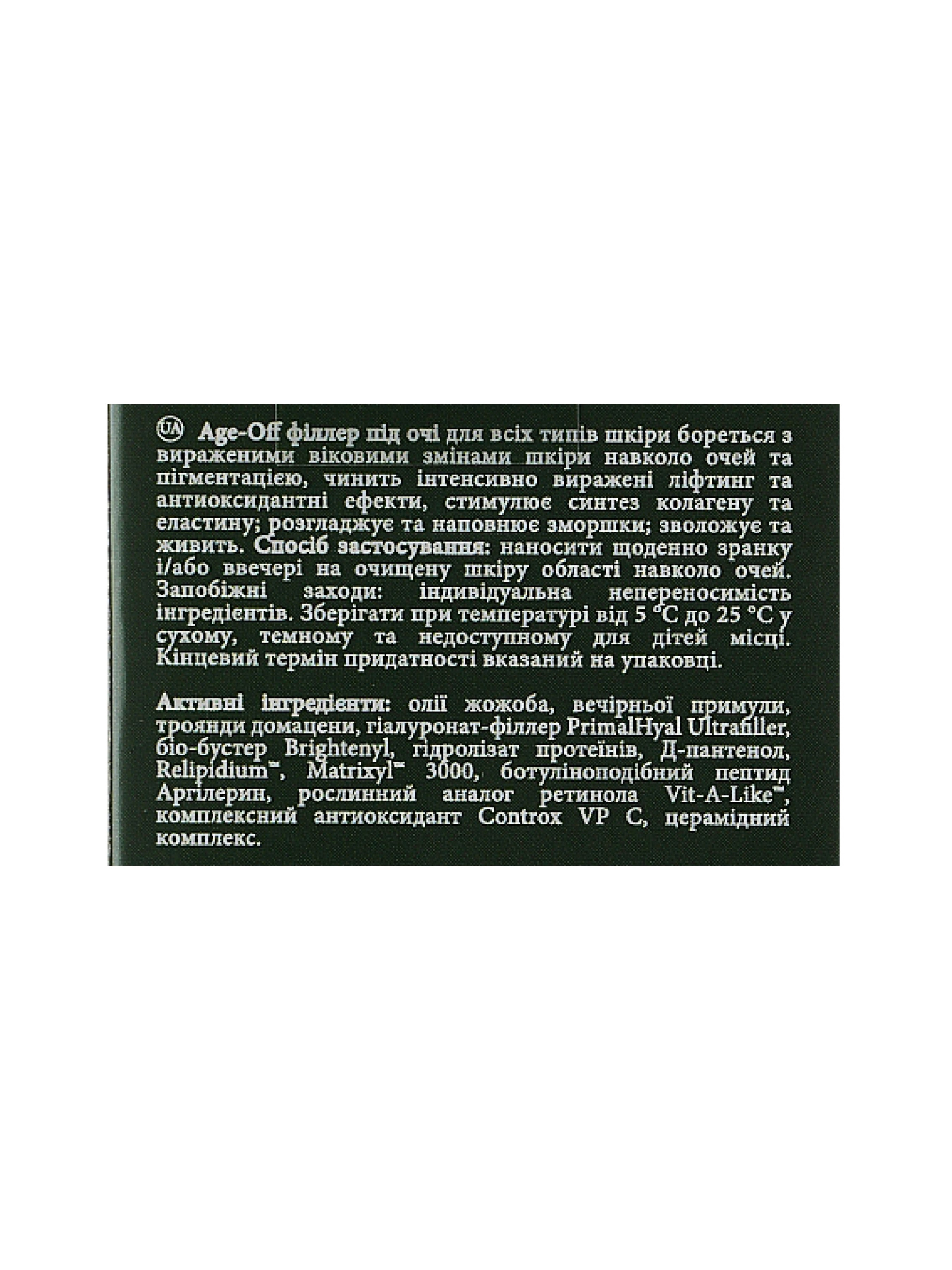 Антивіковий філлер під очі Age-Off eye filler активізує захисні механізми шкіри, стимулює процеси метаболізму і регенерації на клітинному рівні. Антивіковий філлер під очі Age-Off eye filler містить рослинний аналог ретинолу Vit-A-Like і пептид Matrixyl, які стимулюють синтез колагену і еластину в клітинах шкіри. Цей інгредієнт в комбінації з аргіреліном і Д-пантенолом підтримують еластичність і пружність шкіри, забезпечуючи неймовірний ліфтинг. Комплекс церамідів підсилює омолоджуючий ефект, зменшуючи транс-епідермальну втрату вологи, попереджаючи сухість, лущення і в'ялість шкіри. У складі філлеру присутні олія вечірньої примули і комплексний антиоксидант Сontrox VP C, вони допомагають запобігти фотостарінню шкіри, нейтралізують дію вільних радикалів і захищають шкіру від агресивного впливу навколишнього середовища.