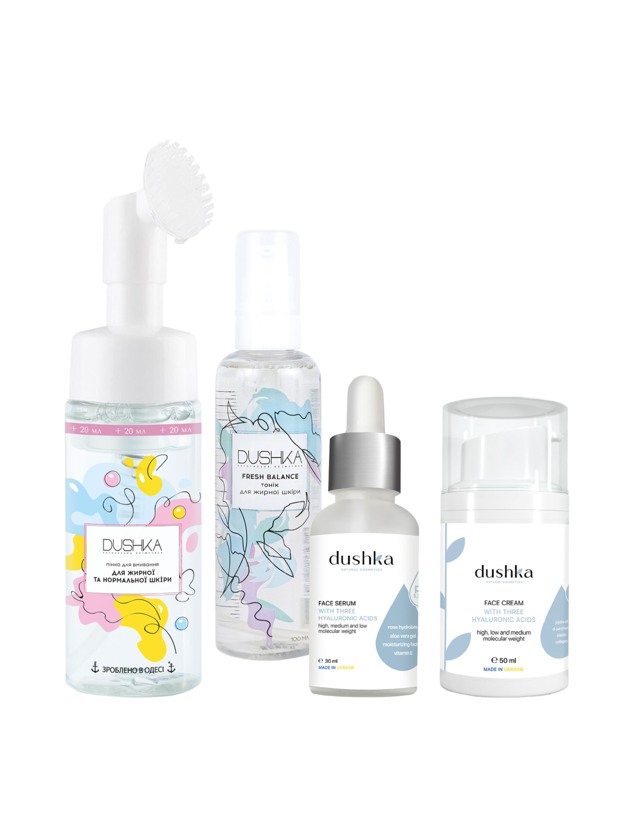 Базовий набір засобів для щоденного догляду за жирною шкірою обличчя: відновлює водно-жировий баланс, надає необхідне для жирної шкіри зволоження, піклується про пружність, еластичність і молодість шкіри. Пінка для вмивання ефективно та м'яко видаляє макіяж і забруднення, тонік освіжає та тонізує шкіру, крем із трьома гіалуроновими кислотами глибоко та інтенсивно зволожує, вирівнює колір і мікрорельєфи шкіри, зберігає її молодість і пружність. У наборі: - Пінка для вмивання для жирної та нормальної шкіри 170 мл Склад: вода (Aqua), гідролат грейпфрута (Citrus Paradisi (Grapefruit) Fruit Water), піноутворювач з кокосової олії (Cocamidopropyl Betaine), яблучний піноутворювач (Sodium cocoyl apple amino acid), олія винограду (Vitis Vinifera (Grape) Seed Oil), кокосовий емульгатор (Polysorbate 20), алантоїн (Allantoin), ефірна олія м'яти (Mentha Piperita (Peppermint) Oil), ефірна олія розмарину (Rosmarinus Officinalis (Rosemary) Leaf Oil), екологічно чистий консервант (Sorbitan Caprylate, Propanediol, Benzoic Acid), вітамін Е (Tocopherol), Limonene. - Тонік для жирної шкіри «Fresh Balance» 100 мл Склад: гідролат м'яти (Mentha Piperita (Peppermint) Flower/Leaf/Stem Water), гідролат шавлії (Salvia Officinalis (Sage) Flower/Leaf/Stem Water), гель алое вера (Aloe Barbadensis Leaf Juice), водно-гліцериновий екстракт ламінарії (Glycerin, Aqua, Laminaria Digitata Extract, Citric Acid, Sodium Benzoate), амінокислоти шовку (Silk Amino Acids), алантоїн (Allantoin), кокосовий емульгатор (Polysorbate 20), екологічно чистий консервант (Sorbitan Caprylate, Propanediol, Benzoic Acid). - Крем для обличчя з трьома гіалуроновими кислотами 50 мл Склад: вода (Aqua), олія виноградних кісточок (Vitis Vinifera (Grape) Seed Oil), натуральний емульгатор (Cetearyl Olivate, Sorbitan Olivate), олія жожоба (Jojoba Oil), Д-пантенол (Panthenol), еластин (Elastin), екологічно чистий консервант (Ethylhexylglycerin, Phenoxyethanol), кокосовий зволожувач (Caprylic), гіалуронова кислота високомолекулярна, середньомолекулярна та низькомолекулярна (High, Medium and Low Molecular Weight Hyaluronic Acid), вітамін Е (Tocopherol), ефірна олія апельсина (Citrus aurantium Dulcis (Orange) Oil), колаген (Collagen), Linalool, D-Limonene. - Сироватка для обличчя з трьома гіалуроновими кислотами 30 мл Склад: вода (Aqua), гідролат троянди (Rosa Damascena Flower Water), гель алое вера (Aloe Barbadensis Leaf Juice), Д-пантенол (Panthenol), оливковий емульгатор (Polysorbate 20), натуральний зволожуючий фактор (Sodium PCA, Mel, Urea, Glucose, Fructose, Citric Acid, Hydrolyzed GAG, Glycine, Lysine), екологічно чистий консервант (Ethylhexylglycerin, Phenoxyethanol), гіалуронова кислота високомолекулярна, середньомолекулярна та низькомолекулярна (Hyaluronic Acid), натуральний гелеутворювач (Ammonium Acryloyldimethyltaurate/VP Copolymer), парфумерна композиція (Parfum). Купуй засоби для щоденного догляду зі знижкою!