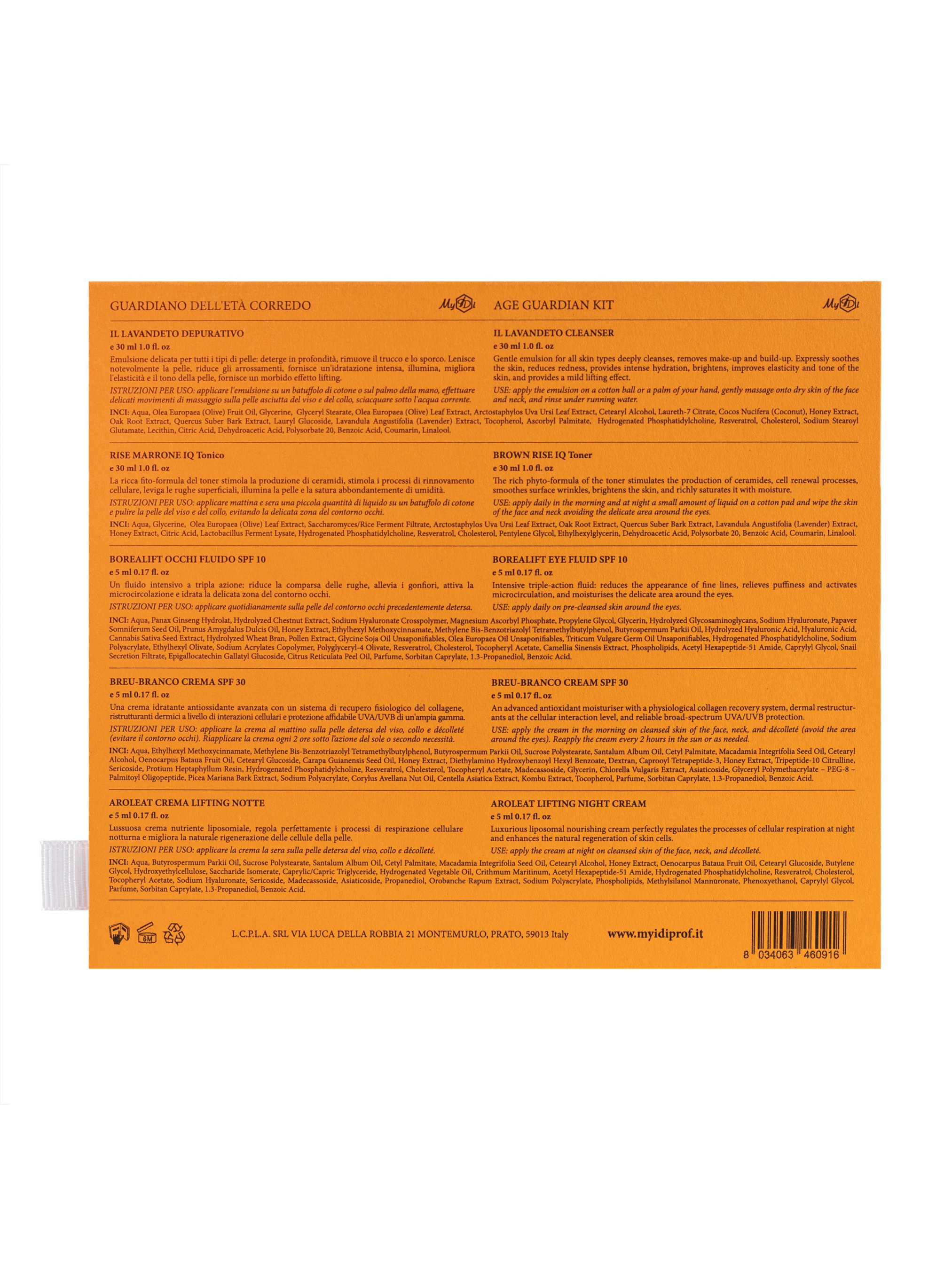 Антивіковий набір AGE GUARDIAN kit від MyIDi Найновіша формула для потужної комплексної корекції вікових змін шкіри. Насичена композиція антиоксидантів, пептидів, мультикозидів та сфер гіалурону кислоти розгладжує зморшки, зміцнює дерма-епідермальну сполуку, виражено коригує мімічні та статичні зморшки, заповнює шкіру зсередини. Набір складається з: 1. Шовкове молочко для вмивання з лавандою 360 SOLUTION IL Lavandeto CLEANSER - 30 мл Ніжна емульсія для всіх типів шкіри глибоко очищає, видаляє макіяж та забруднення. Виражено заспокоює шкіру, зменшує почервоніння, забезпечує інтенсивне зволоження, висвітлює, покращує пружність та тонус шкіри, забезпечує м'який ліфтинг-ефект. Передовий актив DIAM Oleacuteoactif забезпечує потрійну дію: відновлює пошкоджені клітини, пригнічує запалення, захищає від вільнорадикального старіння. Ферментований комплекс оливкового листя і мучниці вирівнює тон шкіри і запобігає утворенню пігментних плям. 2. Розумний тонер для всіх типів шкіри із коричневим рисом AGE GUARDIAN BROWN RISE IQ Toner - 30 мл Насичена фіто-формула тонера стимулює вироблення керамідів, стимулює процеси оновлення клітин, розгладжує поверхневі зморшки, освітлює шкіру, а також рясно насичує її вологою. Фільтрат коричневого рису багатий поліпептидами, амінокислотами, молочною фітиновою та феруловою кислотами, які швидко поглинаються шкірою, насичують клітини енергію, омолоджують, відновлюють пошкоджені клітини, покращують тон обличчя та стимулюють синтез колагену. 3. Ліфтинг контурний флюїд для шкіри навколо очей SPF 10 AGE GUARDIAN BOREALIFT EYE FLUID SPF 10 - 5 мл Інтенсивний флюїд потрійної дії: зменшує появу тонких ліній, знімає набряки та активує мікроциркуляцію та зволожує делікатну зону навколо очей. Стимулює синтез компонентів міжклітинного матриксу, тонізує та пом'якшує шкіру, надаючи очам сяйва молодості. 4. Про-колагеновий денний ліфтинг-крем SPF 30 AGE GUARDIAN BREU-BRANCO CREAM SPF 30 - 5 мл Передовий антиоксидантний зволожувач із системою фізіологічного відновлення колагену, реструктурантів дерми на рівні клітинних взаємодій та надійного захисту UVA/UVB широкого спектру. Повертає шкірі тонус та еластичність, усуває виражені ознаки старіння. Збагачений мультикозидами та біопептидами формула крему, забезпечує відновлення життєвої активності та неперевершений ліфтинг та підтяжку овалу обличчя. 5. Ліпосомальний нічний філер ліфтінг-крем AGE GUARDIAN AROLEAT LIFTING NIGHT CREAM - 5 мл Розкішний ліпосомальний живильний крем, відмінно регулює процеси клітинного дихання в нічний час і посилює природну регенерацію клітин шкіри. Формула збагачена рослинним ретинолом та мультикозидами для активної боротьби з проявами старіння, вираженого ліфтингу та відновлення тургору та еластичності шкіри. Ліпосомальний комплекс зменшує зморшки, підтягує шкіру, бореться із віковими плямами.