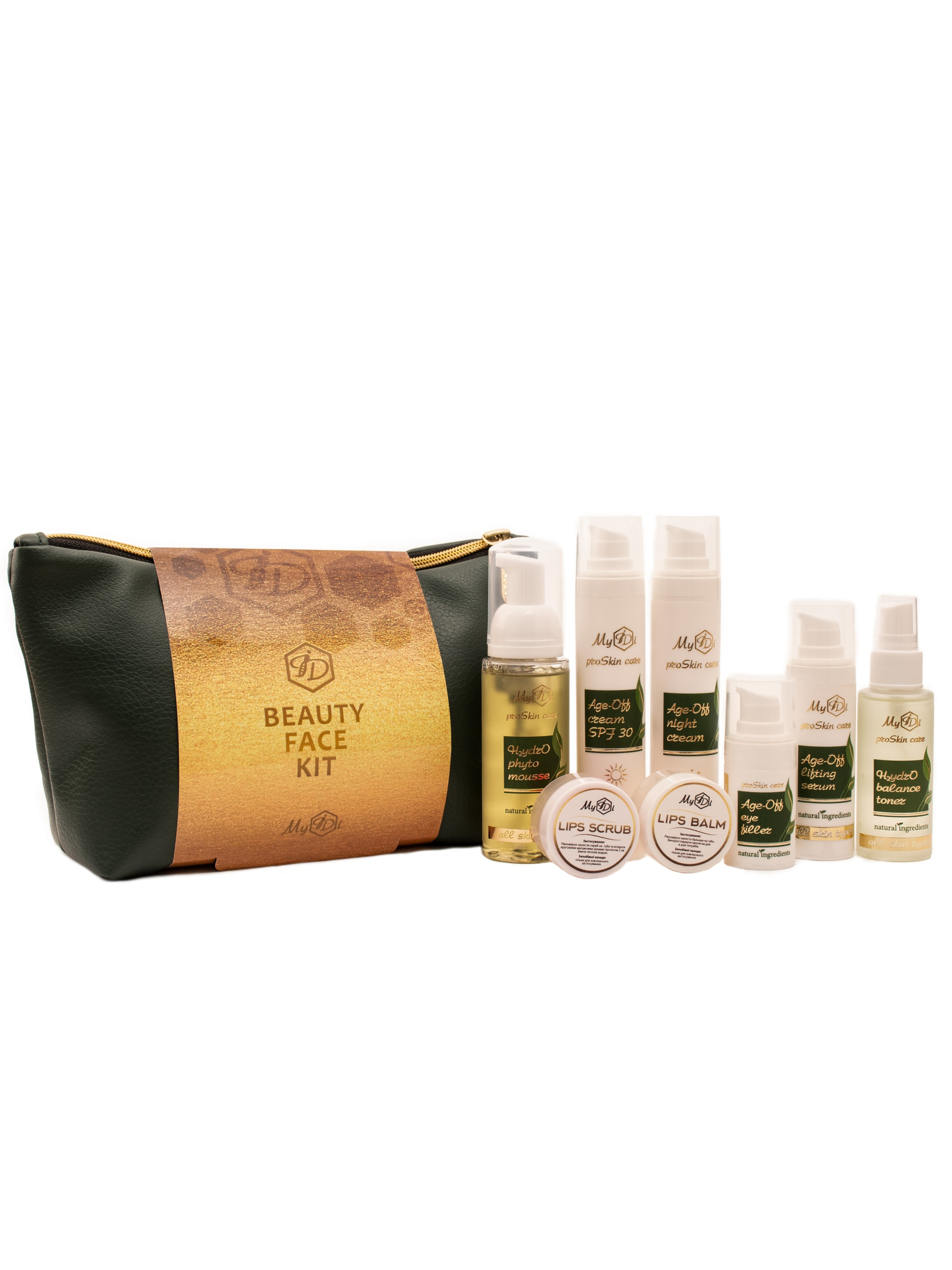 Склад набору: Очищюючий зволожуючий мус для всіх типів шкіри MyIDi H2ydrO phyto mousse 80 ml + Гідробаланс тонік для всіх типів шкіри MyIDi H2ydrO balance toner 50 ml + Антивікова ліфтинг сироватка MyIDi Age-off lifting serum 30 ml + Антивіковий філлер під очі MyIDi Age-Off eye filler 15 ml + Антивіковий денний крем MyIDi Age-Off cream SPF 30 50 ml + Антивіковий нічний крем MyIDi Age-Off night cream 50 ml + Бальзам для губ MyIDi Lips balm 10g + Cкраб для губ MyIDi Lips scrub 15 g Лінія Age-Off унікальні за ефективністю засоби космецевтики для догляду за віковою шкірою. Це ваша нова стратегія перемоги над ознаками старіння шкіри обличчя.