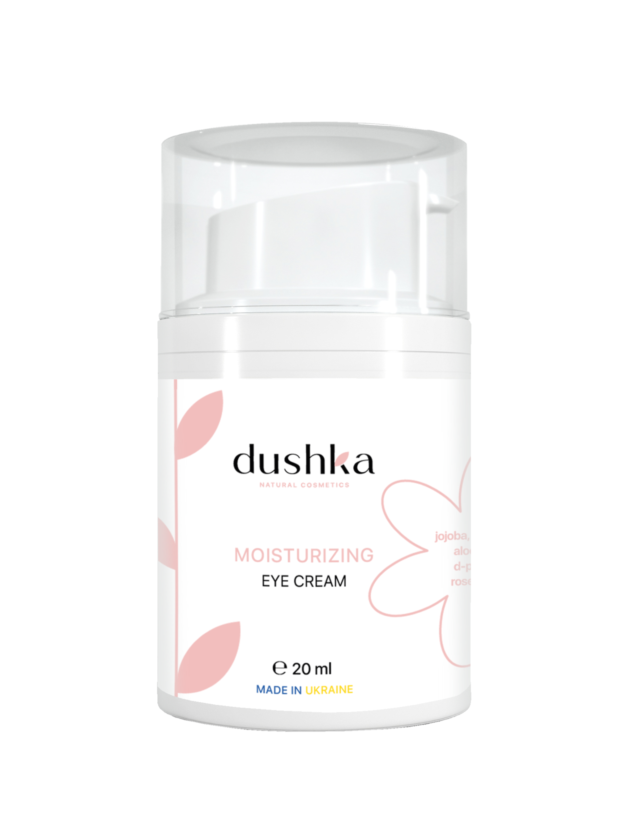 Брак вологи, дрібні зморшки, темні кола під очима – і ось твій погляд виглядає якось тьмяно. Виправимо цю ситуацію! Зволожувальний крем навколо очей Dushka на основі трояндової води з рослинними оліями, алое вера і натуральним полісахаридом допоможе тобі в цьому. - Гідролат троянди у складі чудово зволожує і тонізує ніжну й чутливу зону навколо очей. Він надає омолоджувальну дію, підвищує еластичність і пружність шкіри. - Натуральний полісахарид за своєю структурою – гідна альтернатива гіалуроновій кислоті. Він формує захисну полісахаридну плівку на поверхні шкіри, забезпечуючи тим самим не тільки зволоження, але й ефективне вирівнювання дрібних мімічних зморшок. -Олія жожоба й олія авокадо інтенсивно зволожують шкіру, перешкоджаючи зневодненню, пом'якшують і заспокоюють її, надають захист від негативного впливу зовнішніх факторів. -Олія лісового горіха прибирає мімічні зморшки навколо очей, вирівнює колір шкіри, прибираючи темні кола й судинний «малюнок», захищає від впливу вітру, морозу, сонця. - Гель алое вера глибоко проникає в шкіру, стимулюючи капілярний кровообіг, що позитивно позначається на виробленні колагену. - Д-пантенол заспокоює та захищає шкіру, прибирає ознаки старіння, вирівнює рельєф і колір шкіри. - Вітамін Е піклується про молодість і красу шкіри. Нехай твої очі сяють завжди, а погляд вражає в саме серце!