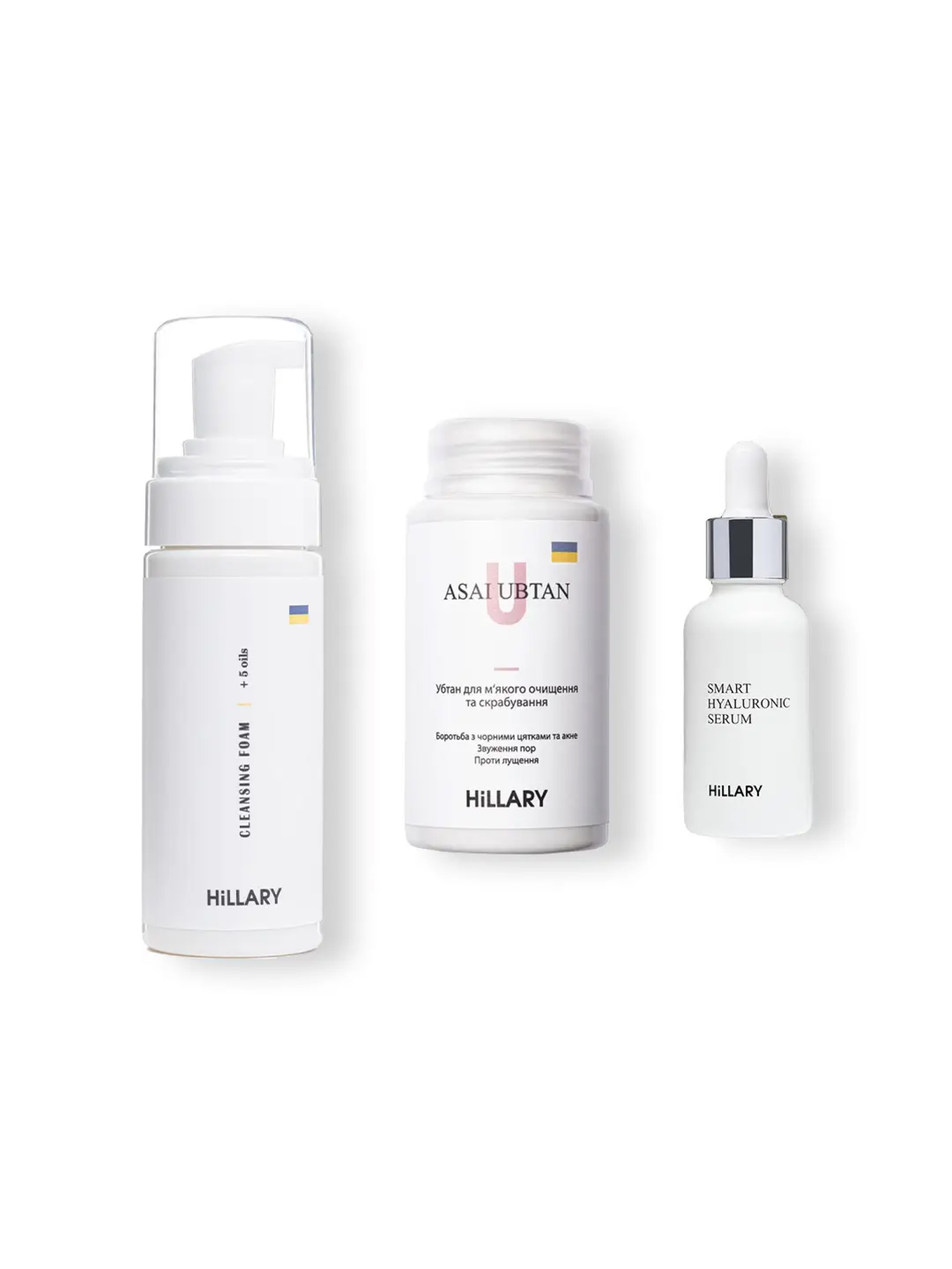 Доглядовий набір для нормального типу обличчя дбайливо очистить та зволожить шкіру завдяки органічним засобам, що входять до набору. Очищуюча пінка для нормальної шкіри з 5-ма оліями із сумішшю 5 олій створює речовину, подібну до ліпідного прошарку, що скріплює корнеоцити – клітини, що утворюють ороговілий шар шкіри, не шкодить мікробіому, підсилює ліпідобар’єр та зберігає природний Ph-баланс шкіри, ретельно розчиняє та видаляє навіть найстійкіший макіяж, надає шкірі обличчя приємного відтінку та вирівнює тон. Убтан для м'якого очищення і скрабування ASAI UBTAN глибоко очищає пори, усуває запальний процес, зволожує, не сушить шкіру, ніжно і дбайливо очищає її, не викликає подразнень чи будь-яких неприємних відчуттів, сприяє зменшенню постакне і пігментації а також не порушує мікробіом шкіри. А гіалуронова сироватка зволожує глибокі шари шкіри, попереджає старіння і відроджує молодість шкіри, відновлює і захищає, утримує вологу всередині шкіри, помітно скорочує зморшки, підтягує шкіру і надає їй сяйва. Під час масажу, властивості гіалуронової сироватки значно підсилюються. До набору входять: Очищуюча пінка для нормальної шкіри Hillary Cleansing Foam + 5 oils, 150 мл; Убтан для м'якого очищення і скрабування Hillary ASAI UBTAN, 100 г; Гіалуронова сироватка Hillary Smart Hyaluronic, 30 мл. Спосіб застосування: Невелику кількість пінки нанесіть на вологе обличчя легкими масажним рухами, ретельно промийте обличчя водою. Невелику кількість порошку убтану насипте у долоню, додайте трохи води і розведіть до пастоподібного стану. Нанесіть на вологу шкіру, обережно розподіліть по всьому обличчю, помасажуйте і змийте. Можна застосовувати двічі-тричі на тиждень. Нанесіть масажними рухами невелику кількість сироватки на чисту, вологу шкіру обличчя, шию і зону декольте. Застереження: Натуральна косметика не є гіпоалергенною. За 24 години до застосування проведіть алергопробу на згині ліктя.